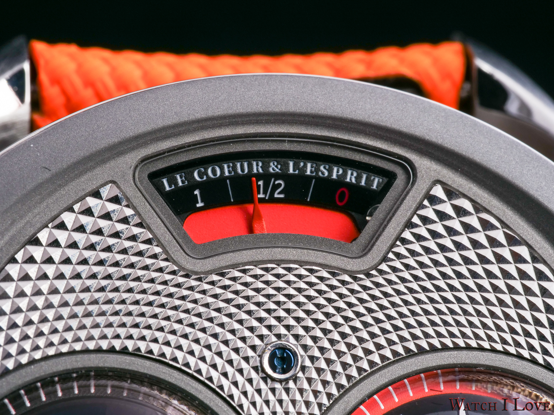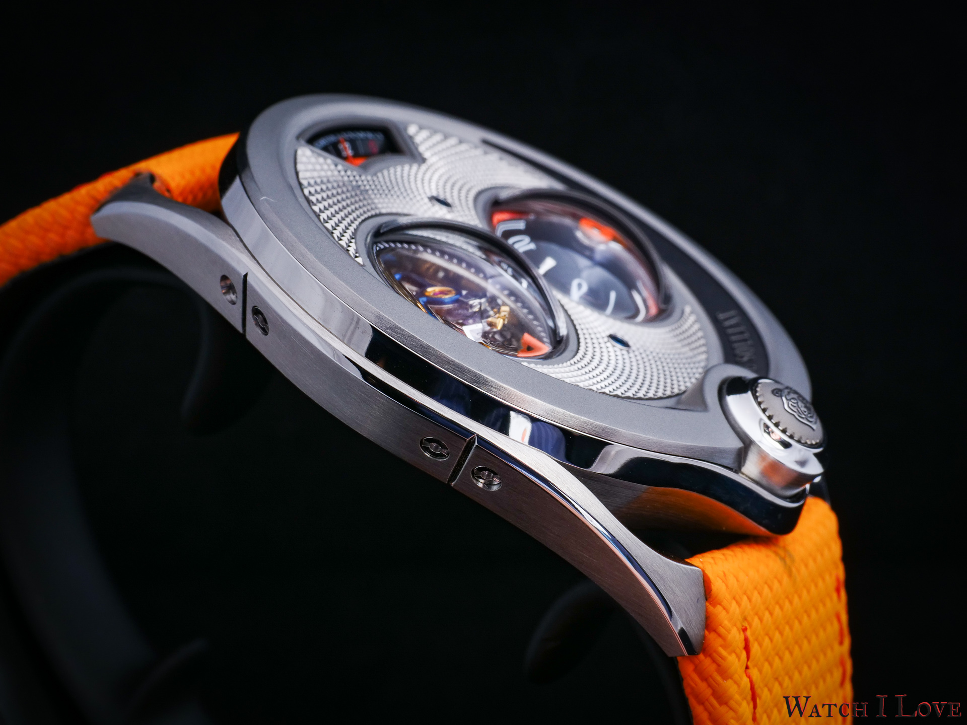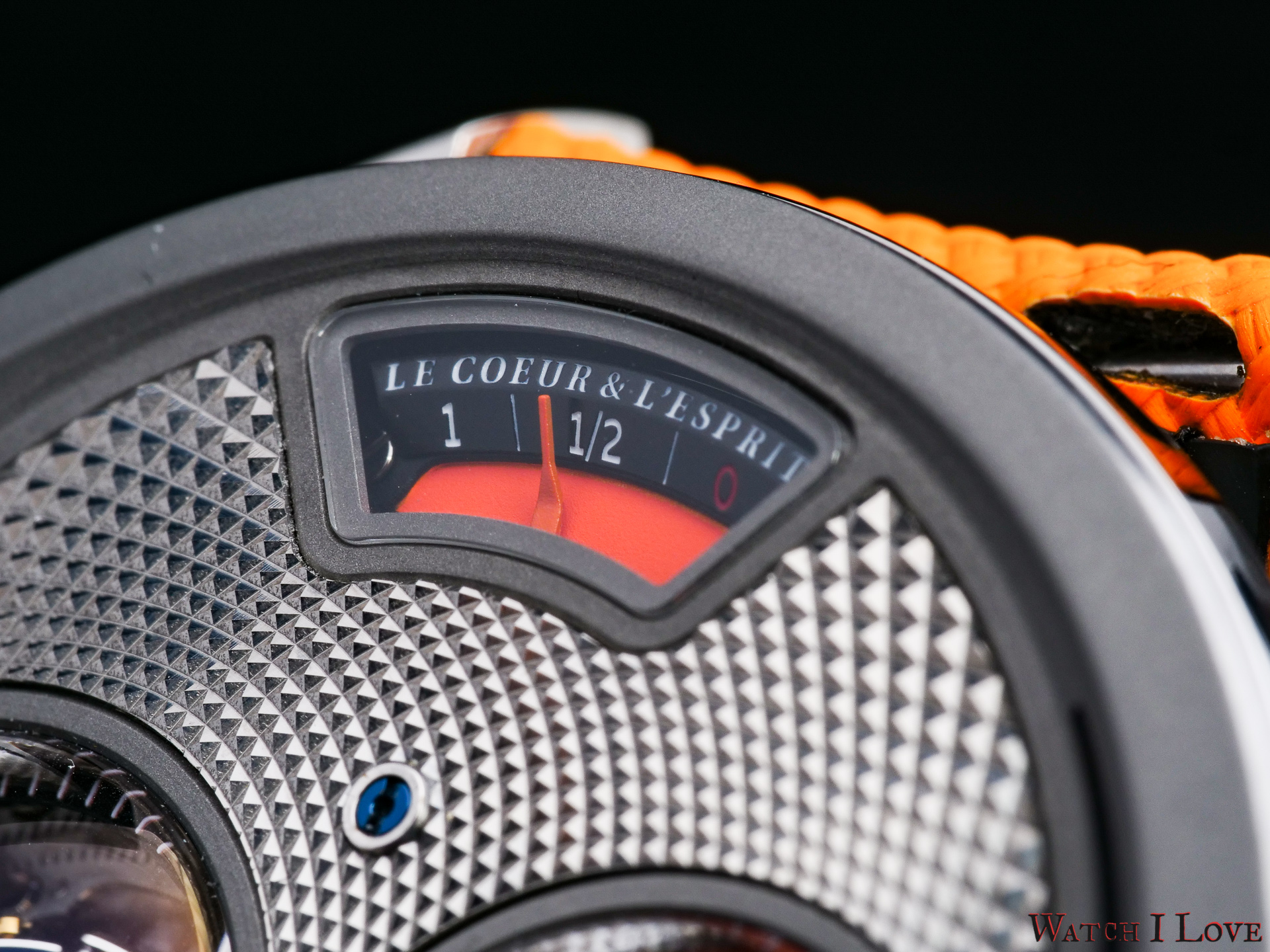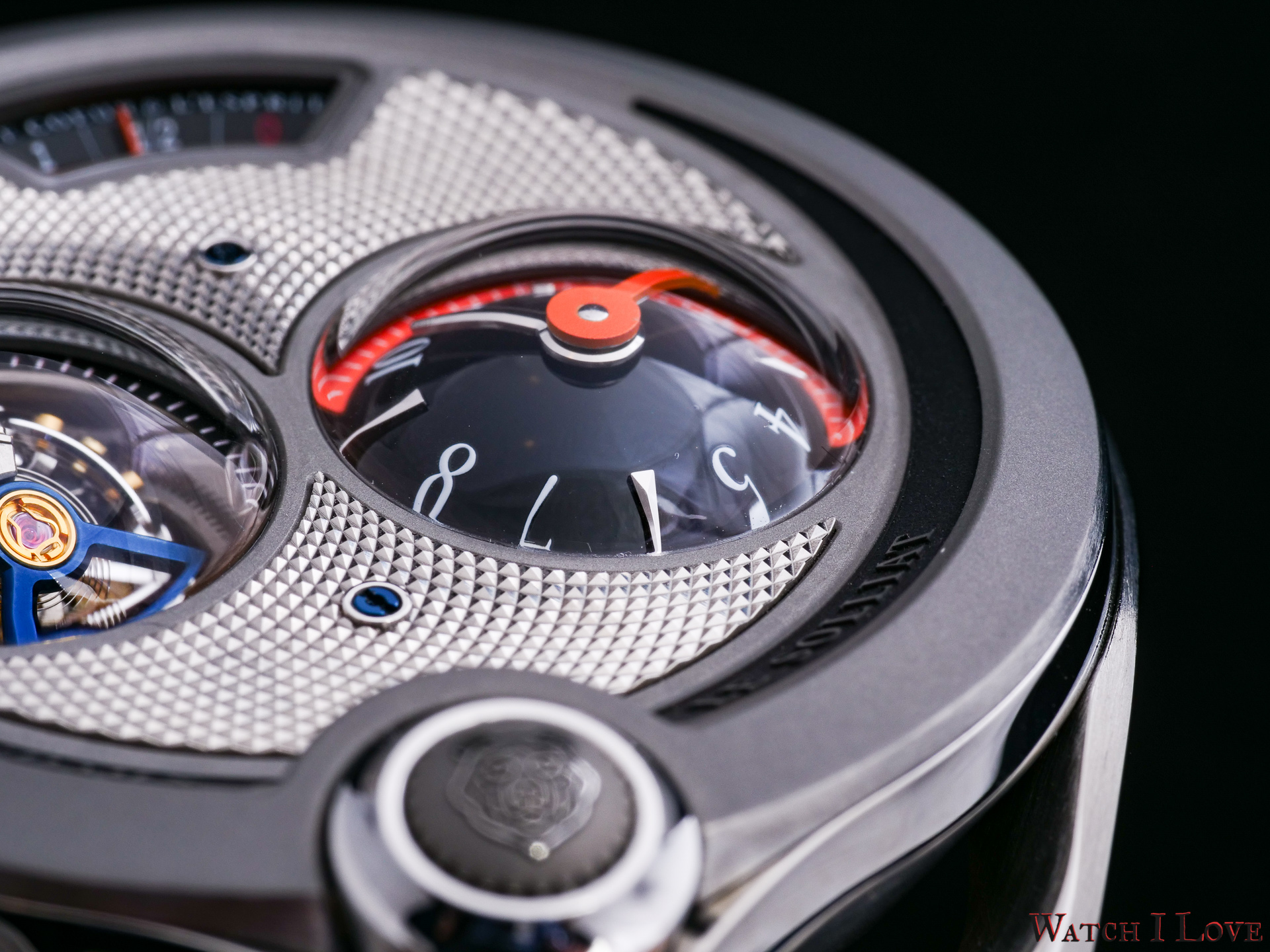 DC6 Half Hunter is an original concept. The unusual watch’s layout displays all the functions on top. I find the “magic crown” a cool gimmick – it looks great and it feels great. The automotive-inspired power reserve reminds me of the fuel gauges of old cars. The view of the tourbillon makes a nice balance with the domed time display.