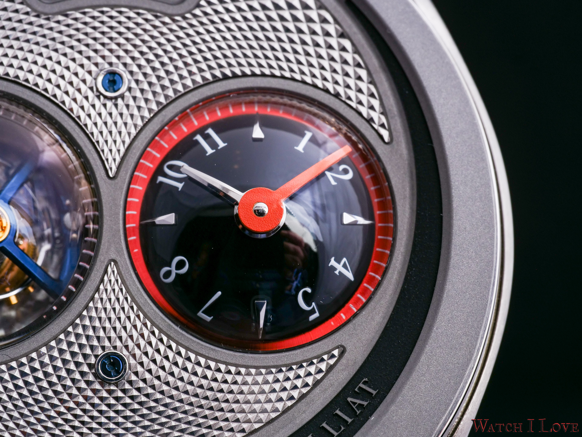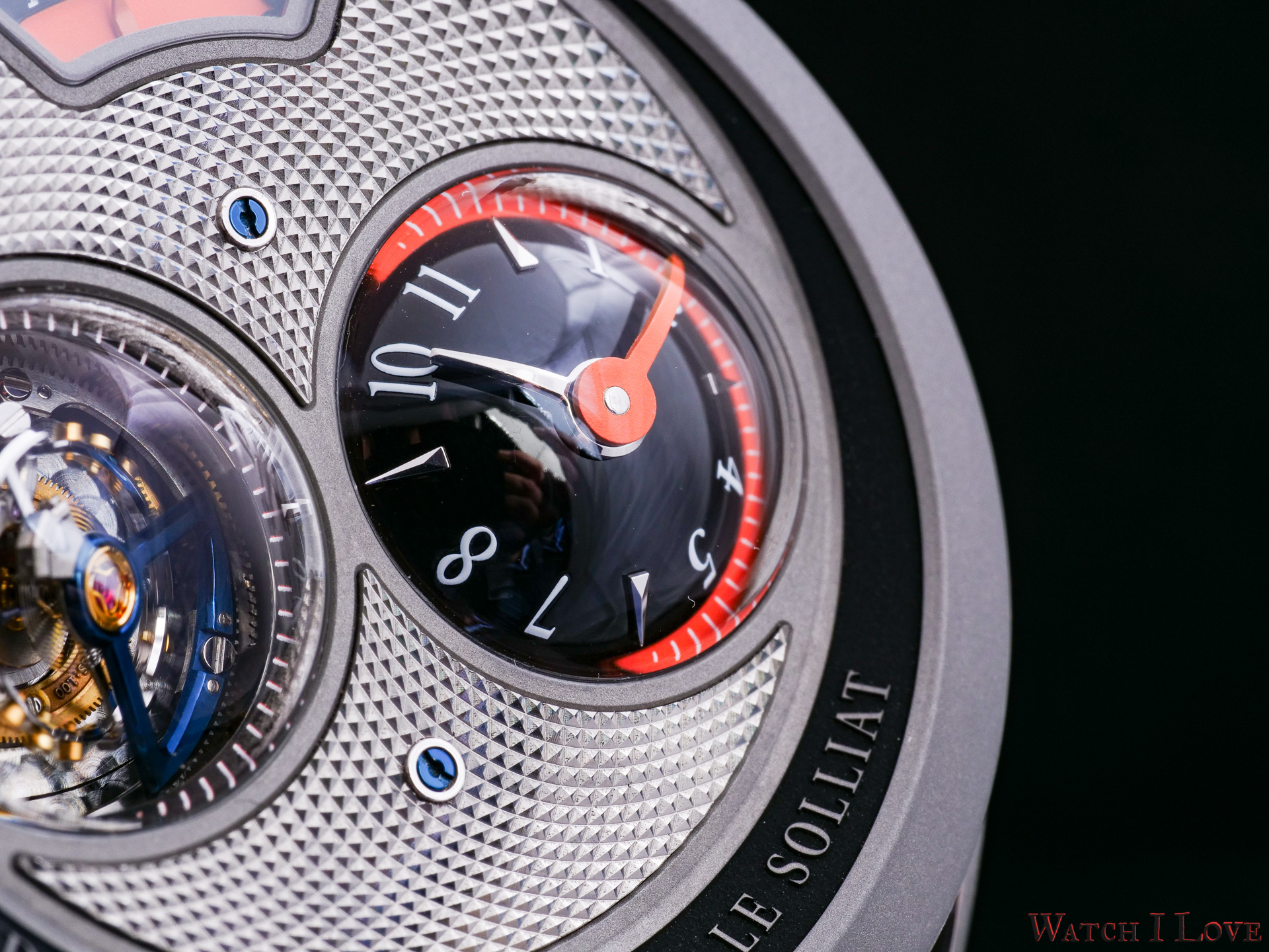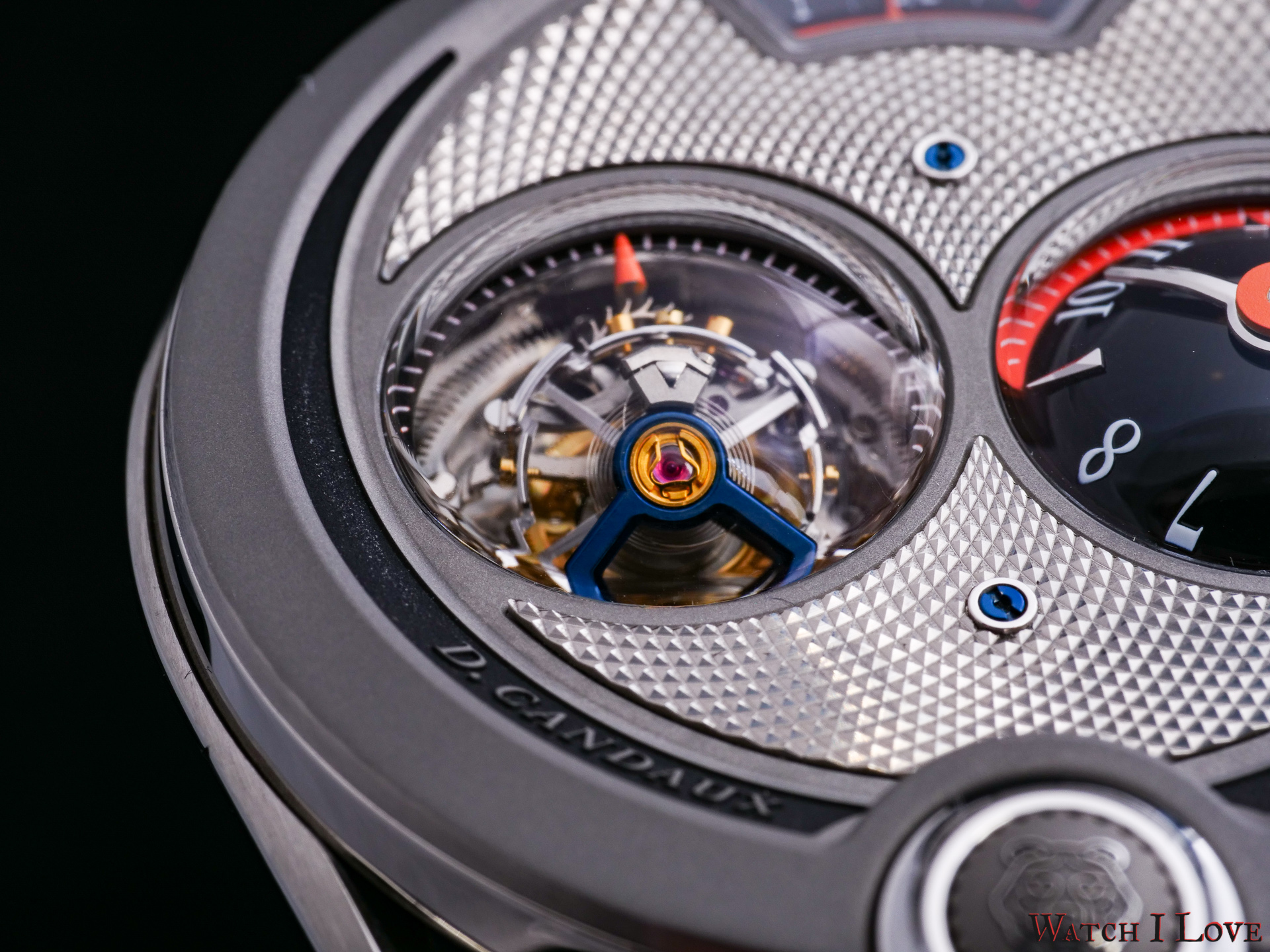 – Materials: Grade 5 titanium plate and bridges. Untreated titanium and blued titanium for the tourbillon cage