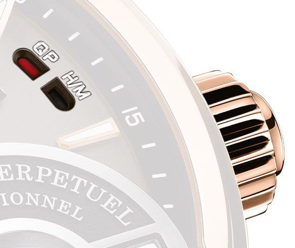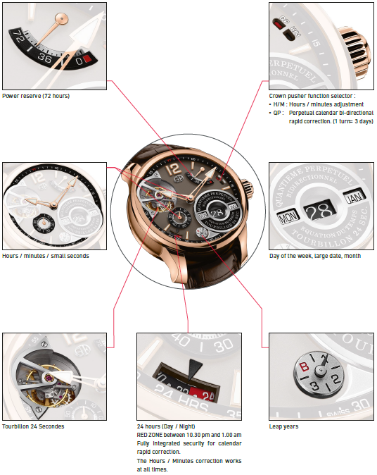 The dial side of the QP à Équation indicates leap years, the 24 hours of the day and night, the day of the week, the large date, the month, the hours, the minutes and the seconds, as well as the 72-hour chronometric power reserve.