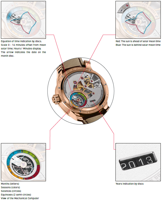 On the movement side, this timepiece displays the Equation of Time with the months, seasons, solstices and equinoxes, as well as the calendar year.