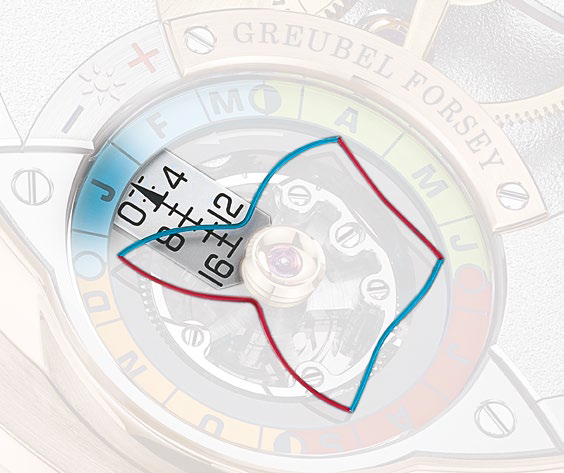 To meet this technical challenge Greubel Forsey invented a sophisticated coding mechanism: the patented Mechanical Computer. A stack of cams with movable fingers shift the indications on the dial and caseback of the timepiece and the complete mechanism is fully integrated within the movement. The month’s cam changes the month, displayed in a window on the front and also moves the Equation of Time disc on the back. The years’ cam controls the leap year indication on the front and also the millesime and seasons on the back. The development of this coding device not only overturns the conventional way of setting the indications but also displays them simultaneously on both dial and caseback.