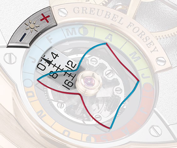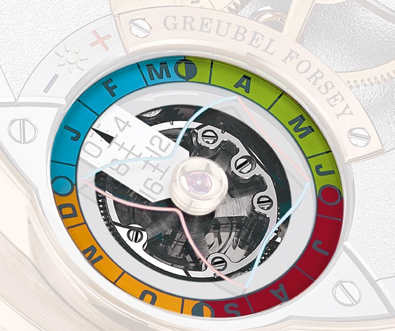 Greubel Forsey continues to put time to better service; where the caseback of the timepiece is not just there to showcase fine hand finishing, but also provides a new way to tell the time. The most frequently sought calendar information, namely the day, date and month, is displayed on the inline main dial display. Information that is less often required is visible on the back of the timepiece. Thus the two sides show indications that you need to know regularly on the front, and indications accessed less frequently on the back.
