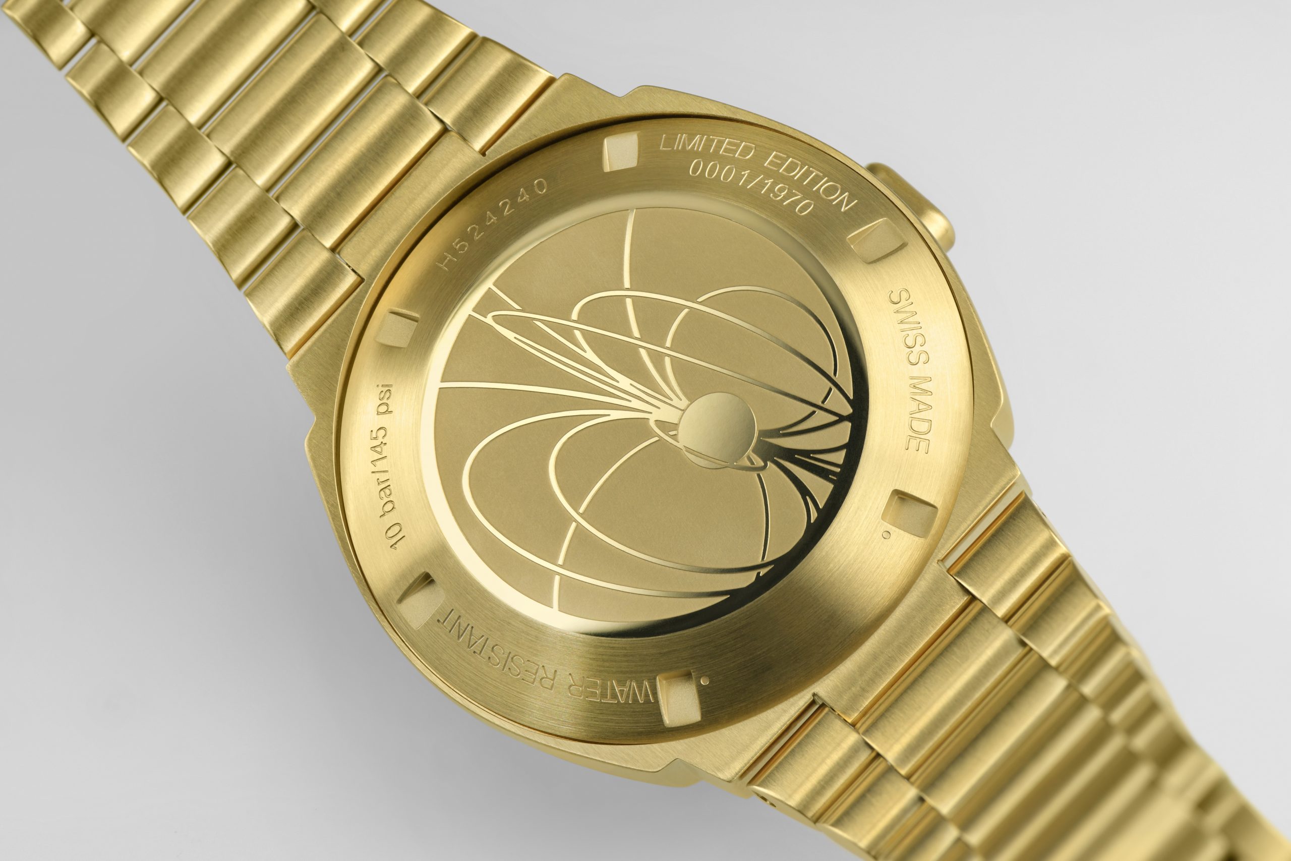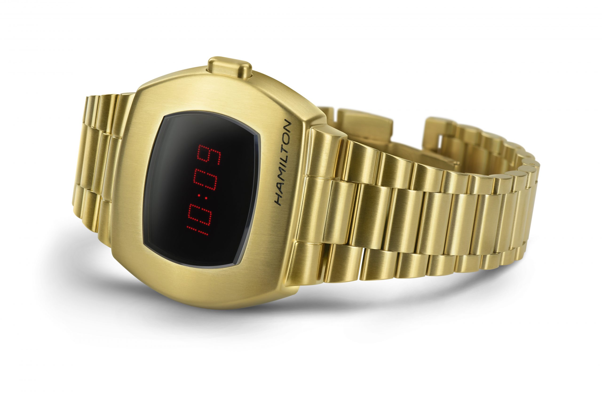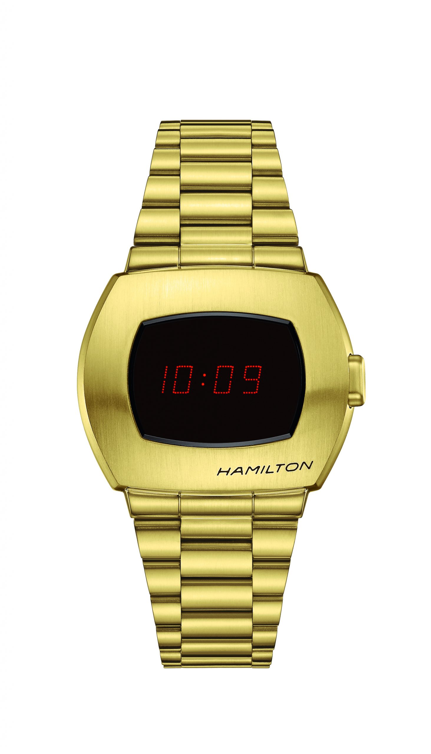 With the new Hamilton PSR, we’re powering up this icon of 1970s style and technology once more. There are two versions of the PSR to choose from: one in stainless steel, and a version in stainless steel coated with yellow gold PVD that’s limited to 1,970 models.