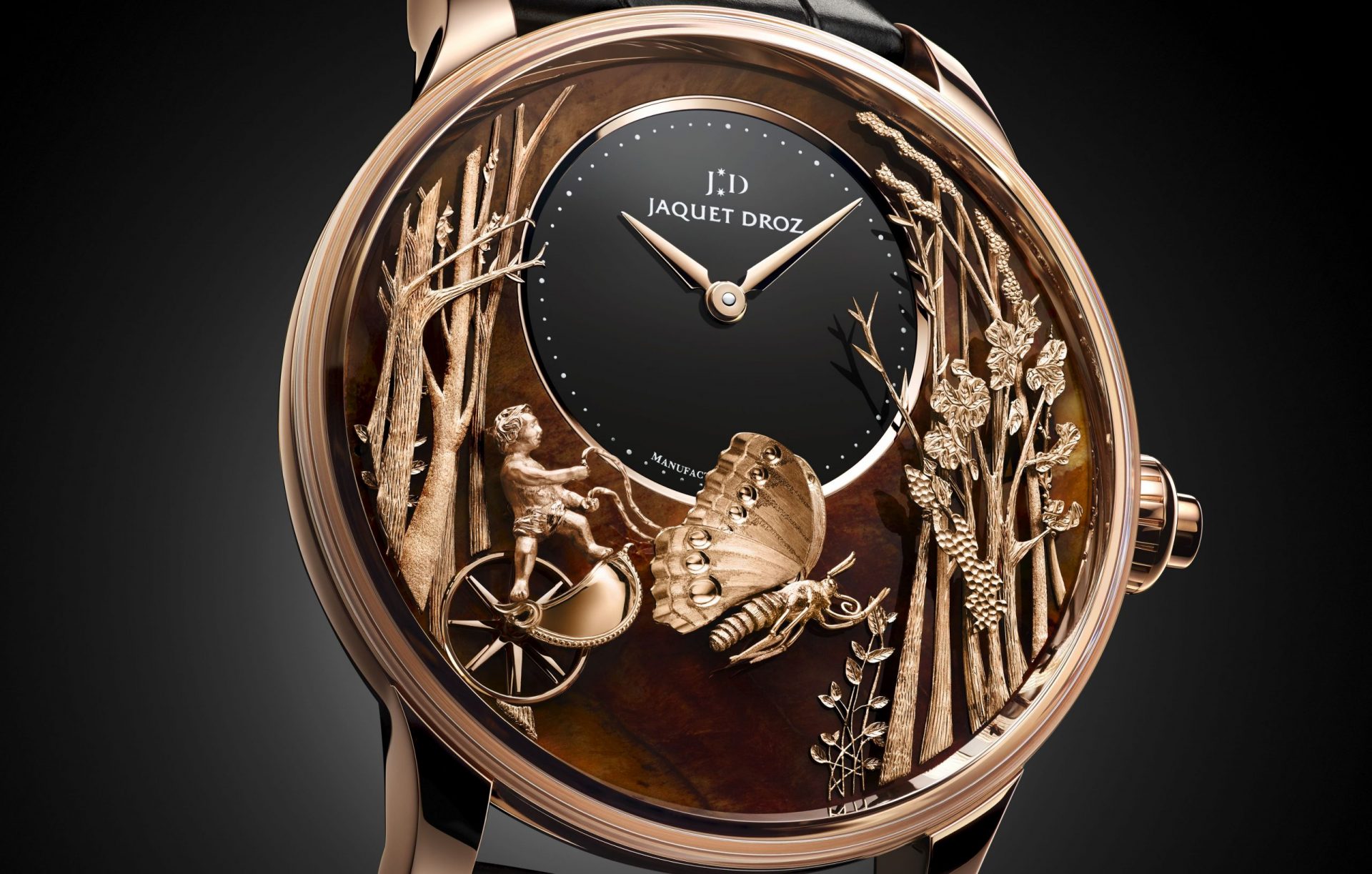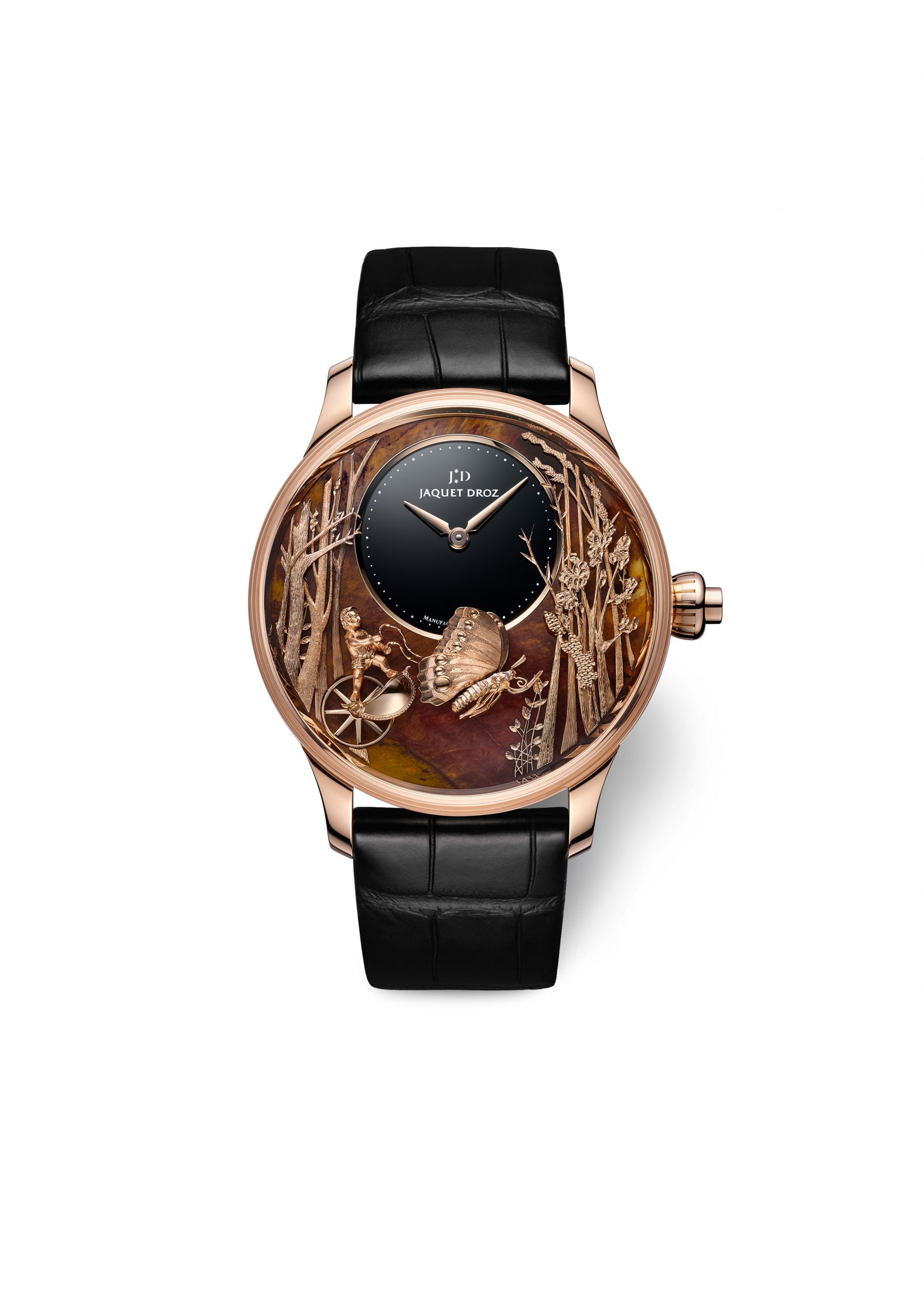 This new rendition magnifies the Cherub and the Butterfly, a classic metaphor for labours of love. The chariot symbolizes victory and the butterfly represents Cupid. Like the chariot, the butterfly comprises several dozen stationary and moving appliqués hand-etched by Jaquet Droz artisan jewellers. The scene unfolds on a veritable stage of nature with a set that actually rises up all around the dial. Multiple levels lend the piece a unique depth of perspective that invites the gaze to wander, drift and stray. A striking realism takes shape, proliferating with details that bring the scene to life.