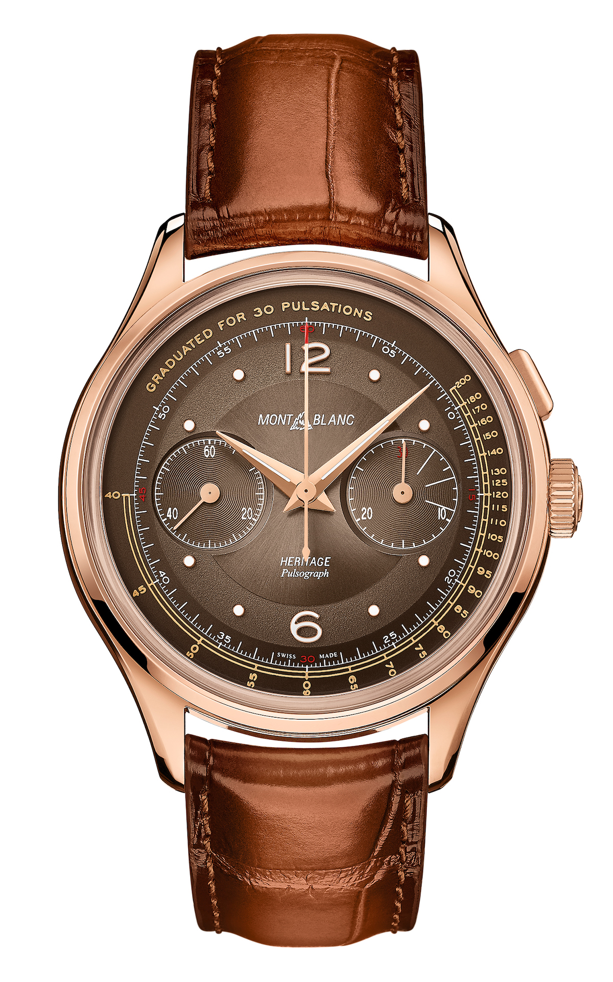 The highlight of the Maison’s product line is the Heritage Pulsograph Limited Edition 100, a timepiece inspired by what collectors call the ‘doctor’s watches’, that were used by doctors in the past to check a patient’s heart rate. Following the launch of the Montblanc Heritage Pulsograph Limited Edition with a salmon-coloured dial, the Maison is now unveiling a brand-new model in an 18 K rose gold 40 mm case with a distinctive smoked tobacco-brown dial and matching Sfumato alligator strap, reinforcing the trendy vintage style.