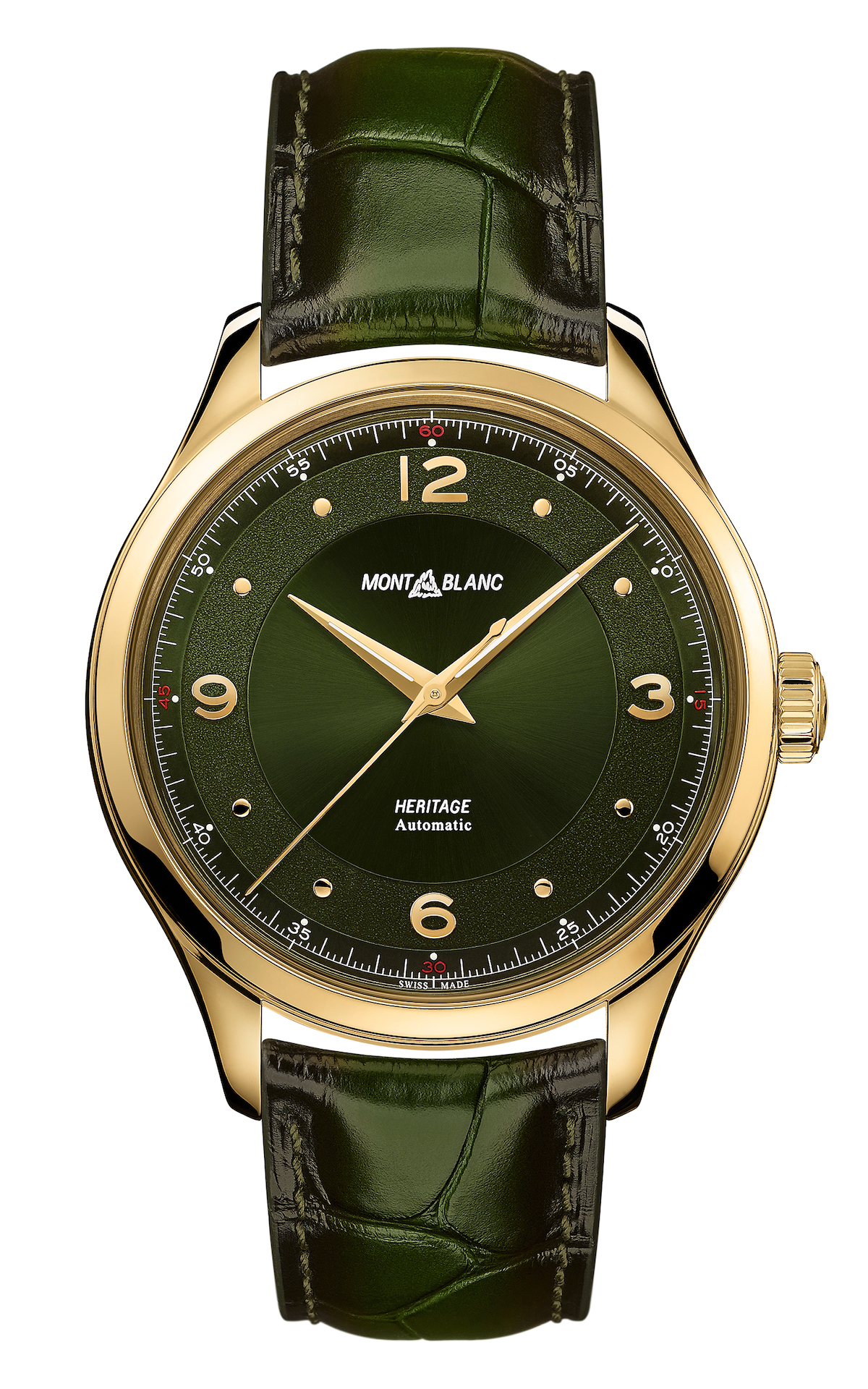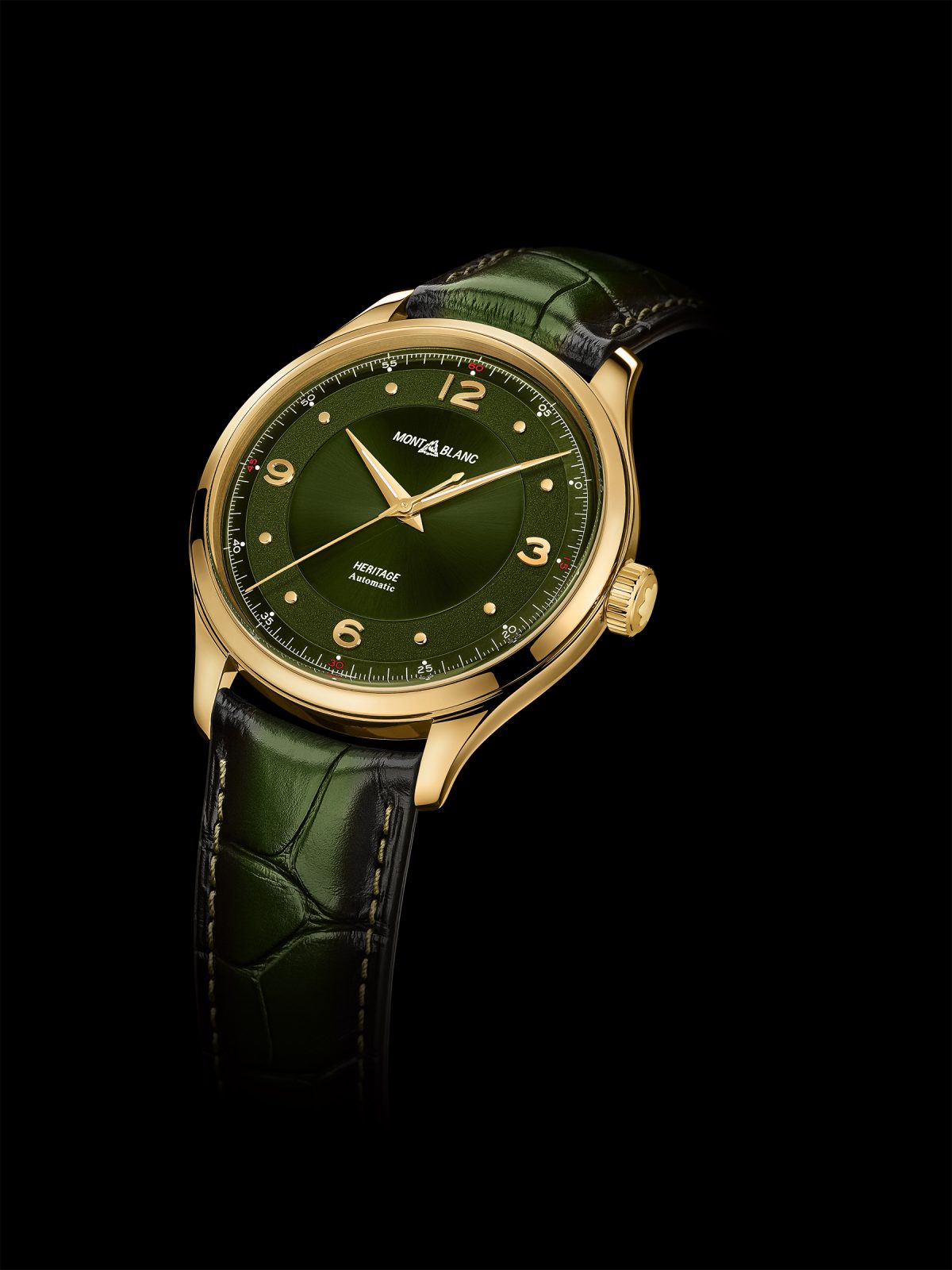 The new Montblanc Heritage Automatic comes in 18 K yellow gold with a brand-new lacquered British-racing-green dial and matching Sfumato alligator strap for a vintage look.