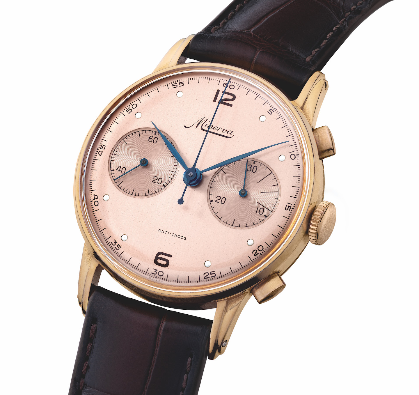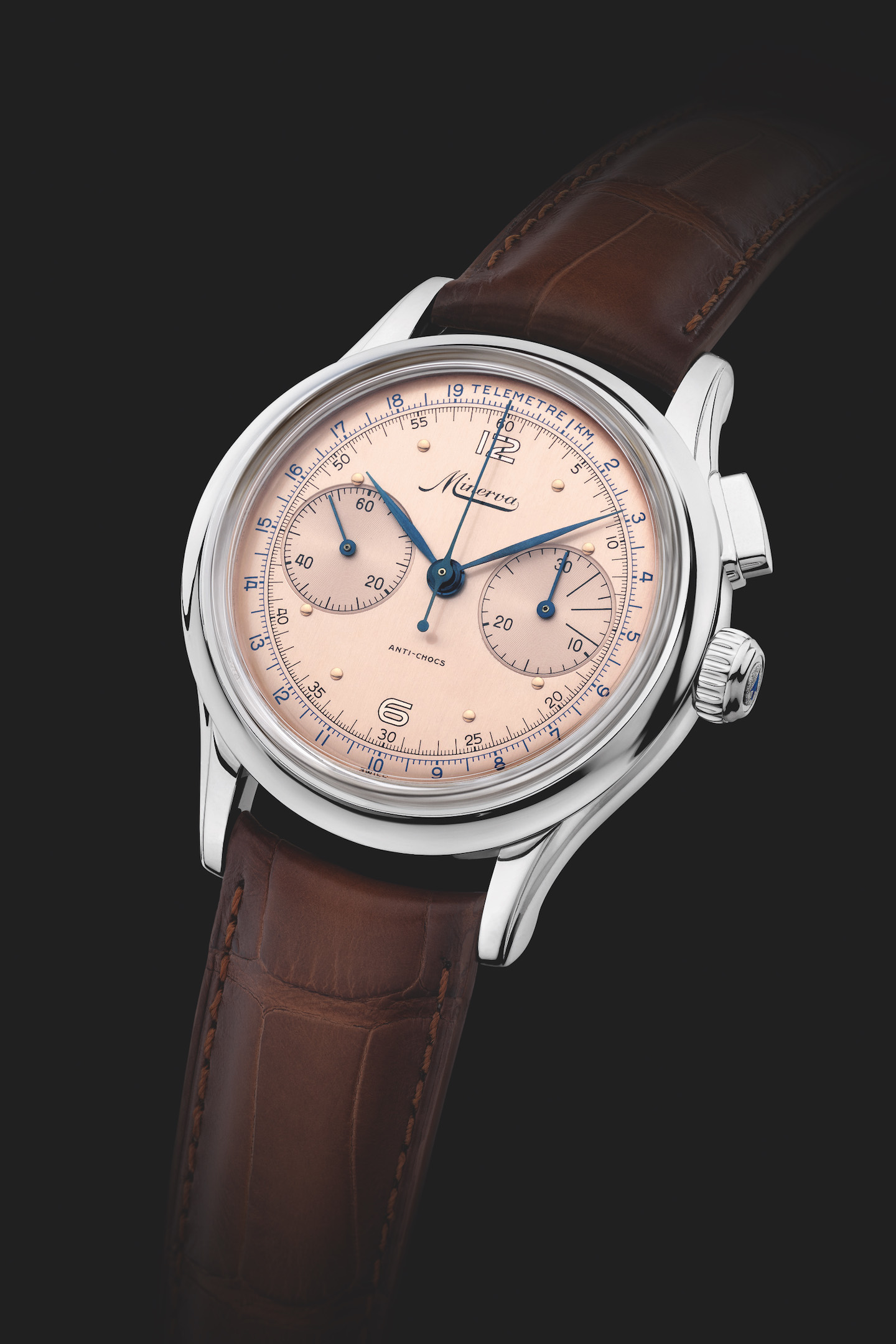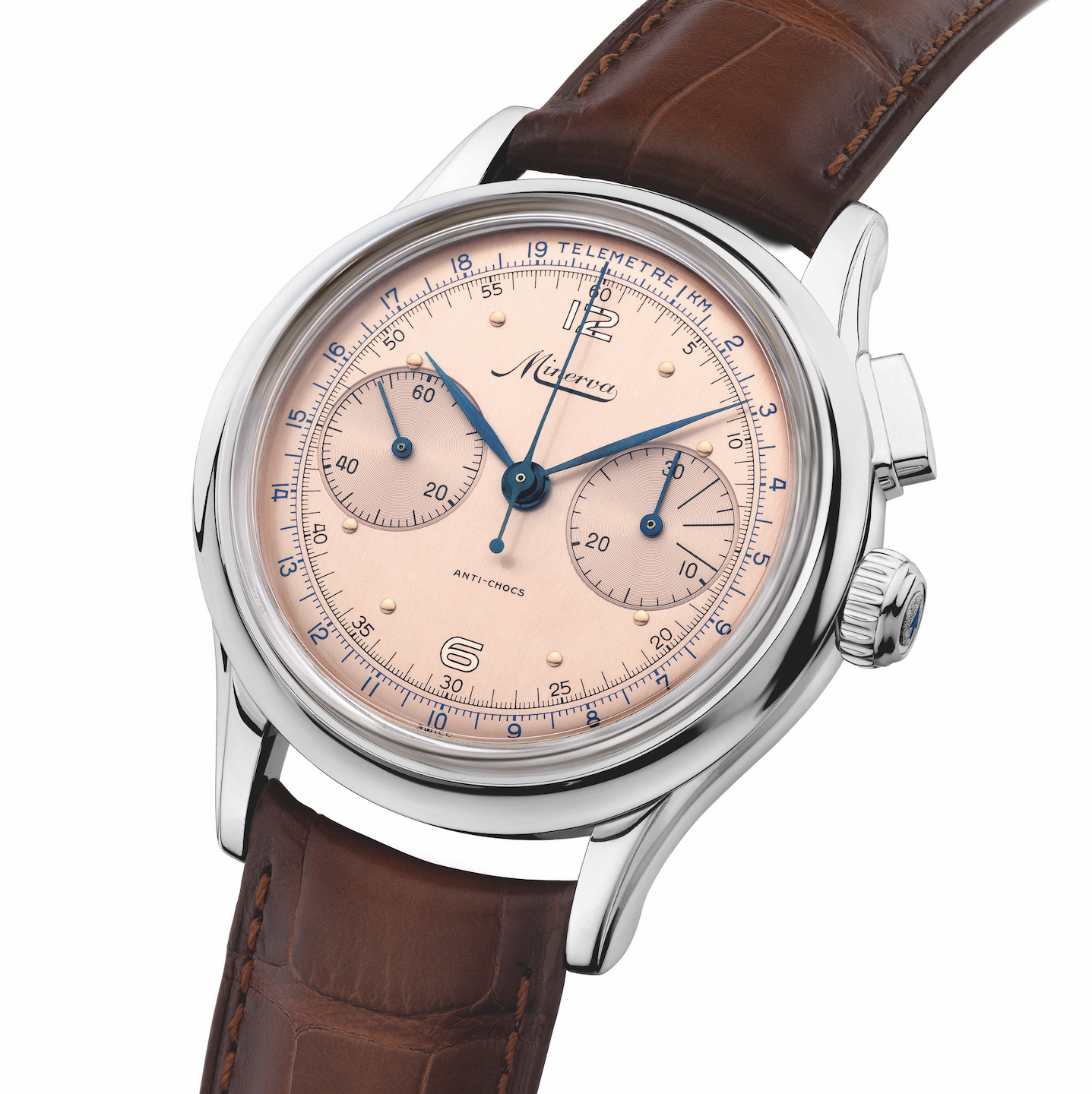 The Heritage Monopusher Chronograph is one of the technical pillars of Minerva savoir-faire, offering an accessibly-priced model at the centre of the collection. This timepiece features the latest chronograph design with a domed, salmon-coloured dial with black rhodium-coated Arabic numerals and dots for indexes. Other features include a blue rack minuterie, black rhodium- coated luminescent dauphine hands for the hours and minutes, and contrasting blued steel baton
