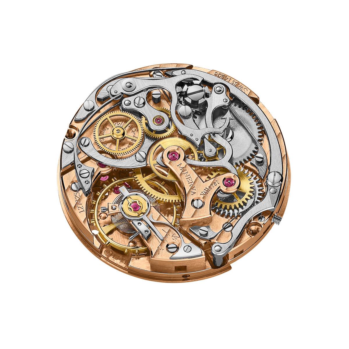 The refined tobacco-brown dial features several vintage design codes from the 1940s and 50s: a domed smoked lacquered dial with “grainé” hour ring and sunray finishes, 18 K rose gold-coated luminescent Arabic numerals and dots for indexes, 18 K rose gold-coated luminescent dauphine hour and minute hands, 18 K rose gold baton-shaped hands for the seconds and the chronograph indications, rack minuterie, and old school international payphone indications of 3, 6 and 9 minutes on the chronograph’s minutes counter.