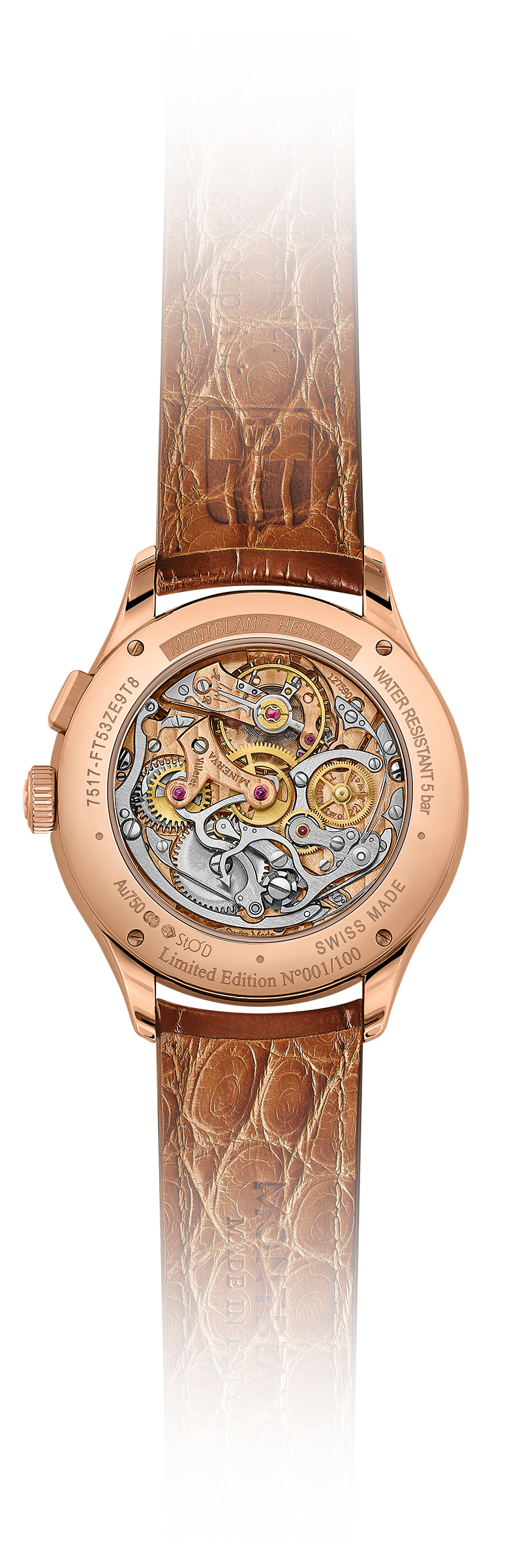 On the case back, the sapphire crystal reveals the high level of hand-finishing of the Montblanc Manufacture monopusher chronograph Calibre MB M13.21. This high-end movement is composed of a large balance wheel with 18 screws that beats at the traditional frequency of 18,000 A/H, a column wheel and horizontal coupling, the iconic V-shaped chronograph bridge whose designed was patented in 1912, and the emblematic hand-decorated Minerva arrow. To match the 18 K rose gold case and the tobacco-brown dial, the calibre MB M13.21 features rose gold-coated plate and bridges.