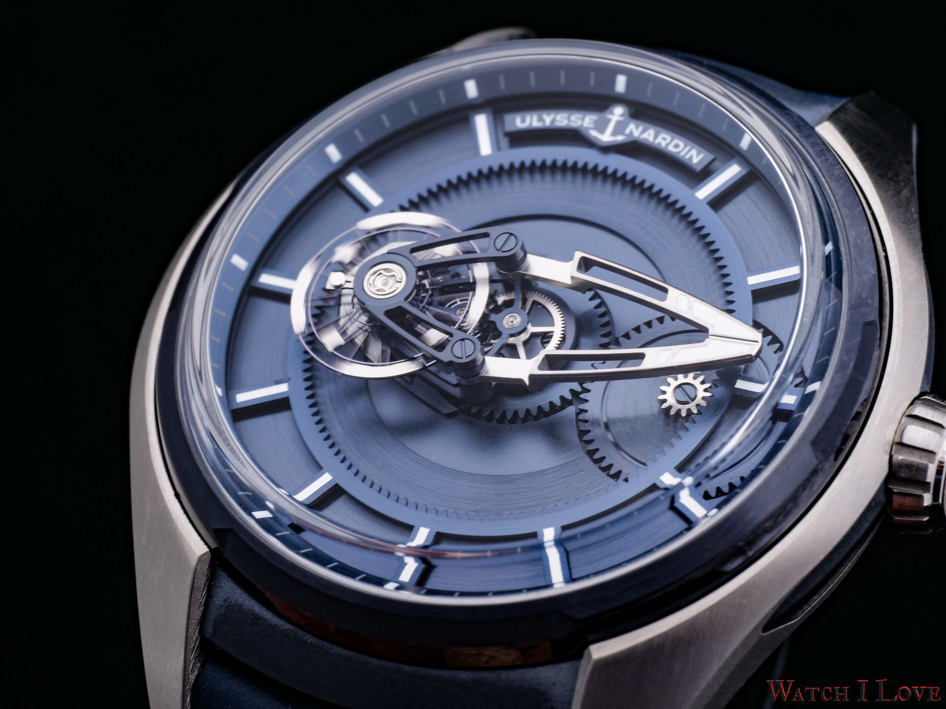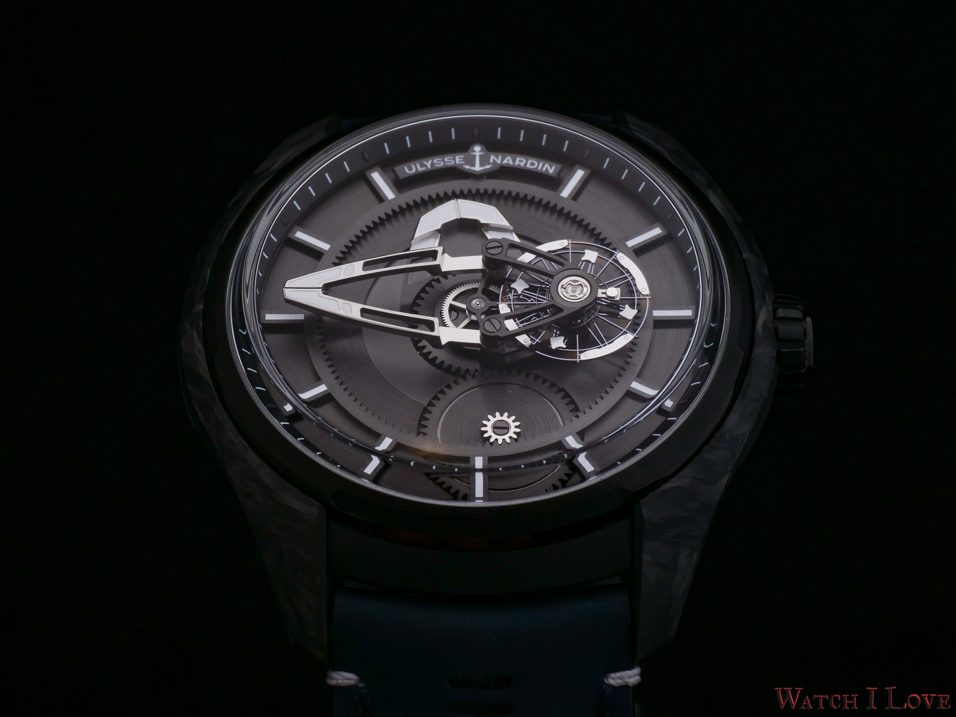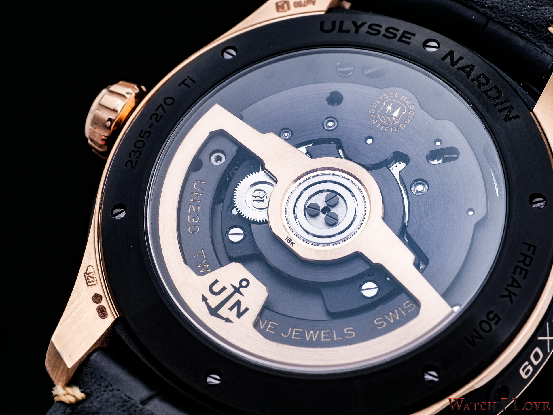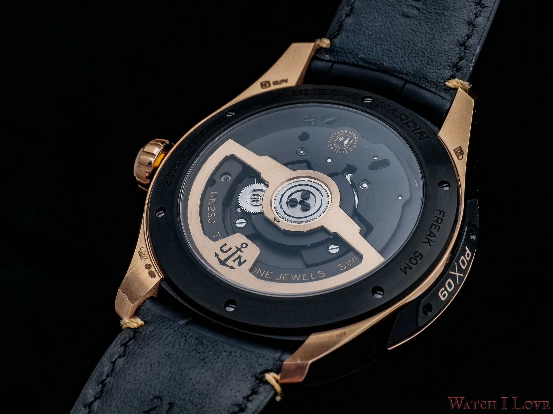 Ulysse Nardin Freak X is powered by the Calibre UN-230. The most spectacular detail is, of course, the top carousel. The show is impressive not just visual but also technical. The Calibre Un-230 uses a silicon balance wheel. The hi-tech gimmick uses self-regulating micro-blades. The balance wheel uses the natural air resistance to stabilise its amplitude and increase accuracy.