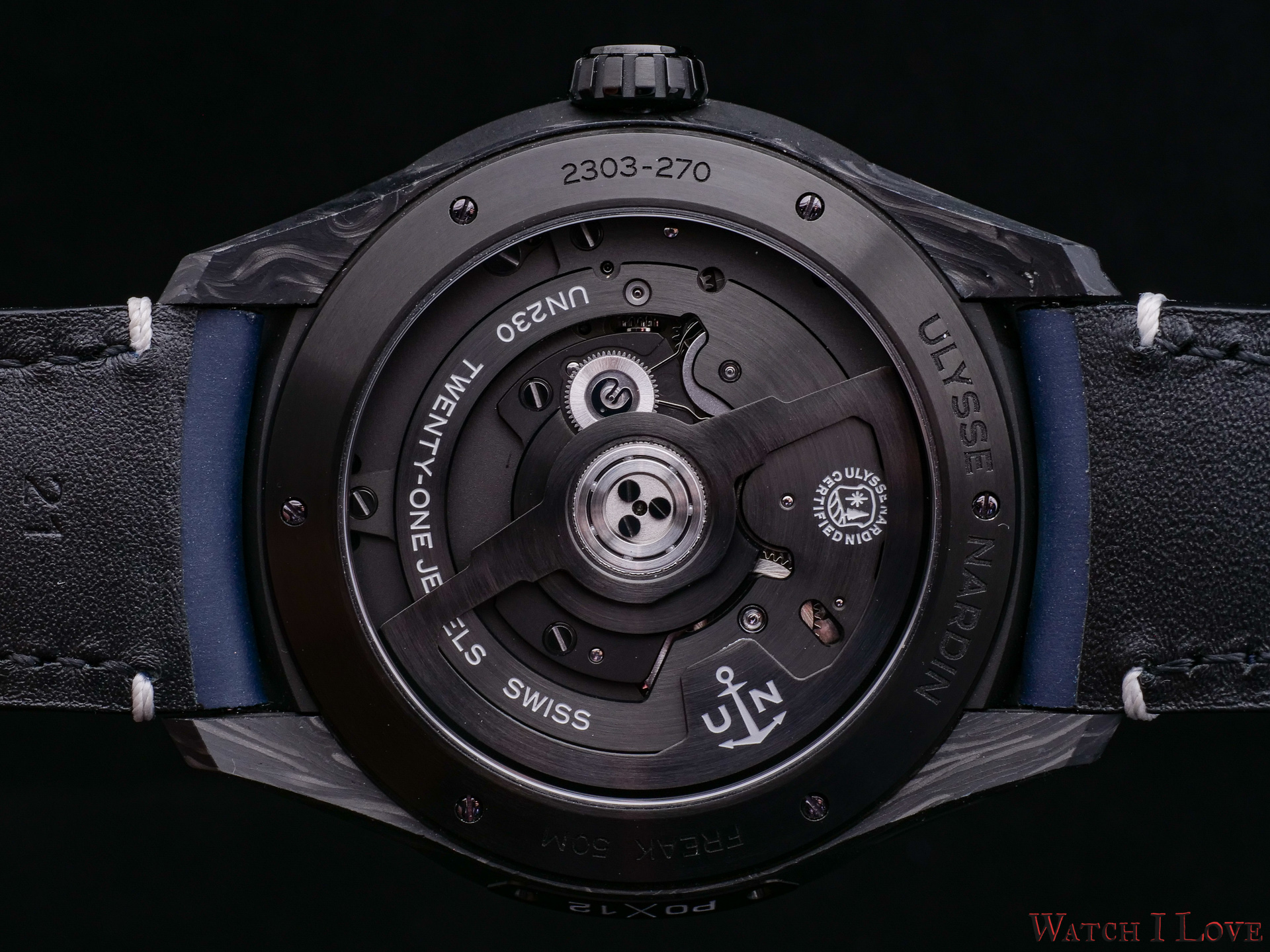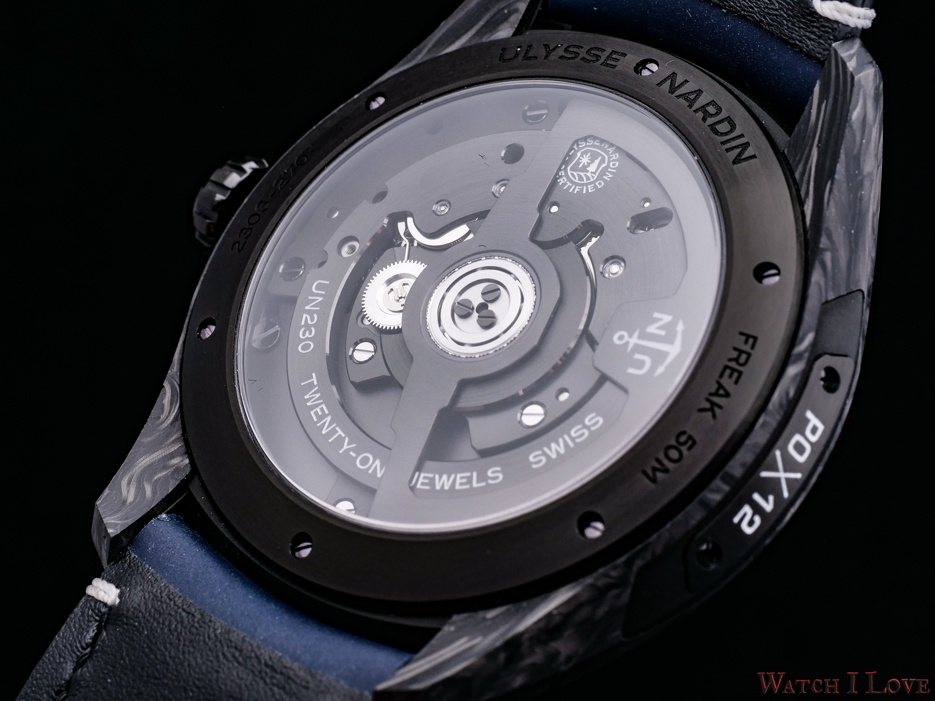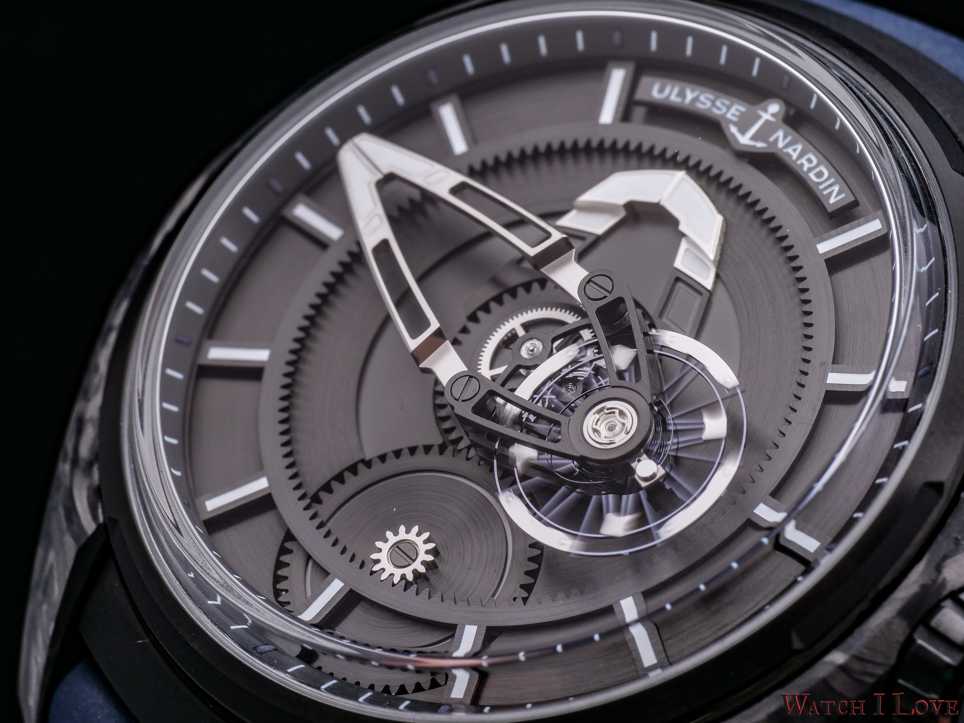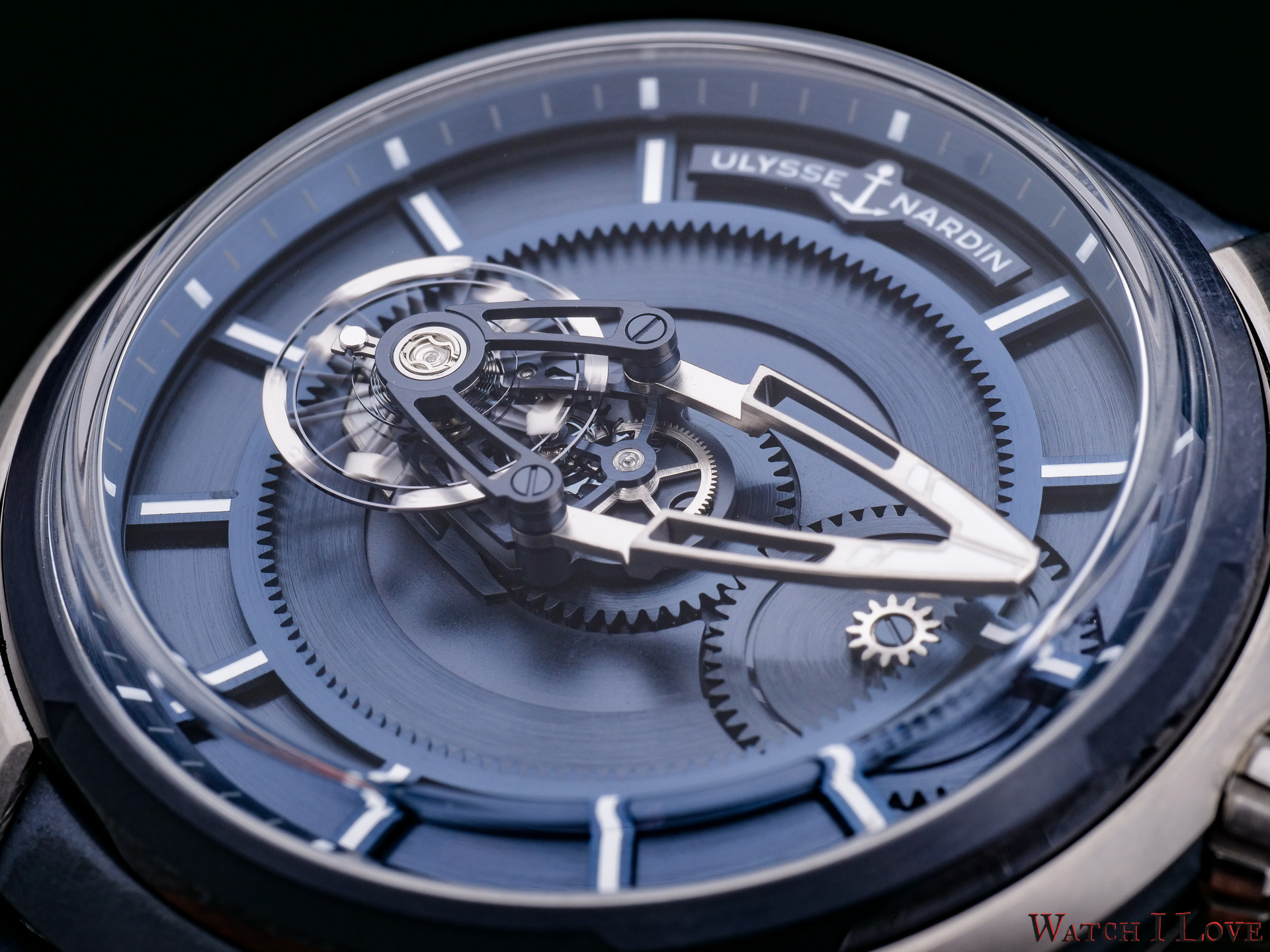 Ulysse Nardin Freak X is powered by the Calibre UN-230. The most spectacular detail is, of course, the top carousel. The show is impressive not just visual but also technical. The Calibre Un-230 uses a silicon balance wheel. The hi-tech gimmick uses self-regulating micro-blades. The balance wheel uses the natural air resistance to stabilise its amplitude and increase accuracy.