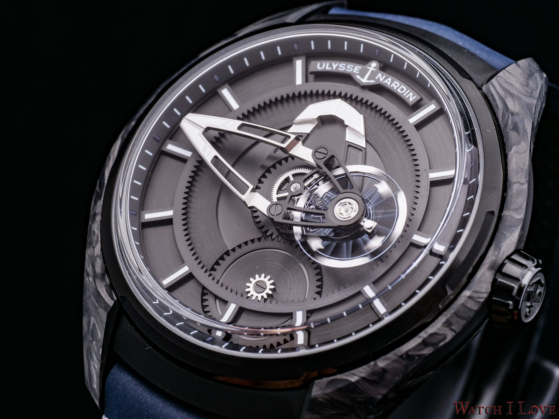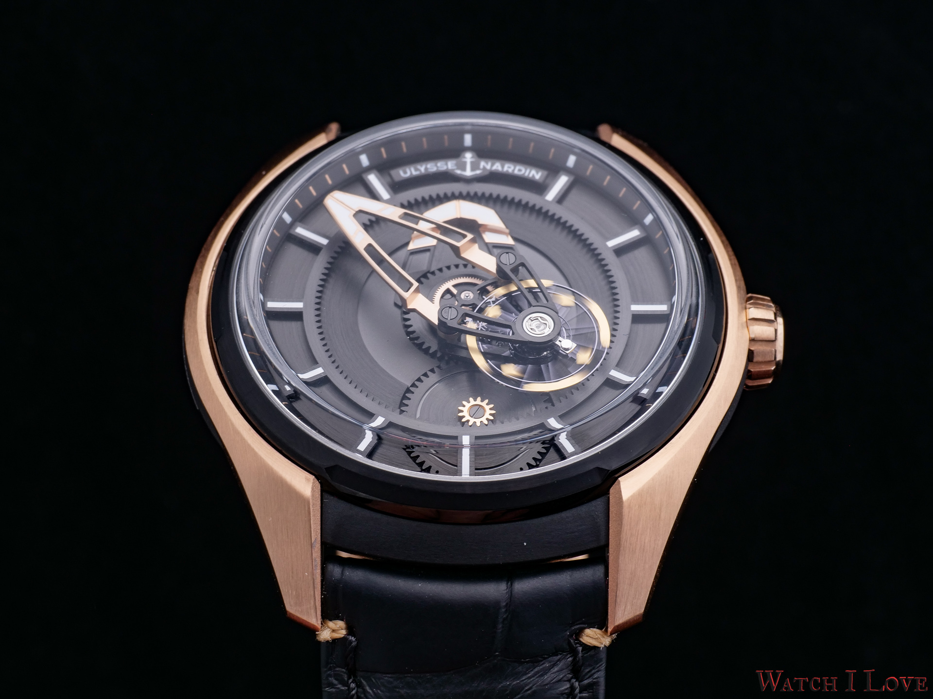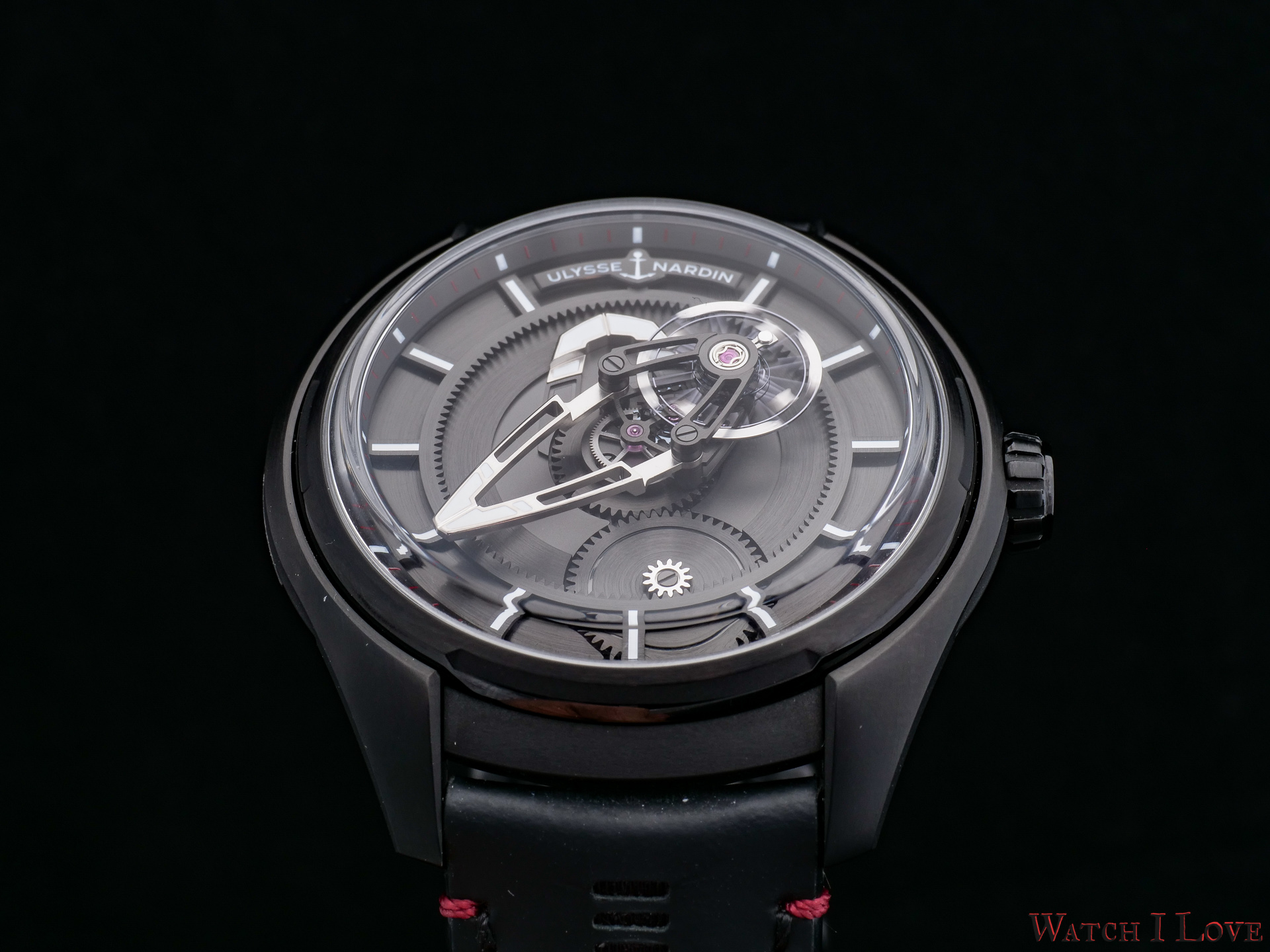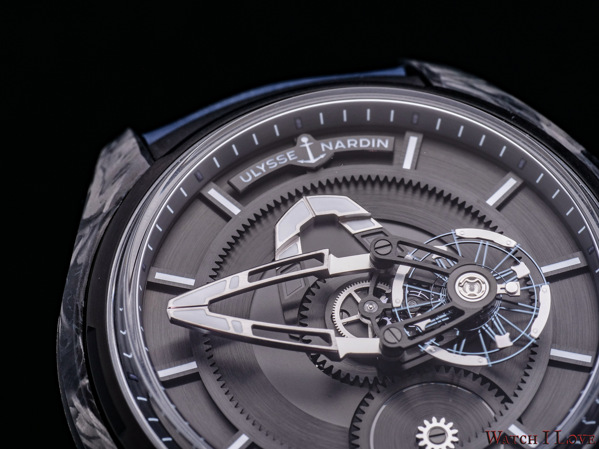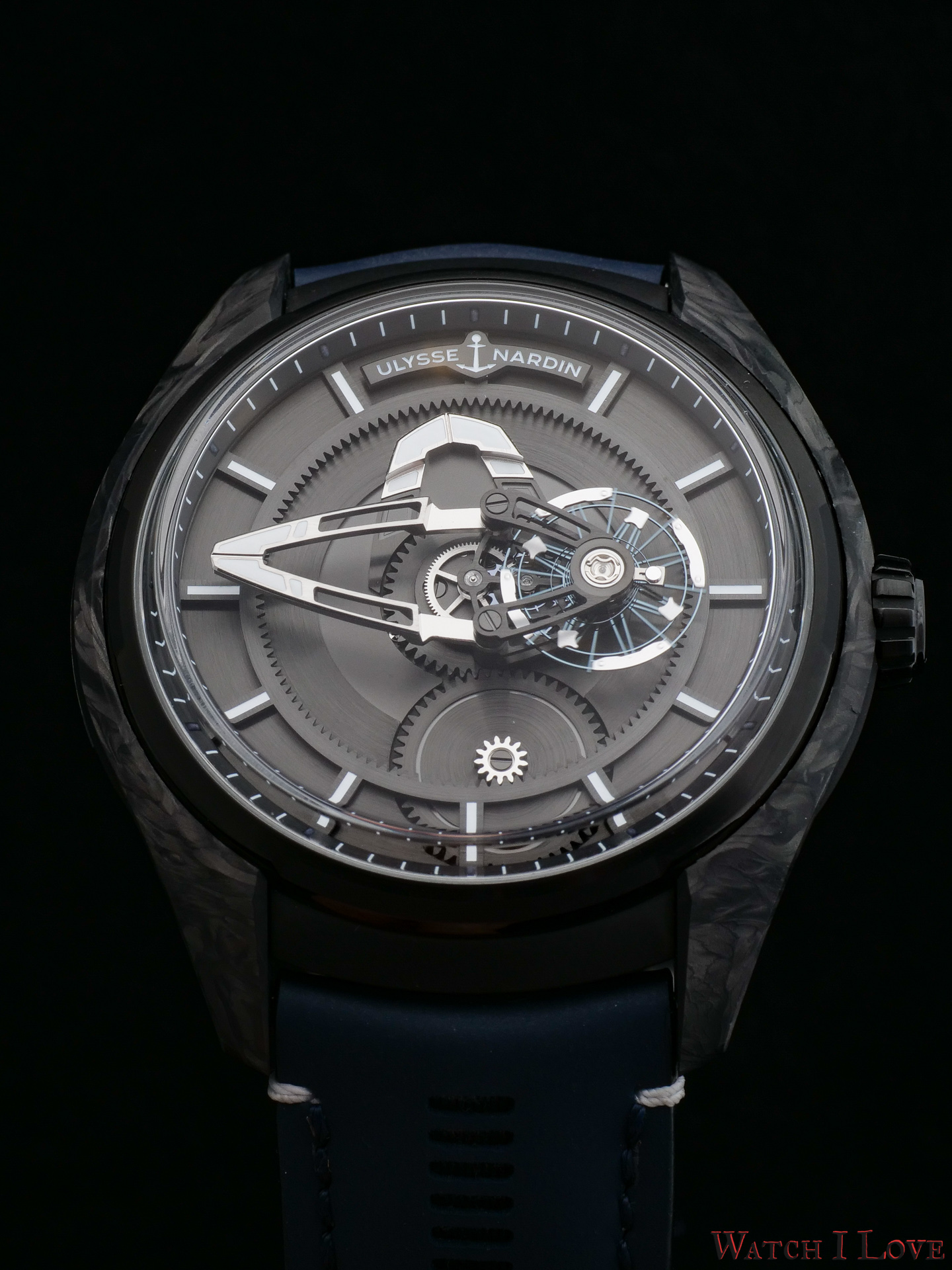 Ulysse Nardin Freak X is presented in four versions using titanium, gold and carbonium. The 43 mm case is pleasantly conceived and finished.