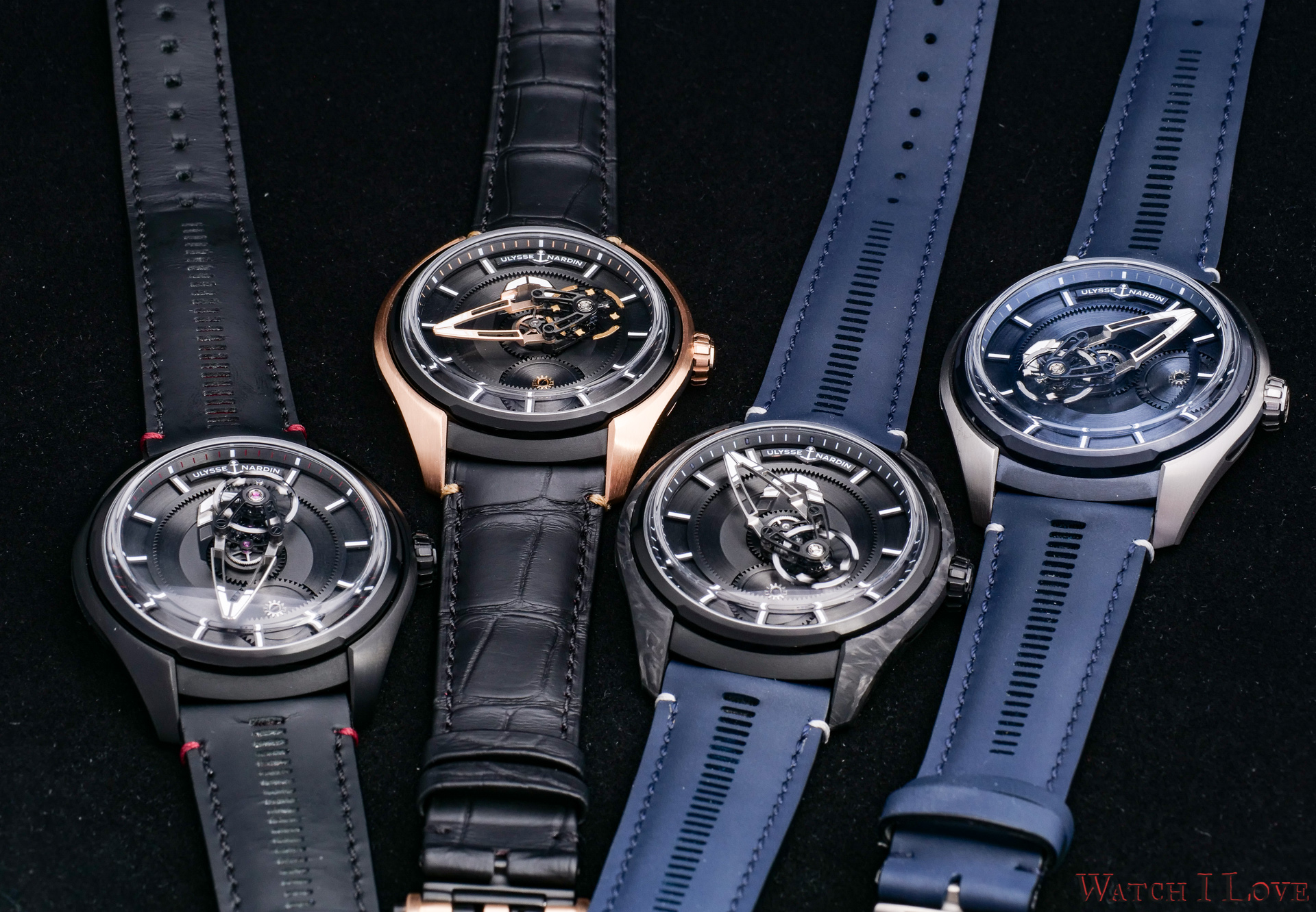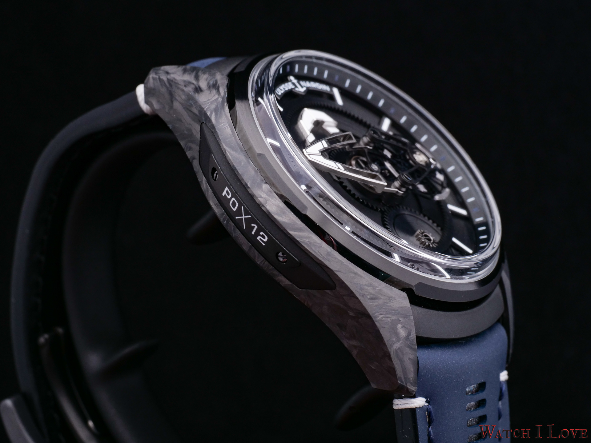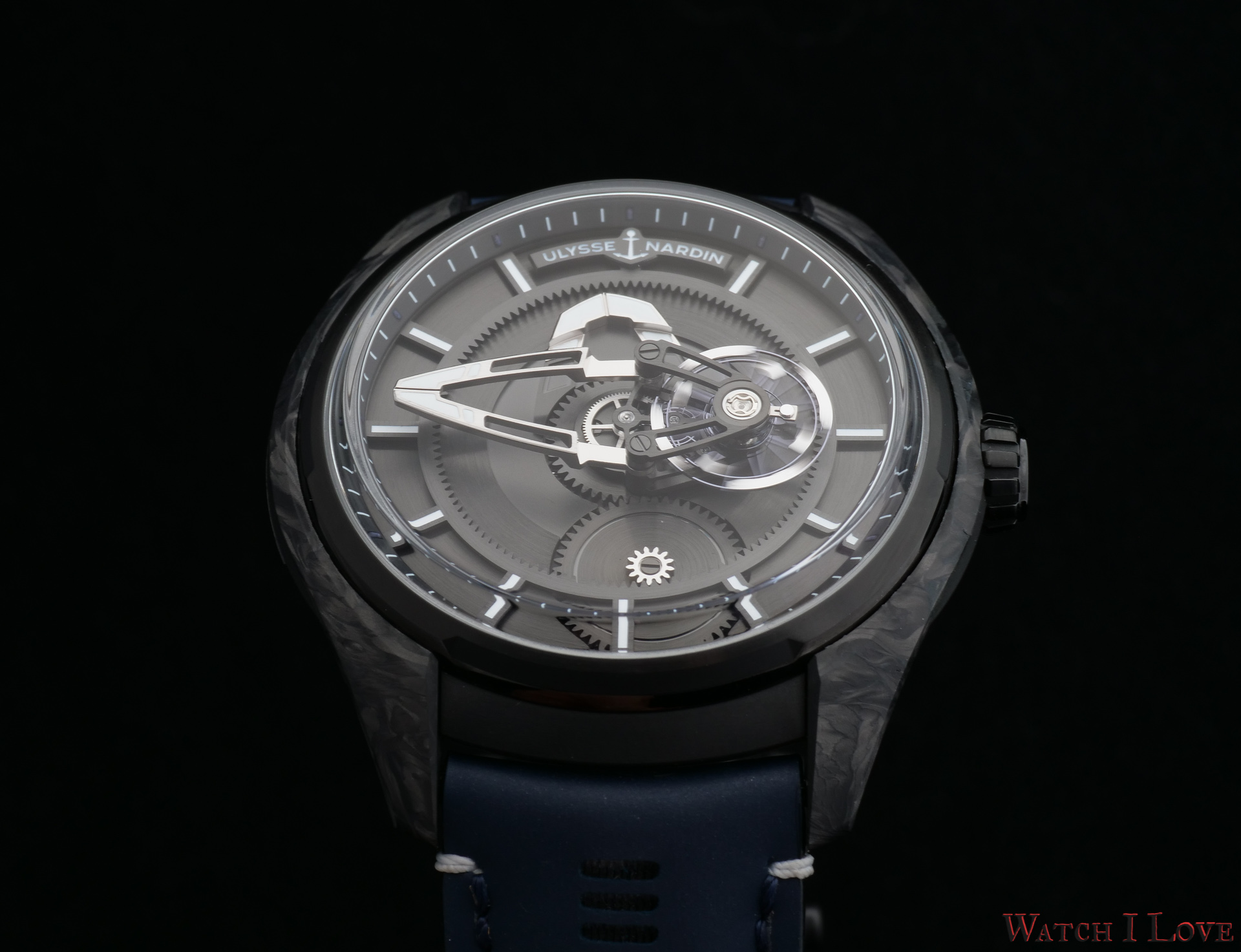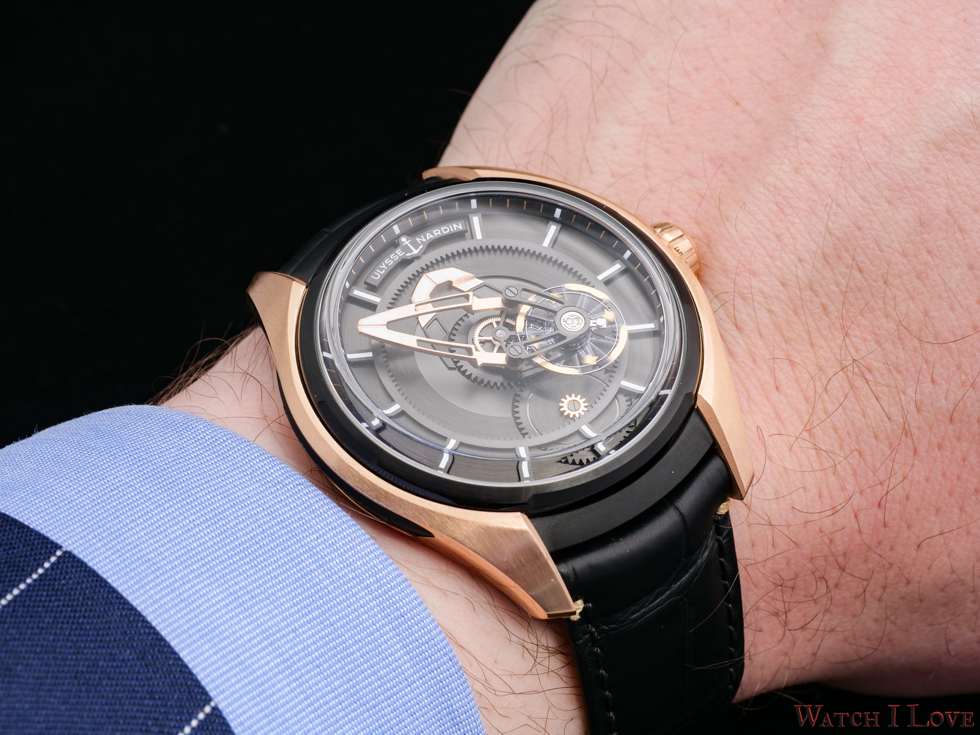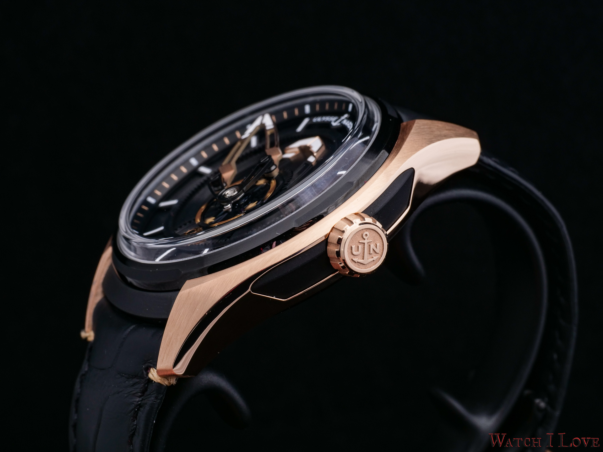 Ulysse Nardin Freak X is presented in four versions using titanium, gold and carbonium. The 43 mm case is pleasantly conceived and finished.