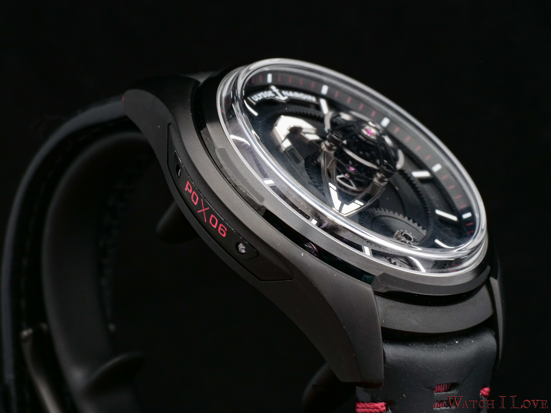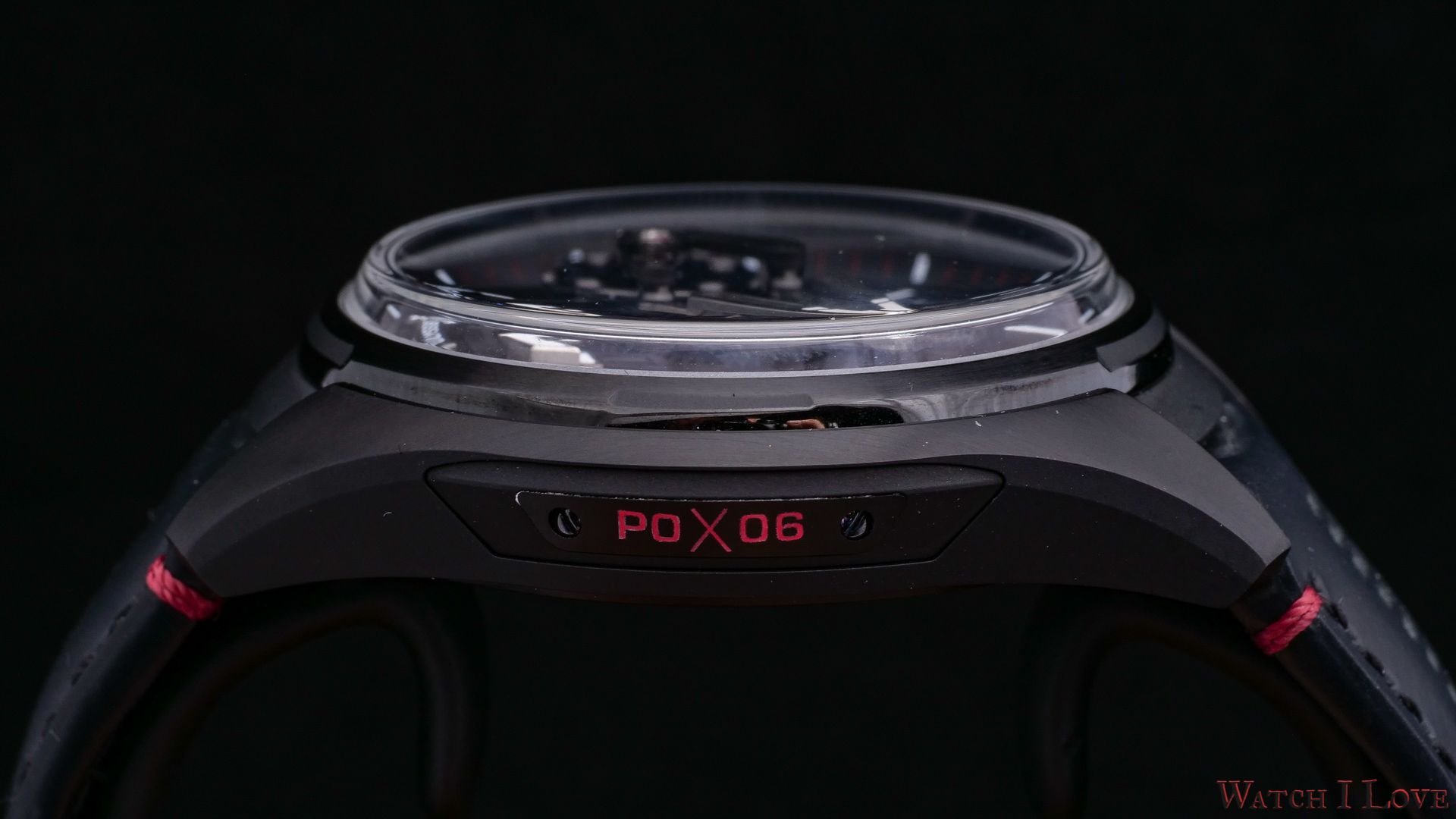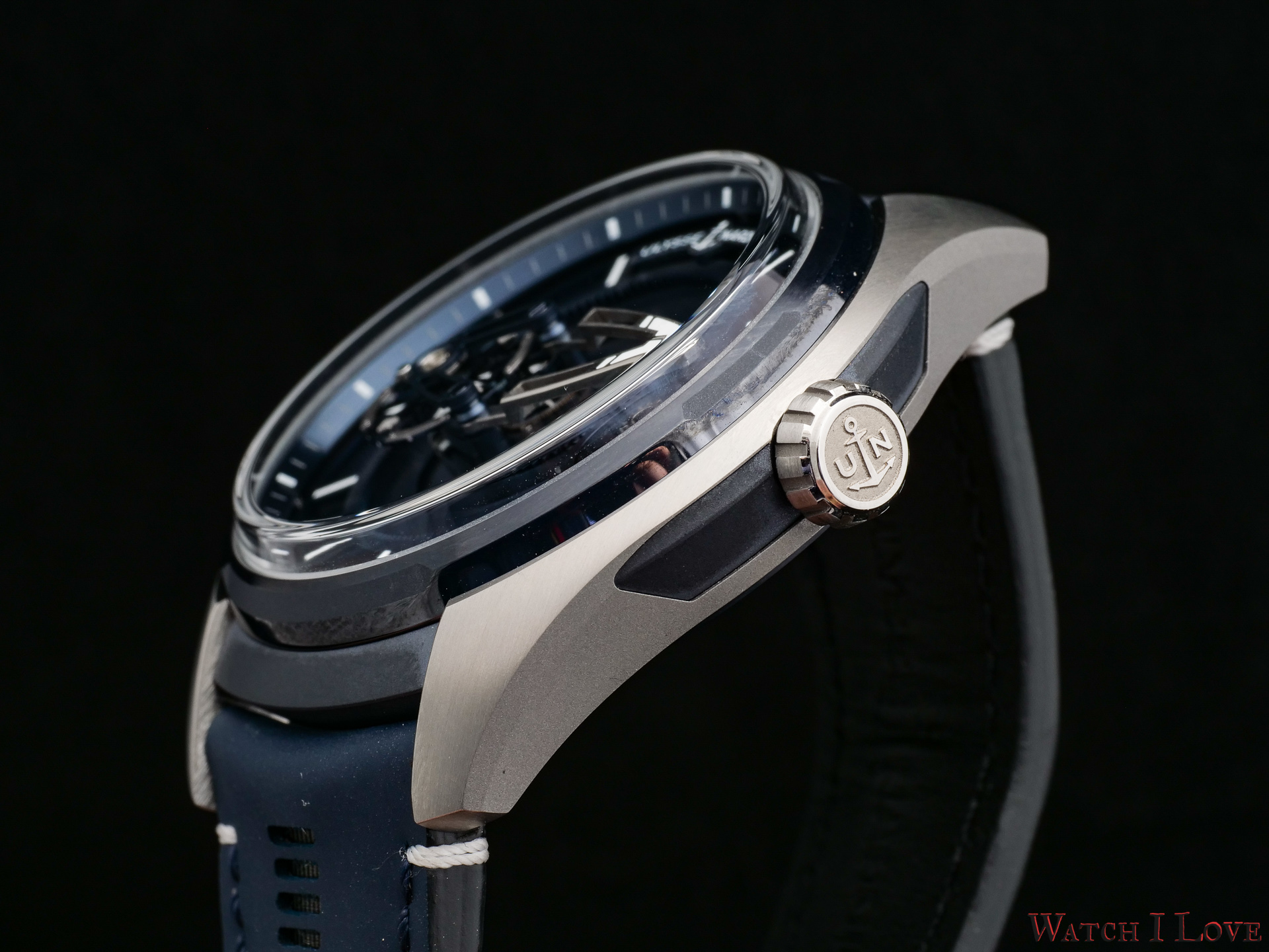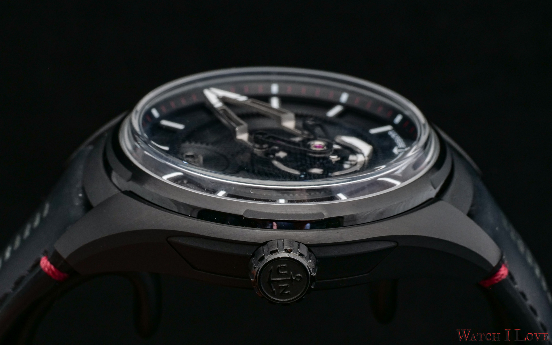 The all-black version is manufactured from titanium with black DLC. The box crystal looks great from any angle. Plus it brings even more depth to the highly mechanised dial.