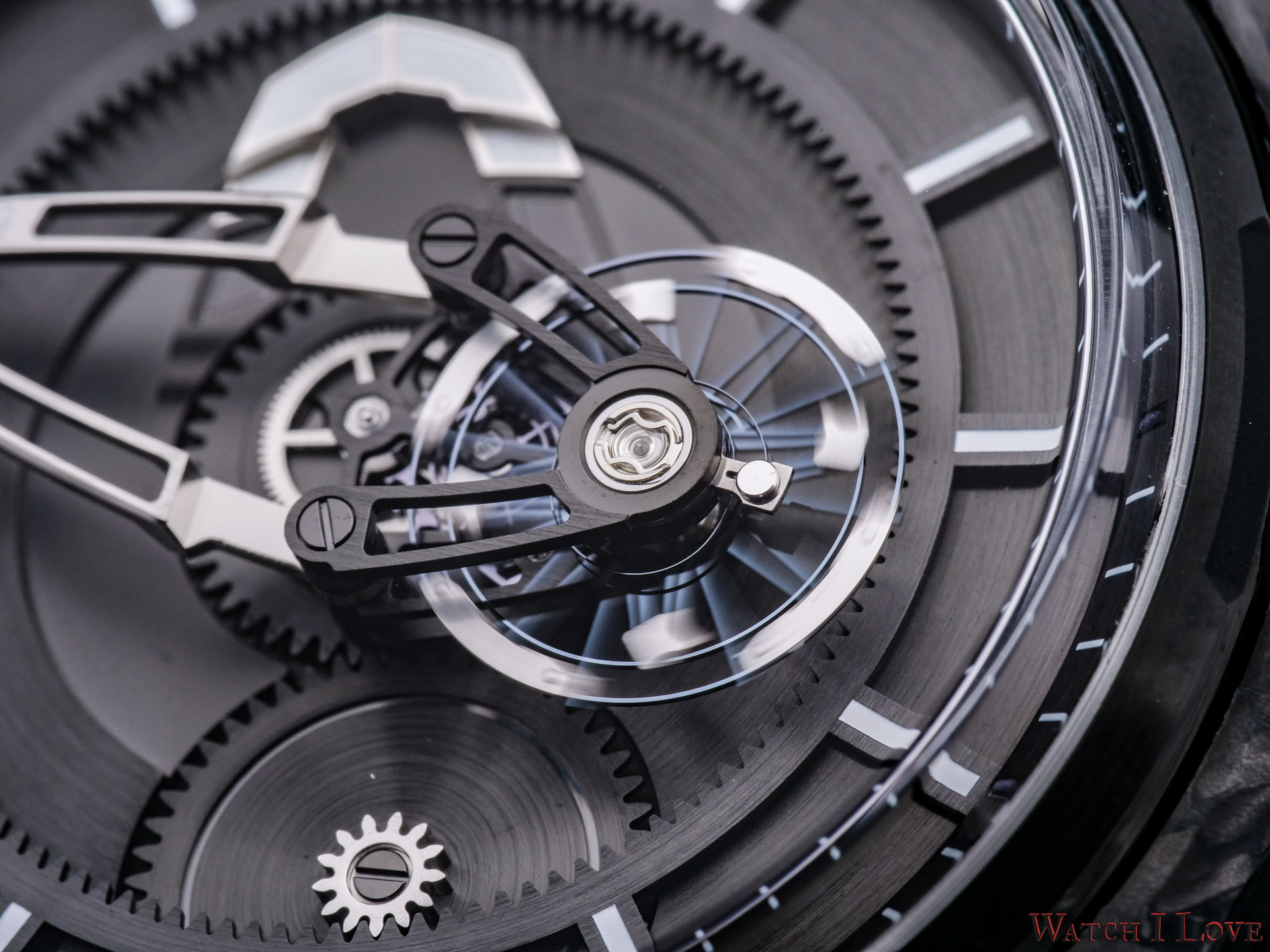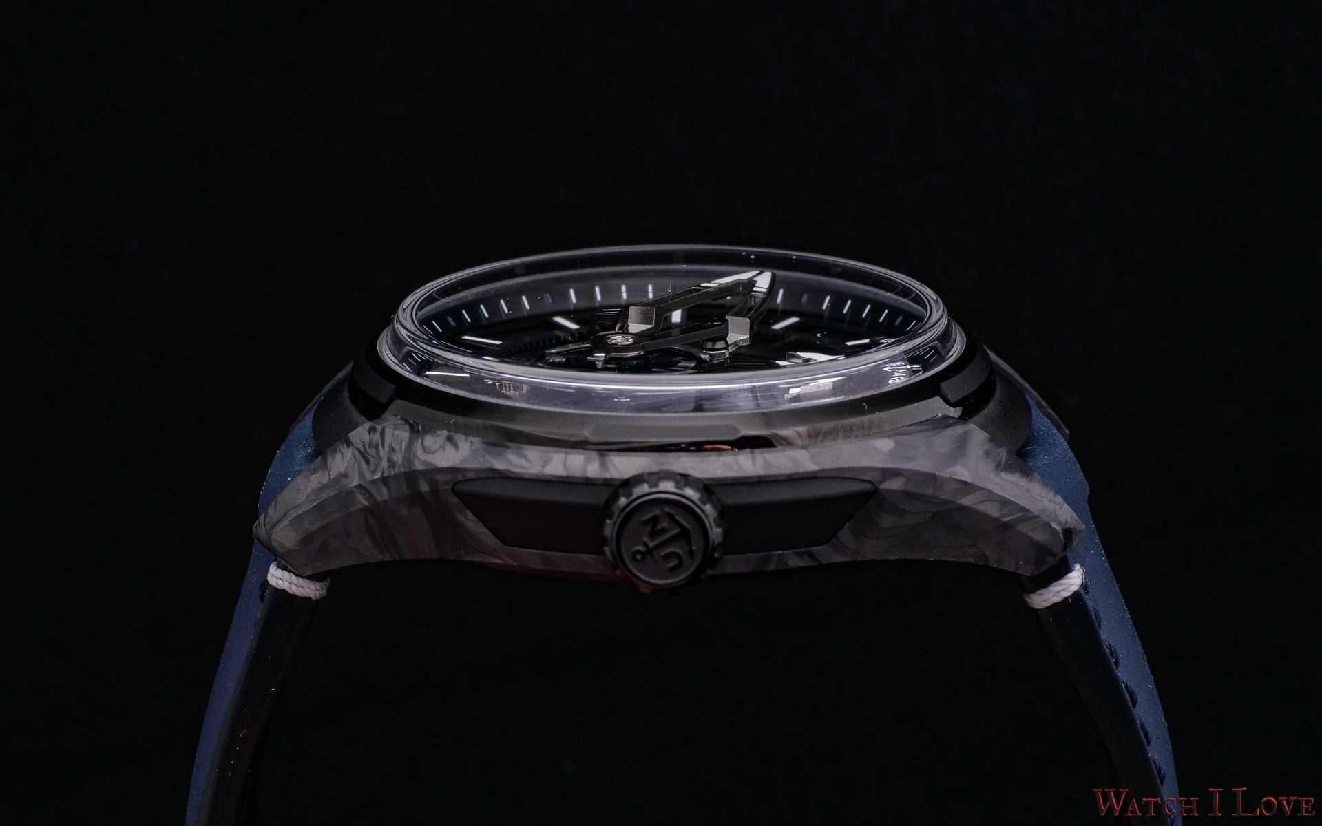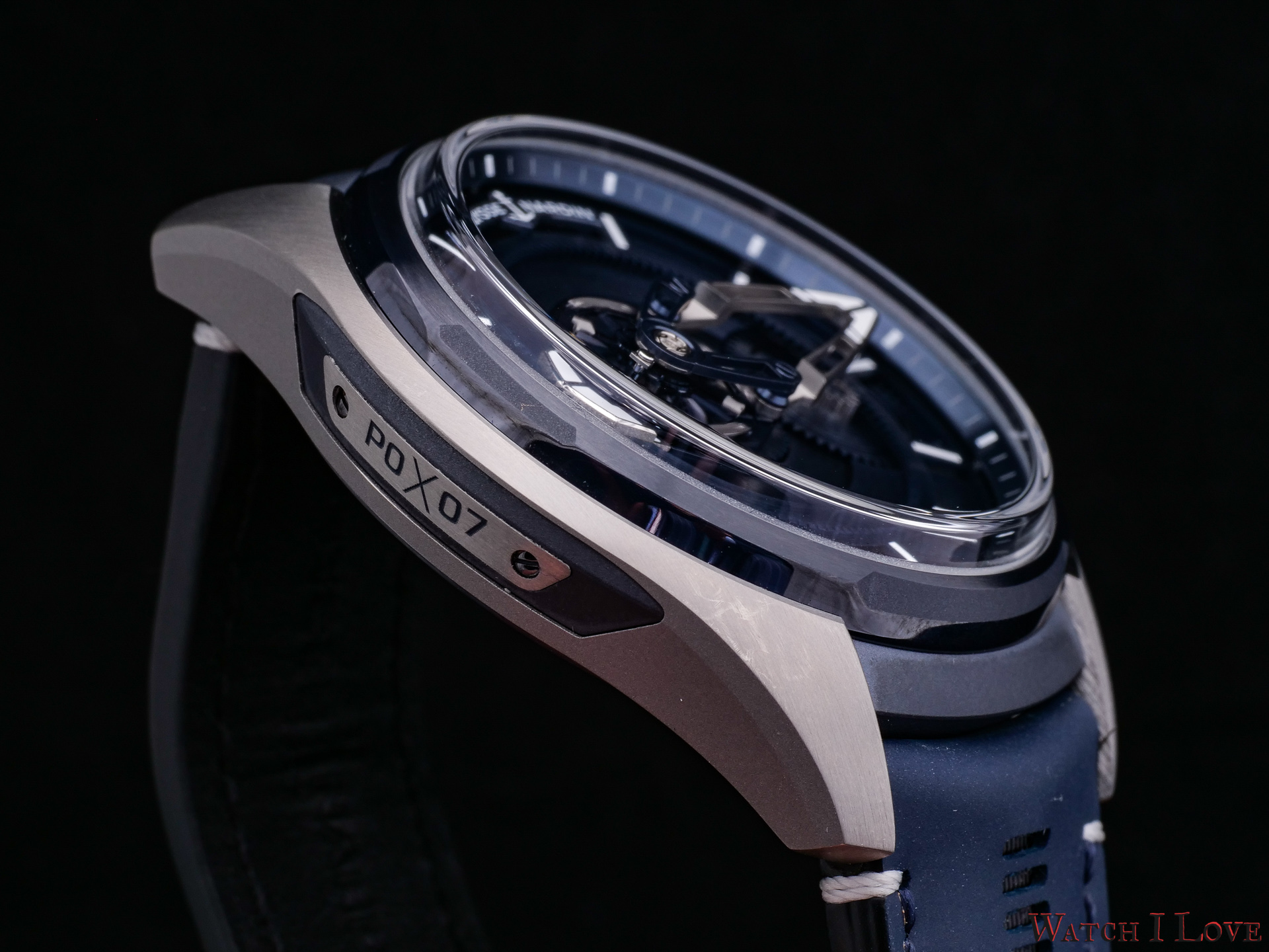 The all-black version is manufactured from titanium with black DLC. The box crystal looks great from any angle. Plus it brings even more depth to the highly mechanised dial.