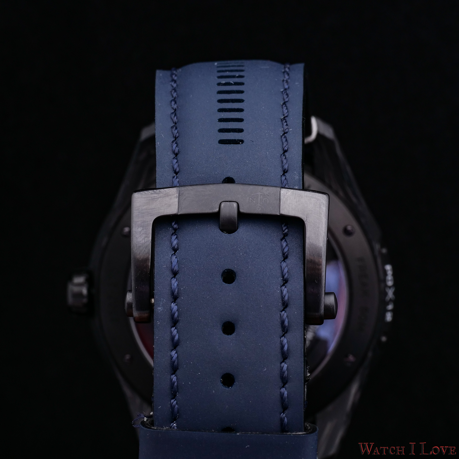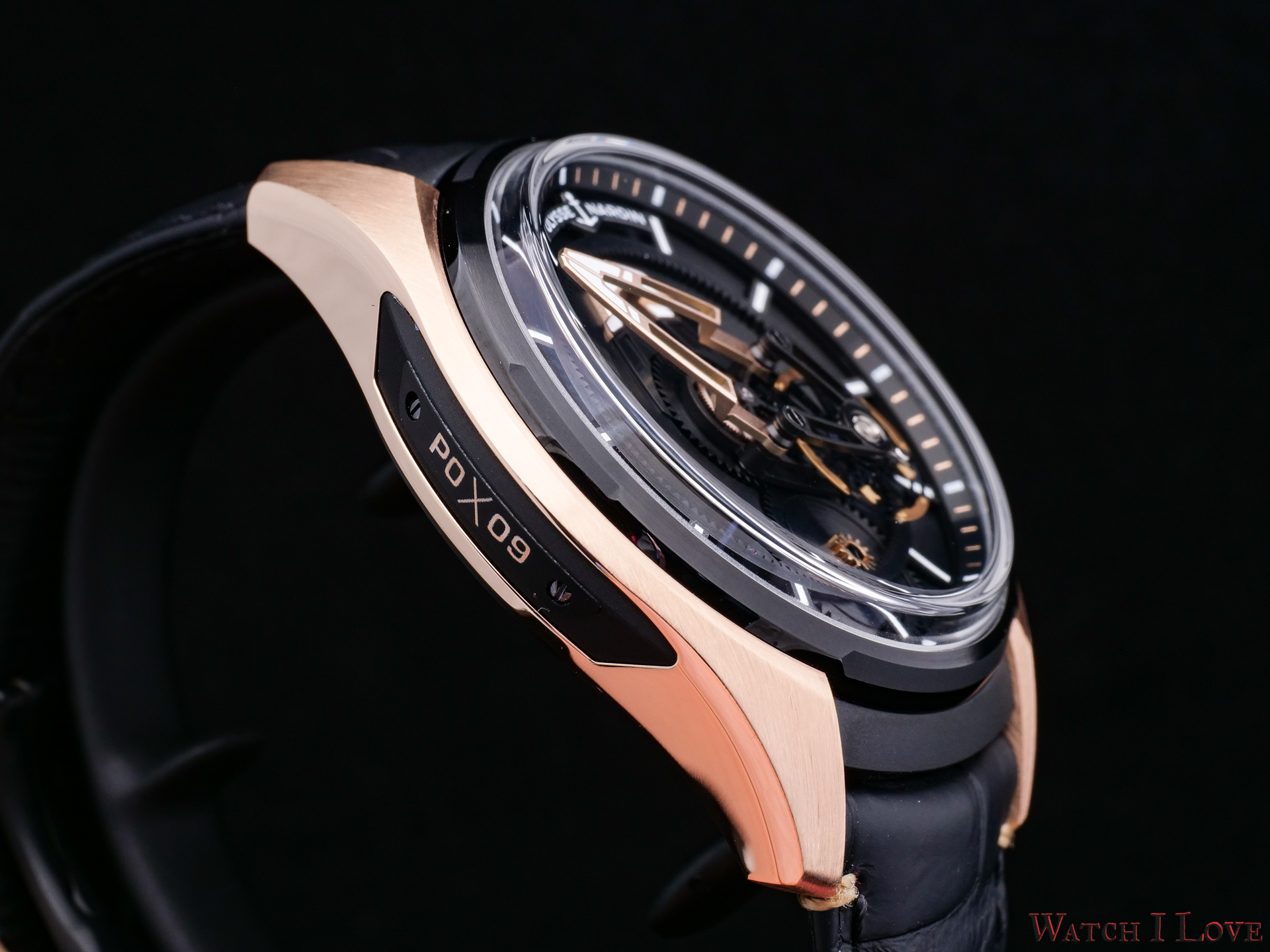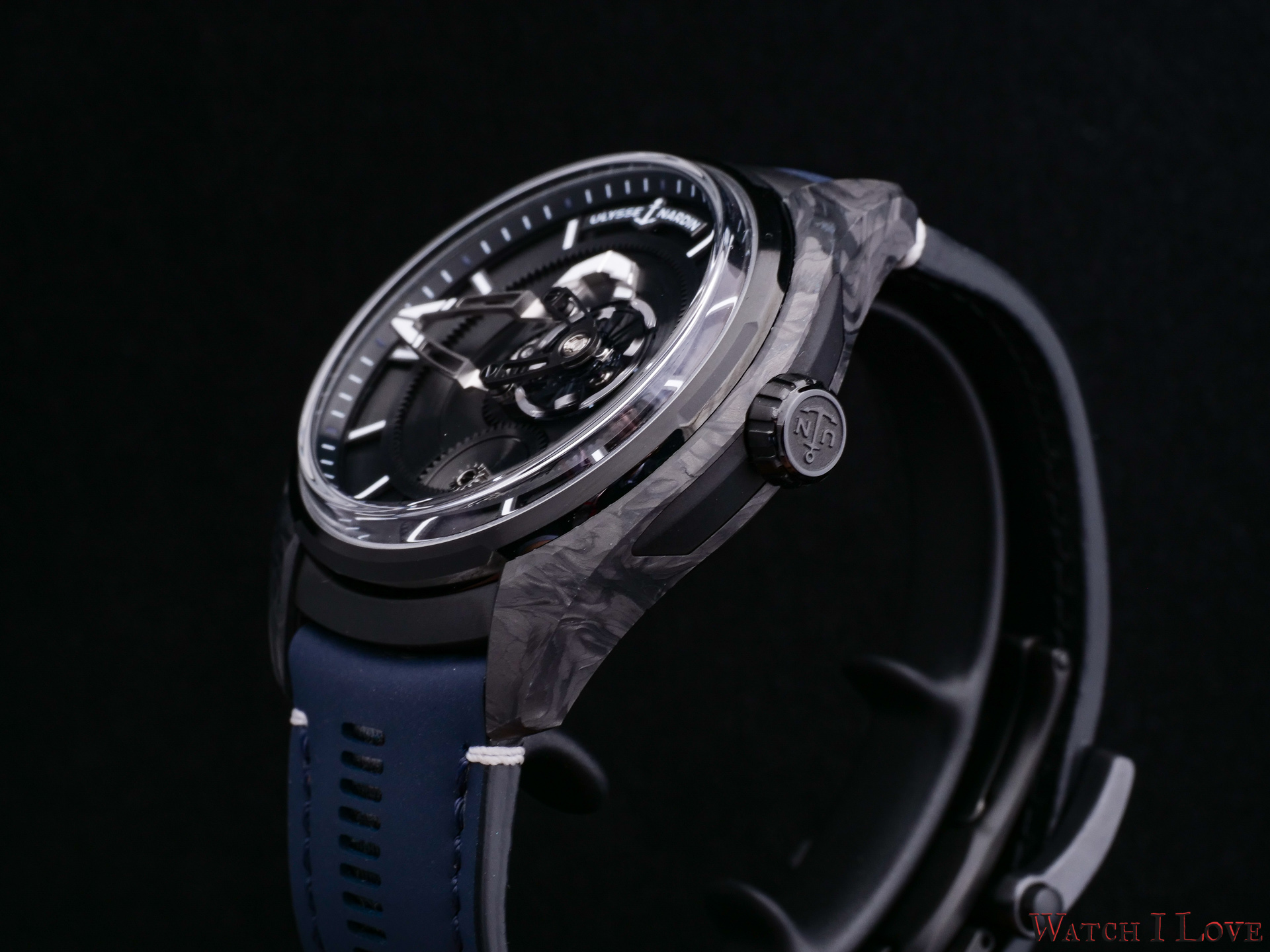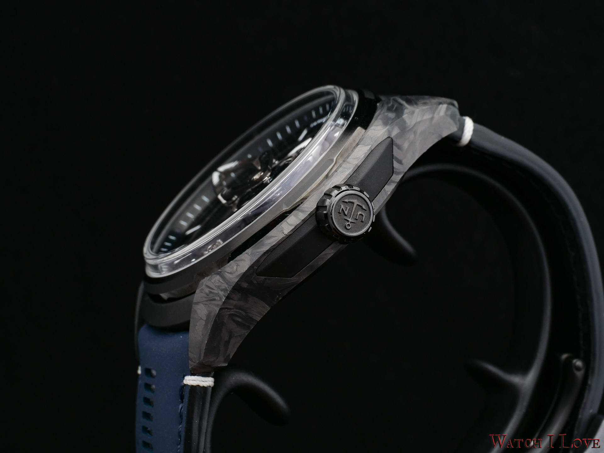The all-black version is manufactured from titanium with black DLC. The box crystal looks great from any angle. Plus it brings even more depth to the highly mechanised dial.