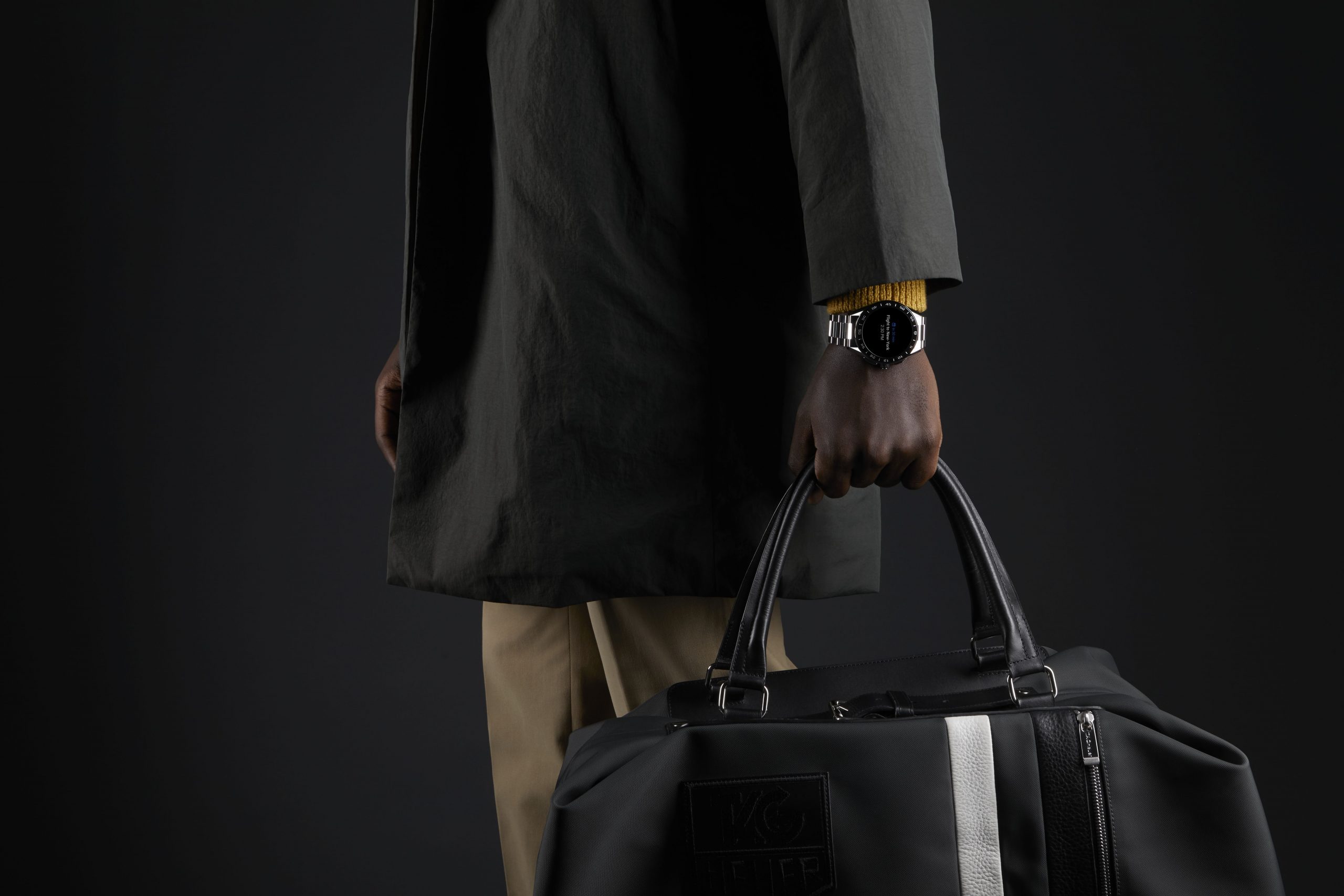 The dial features an ultra-legible all-active and flush OLED touchscreen protected by a scratch-resistant sapphire crystal. To extend the battery life, the screen alternates between active and ambient mode, but it always indicates time. The watch is fitted with a magnetic battery charger and a bespoke travel pouch.