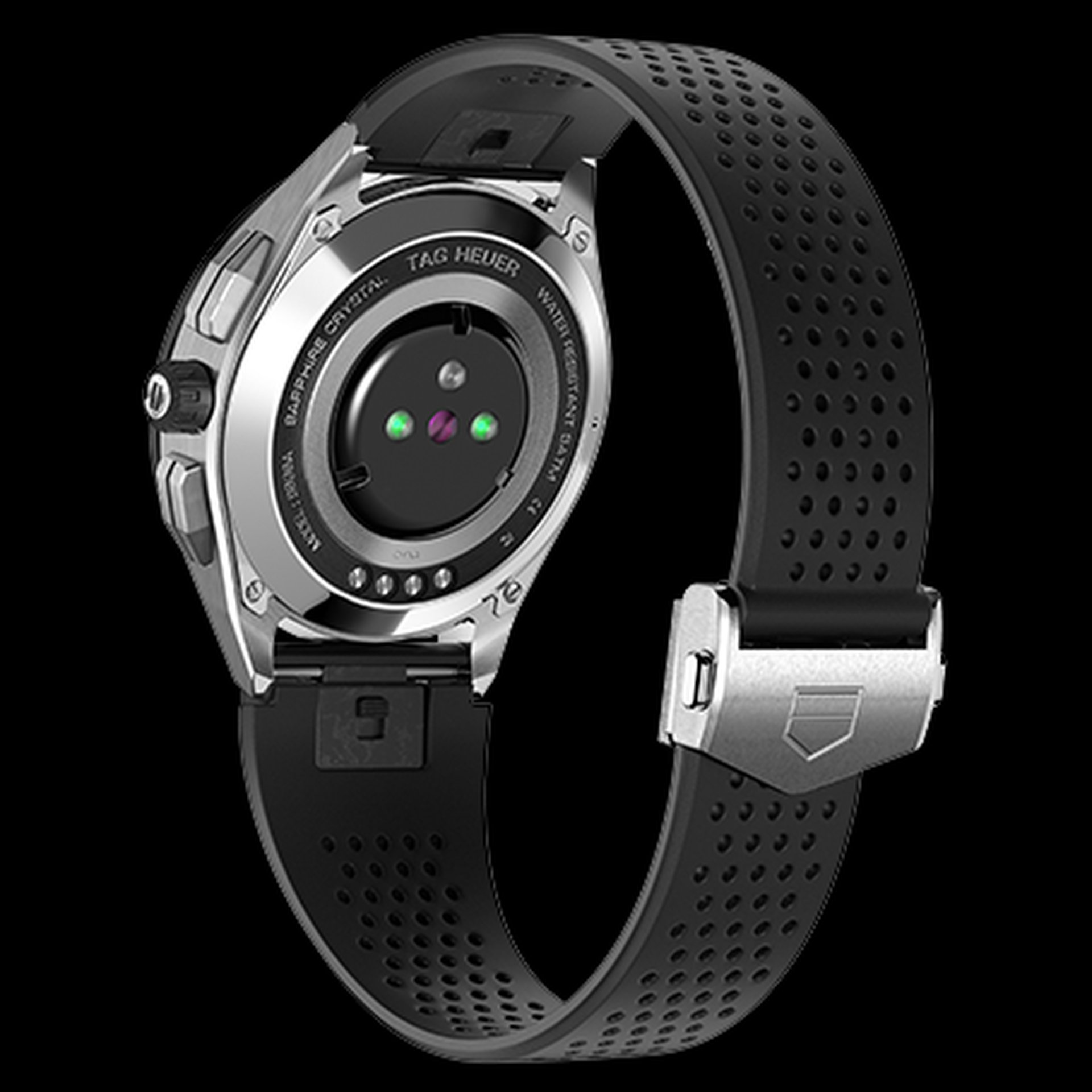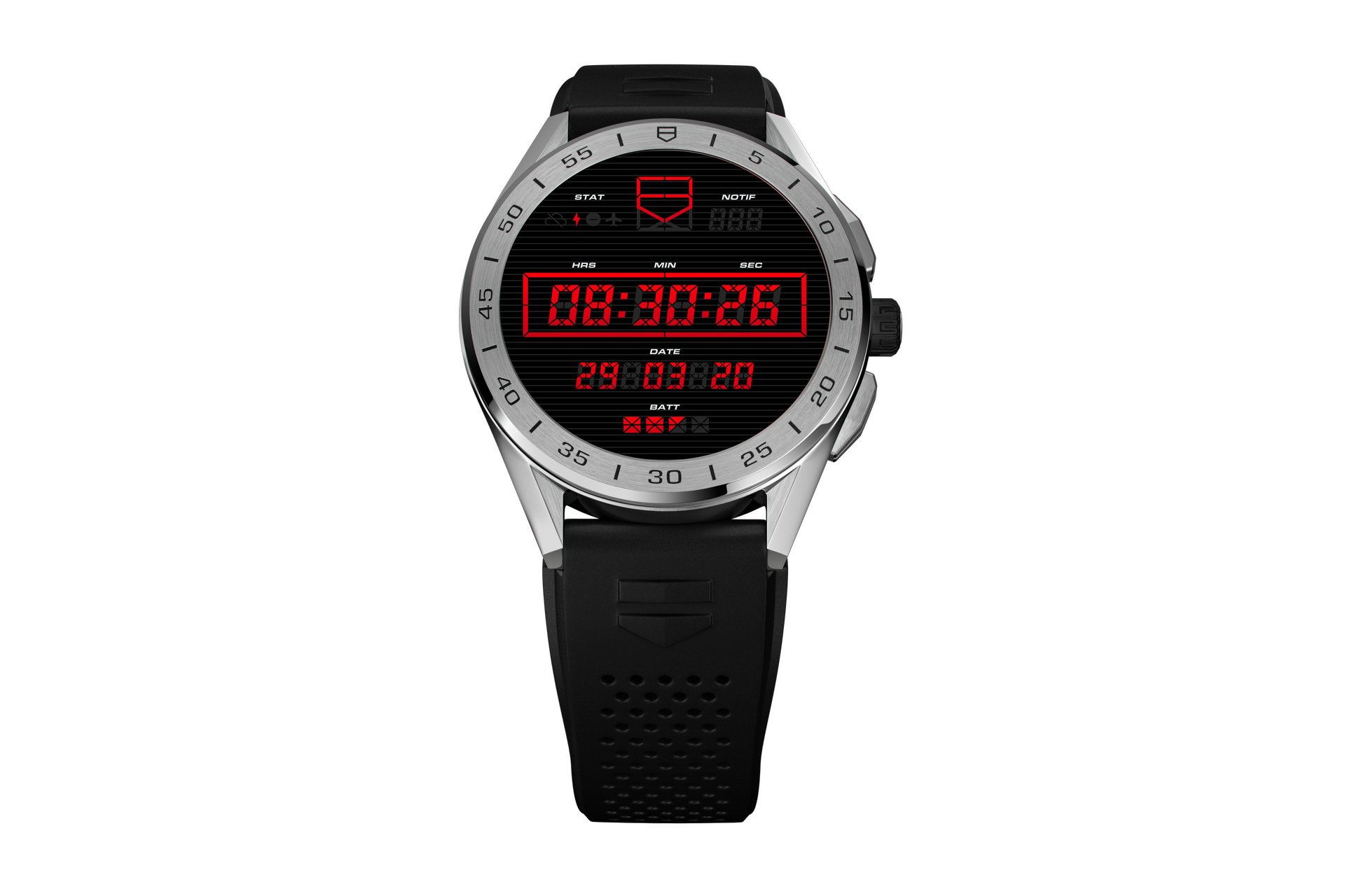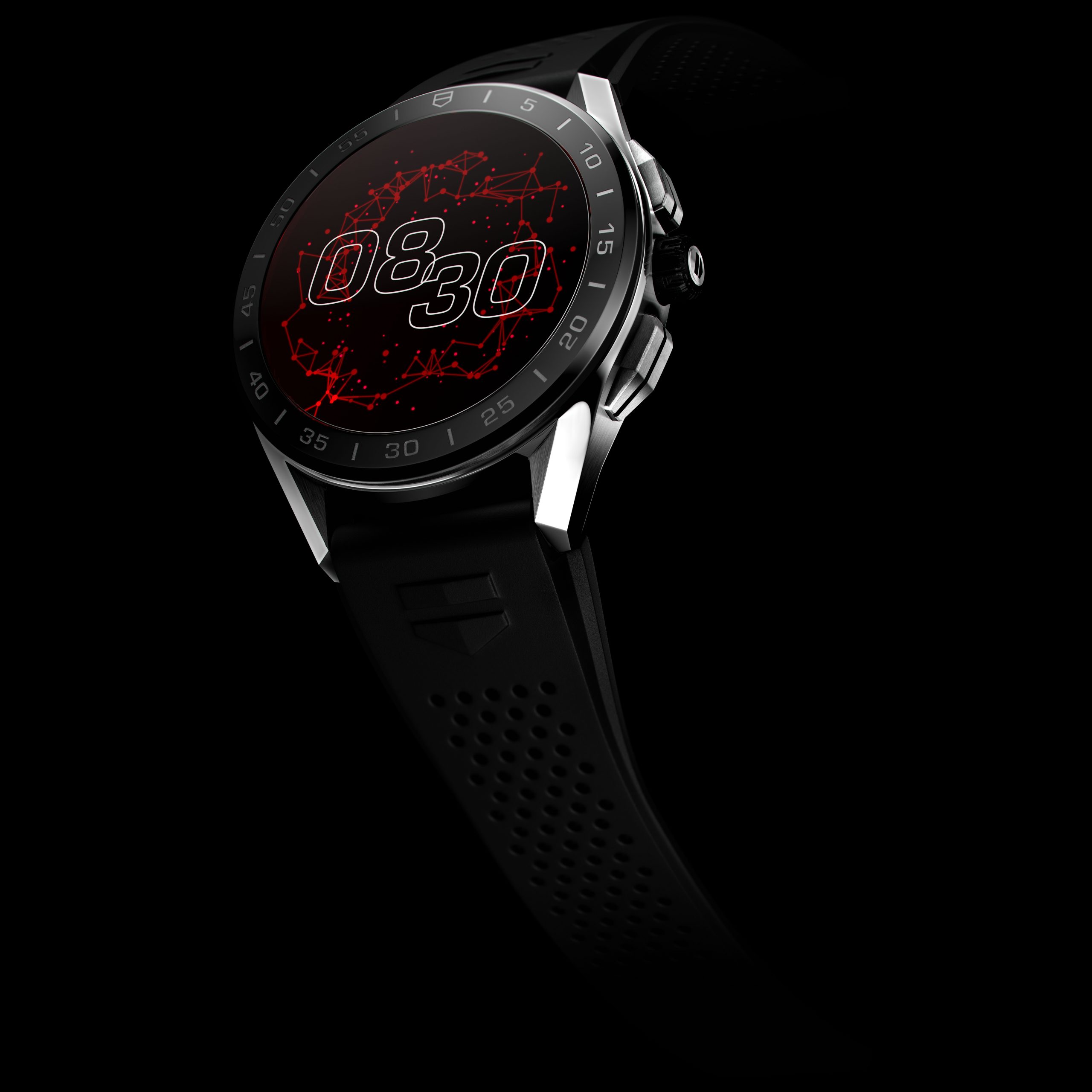 The versatility of the TAG Heuer Connected watch is also enhanced by an intuitive interchangeable bracelet system. With a single clip motion, the wearer can switch up their look with a choice of durable rubber straps available in a classic black scale pattern with red stitching, or bolder perforated red, orange or khaki, complementing the core steel and black options.