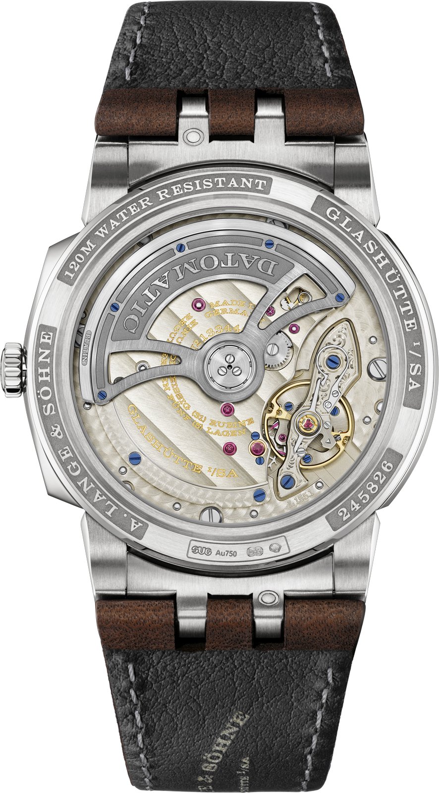 In line with Lange’s philosophy, all parts are lavishly hand-finished and the movement is assembled twice. Many artisanal details can be discovered with a glance through the sapphire-crystal caseback. They include the German silver plate decorated with Glashütte ribbing, the wave pattern engraved on the balance bridge, and the screwed gold chaton above the escape wheel.