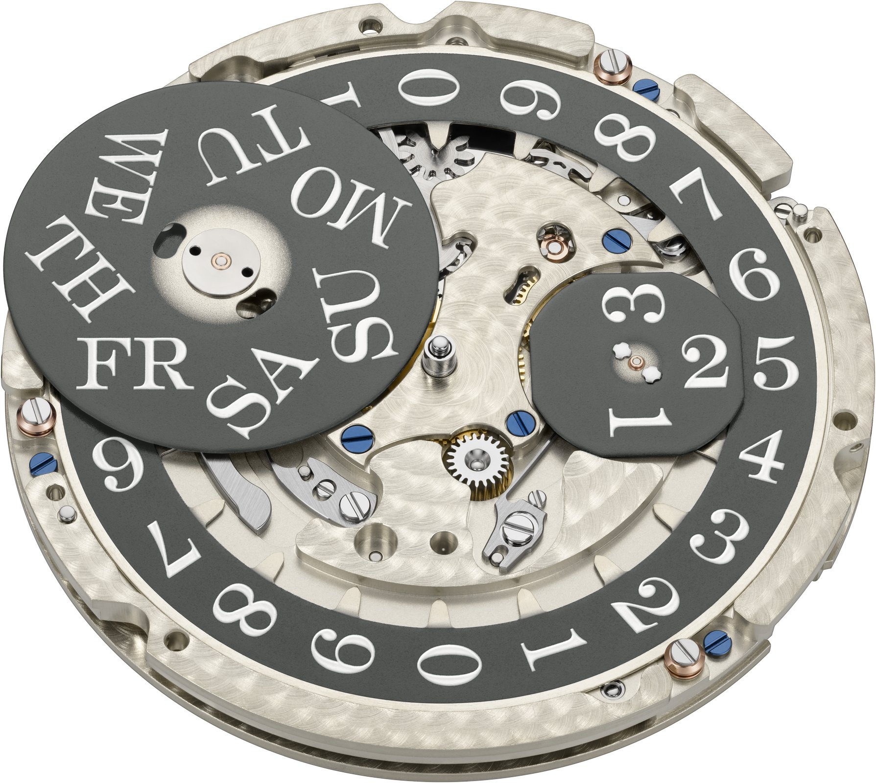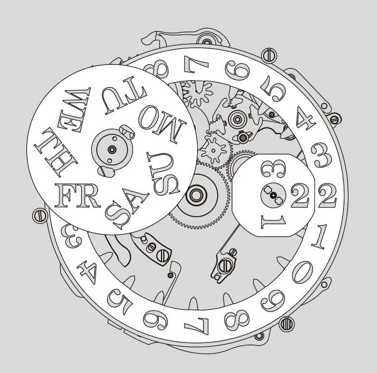 The date-and-day mechanism is powered by the hour wheel that rotates once every 12 hours. It transfers its motion to the 24-hour wheel that requires exactly one day to perform a full revolution. The day-of-week display is switched directly by the 24-hour wheel. At the same time, a program wheel controls the correct switching action of the units ring and the tens disc.
