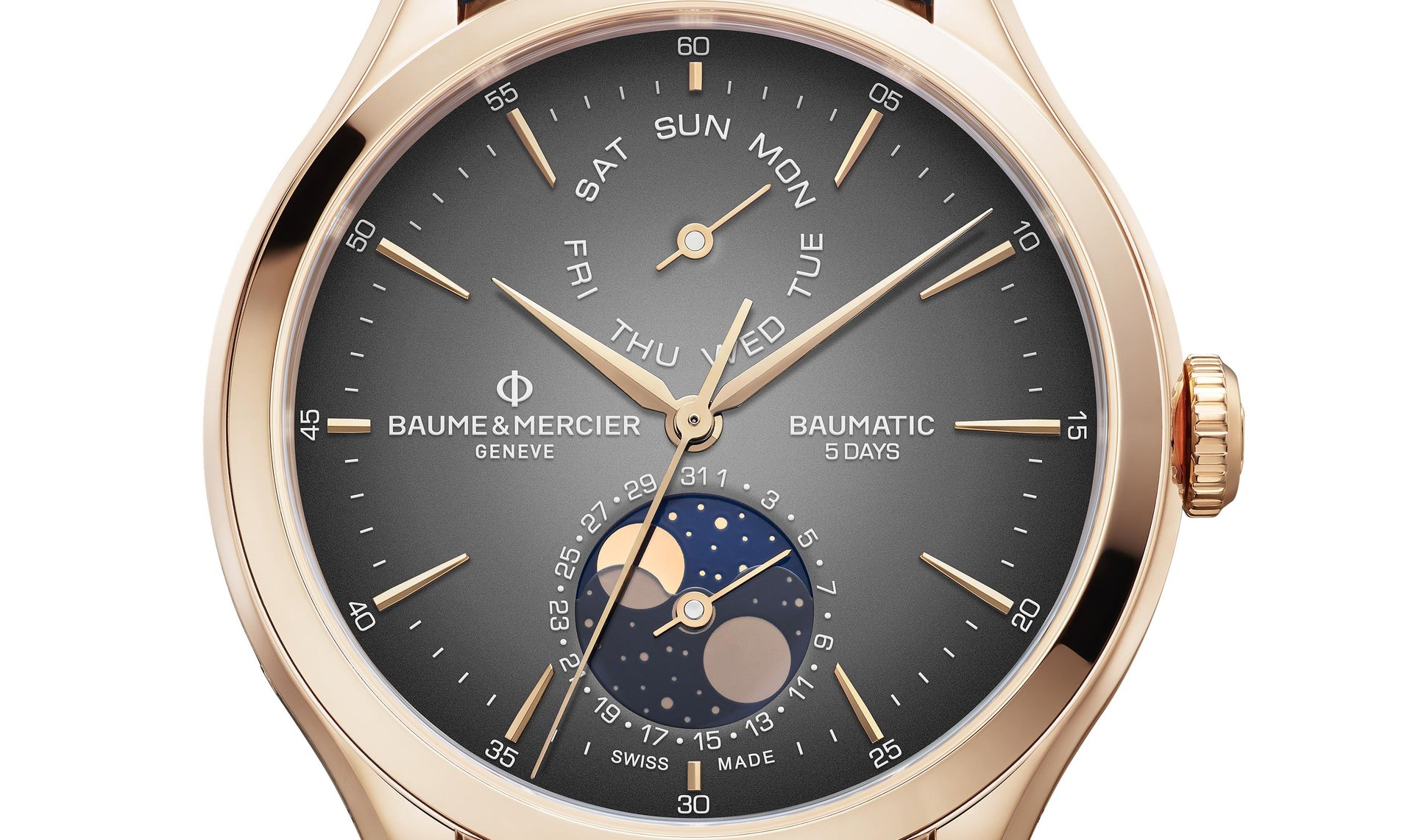 An extraordinary timepiece joins the Baume & Mercier Clifton Baumatic collection. A new small complication with a unique look in addition to day-date and moon-phase – Baume & Mercier Clifton Baumatic Day-Date Moon-Phase.