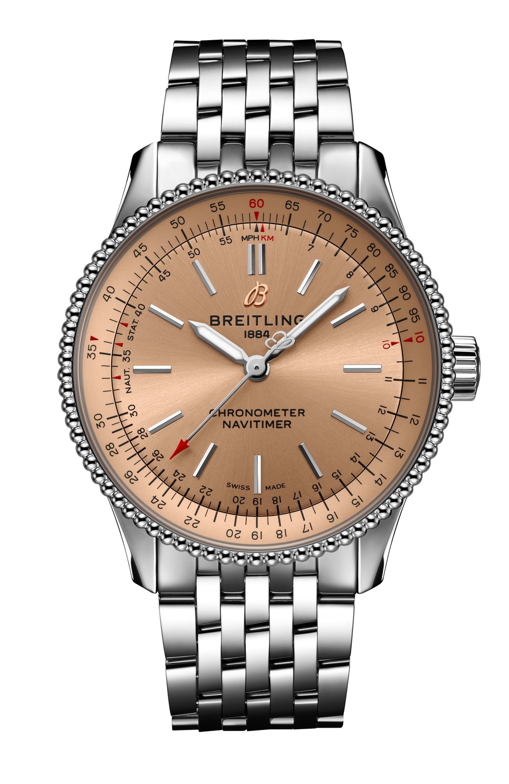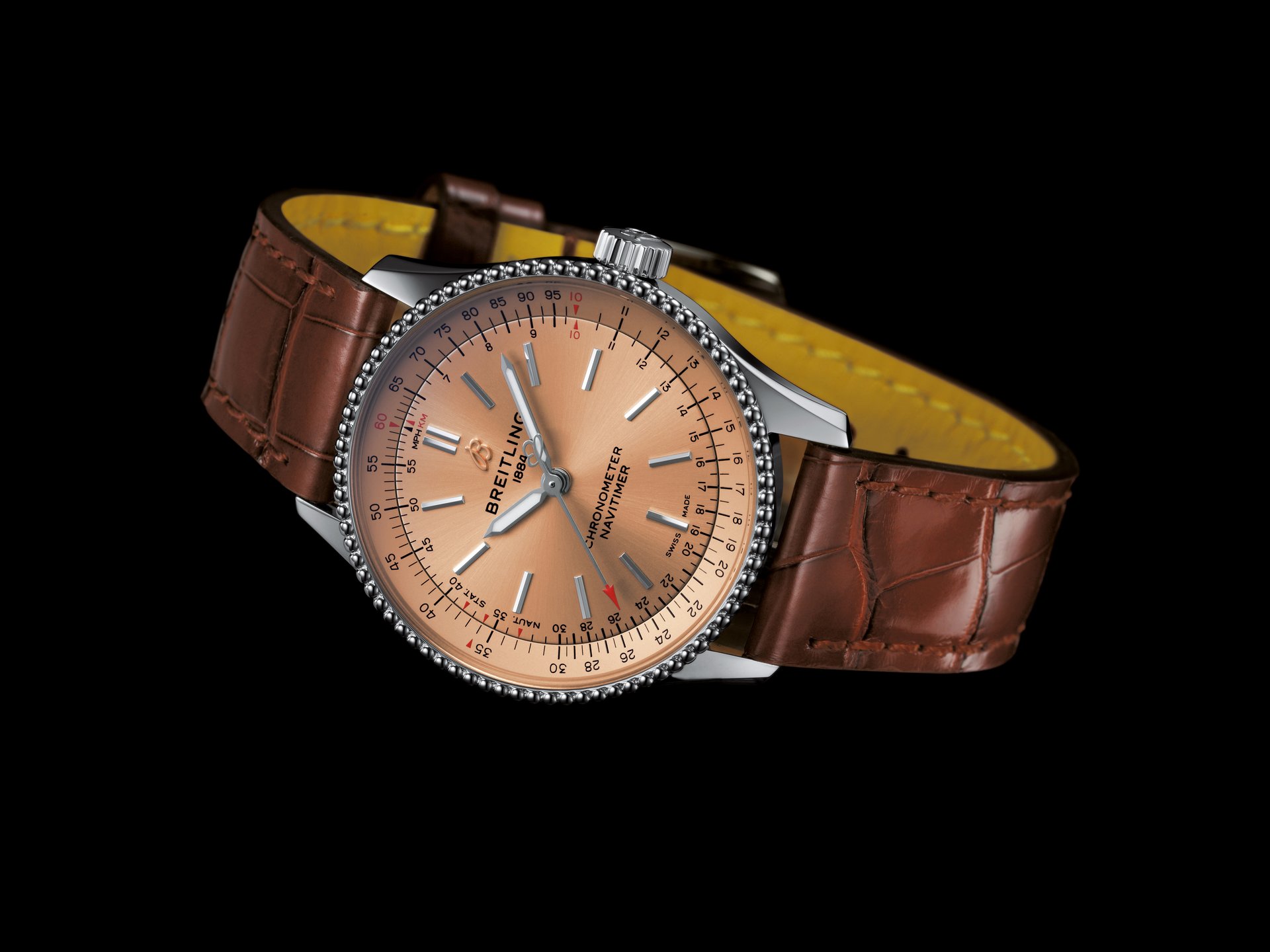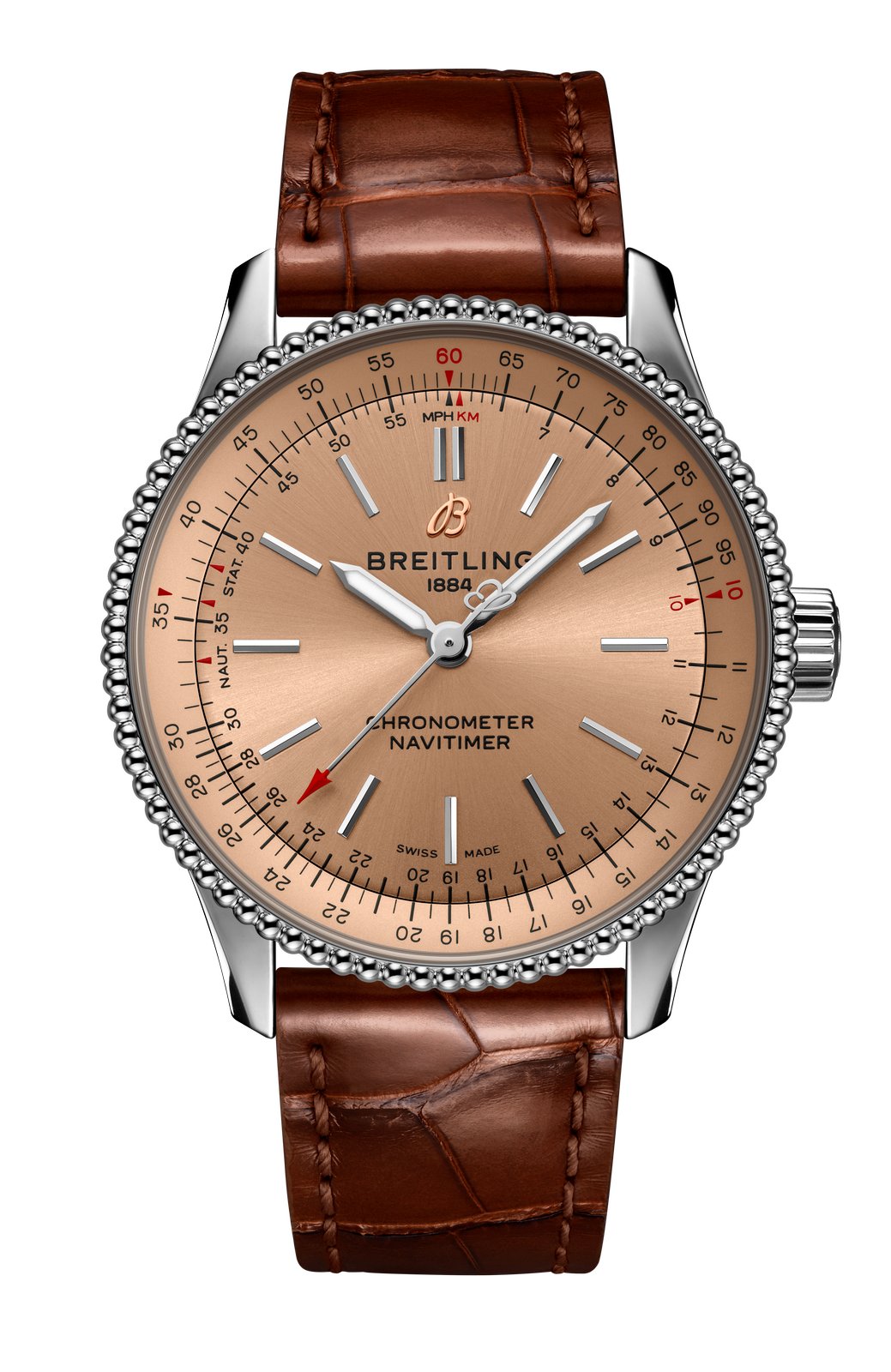 The first is offered with a 35-millimetre stainless-steel case with a choice of a blue dial presented with a blue alligator leather strap, a copper dial with a brown alligator leather strap, or a silver dial with a burgundy alligator leather strap. The straps feature a pin or folding buckle, and each version of the watch is also available on a stainless-steel Navitimer bracelet with a folding clasp.