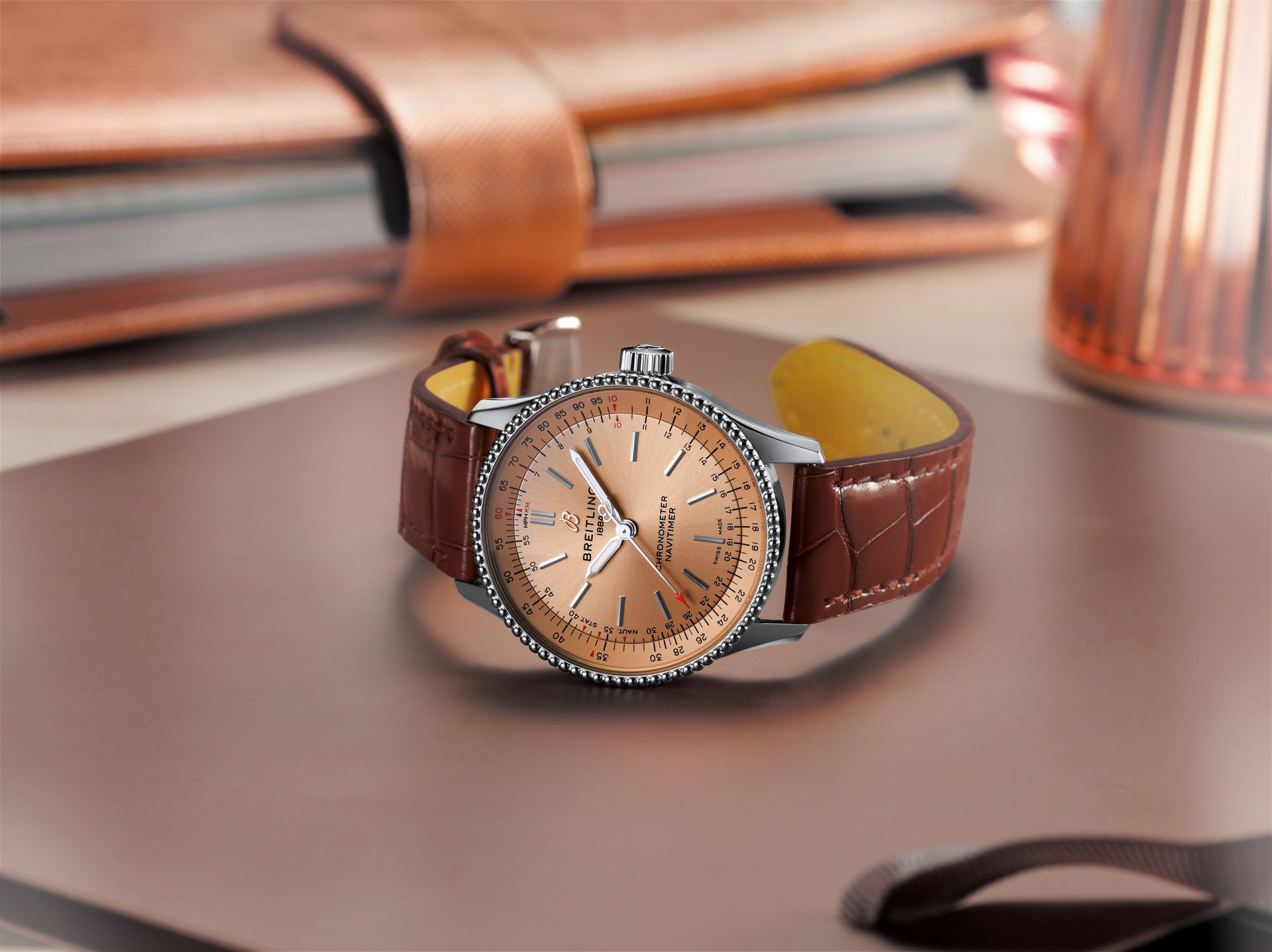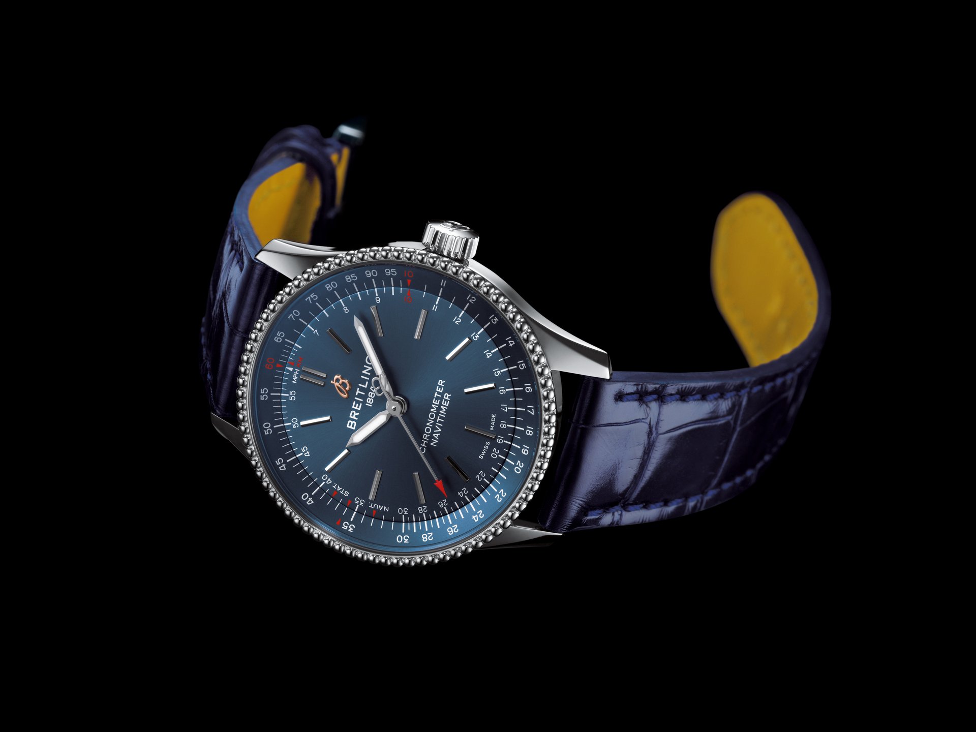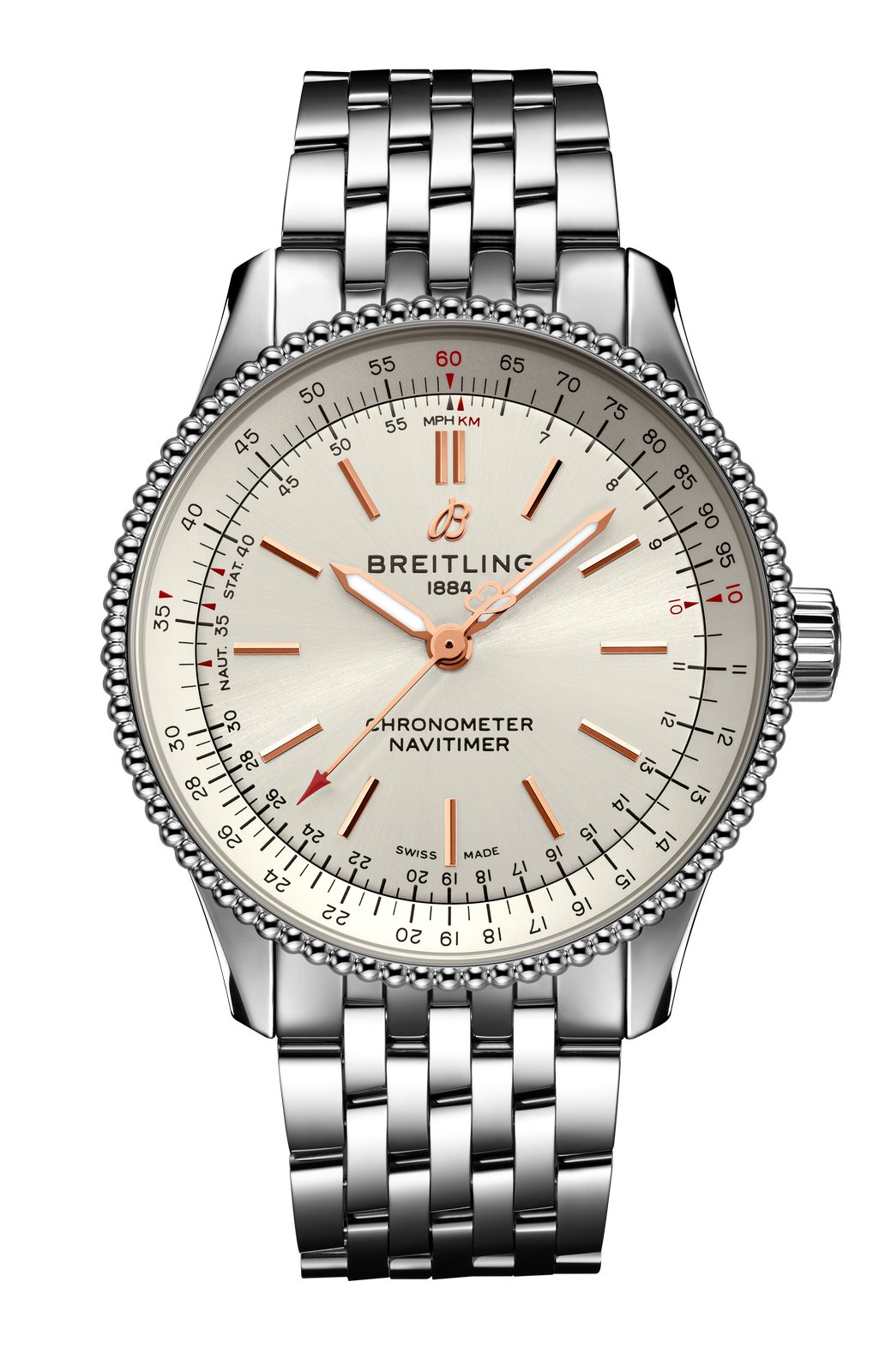 The first is offered with a 35-millimetre stainless-steel case with a choice of a blue dial presented with a blue alligator leather strap, a copper dial with a brown alligator leather strap, or a silver dial with a burgundy alligator leather strap. The straps feature a pin or folding buckle, and each version of the watch is also available on a stainless-steel Navitimer bracelet with a folding clasp.