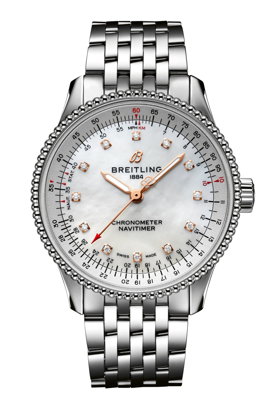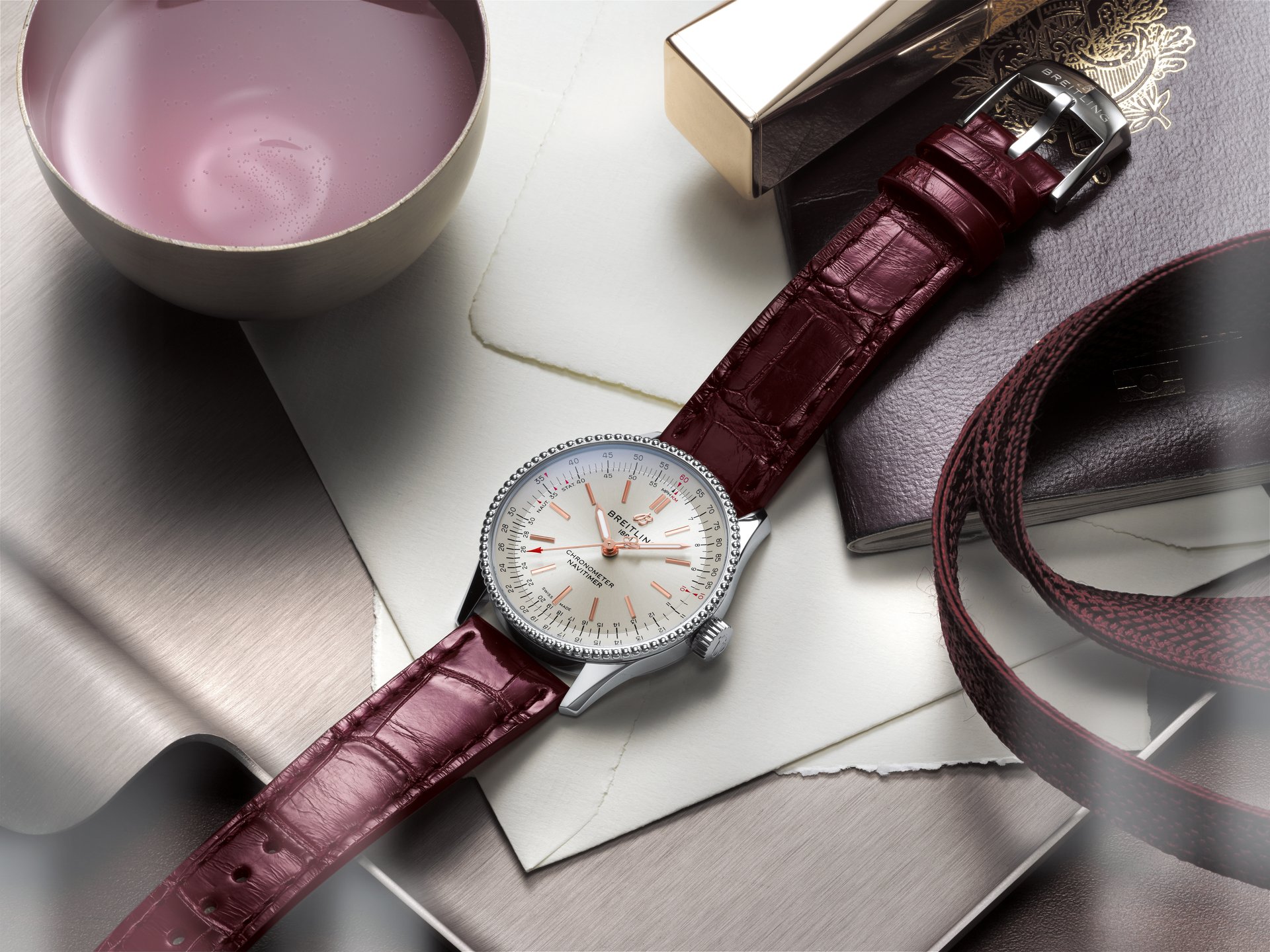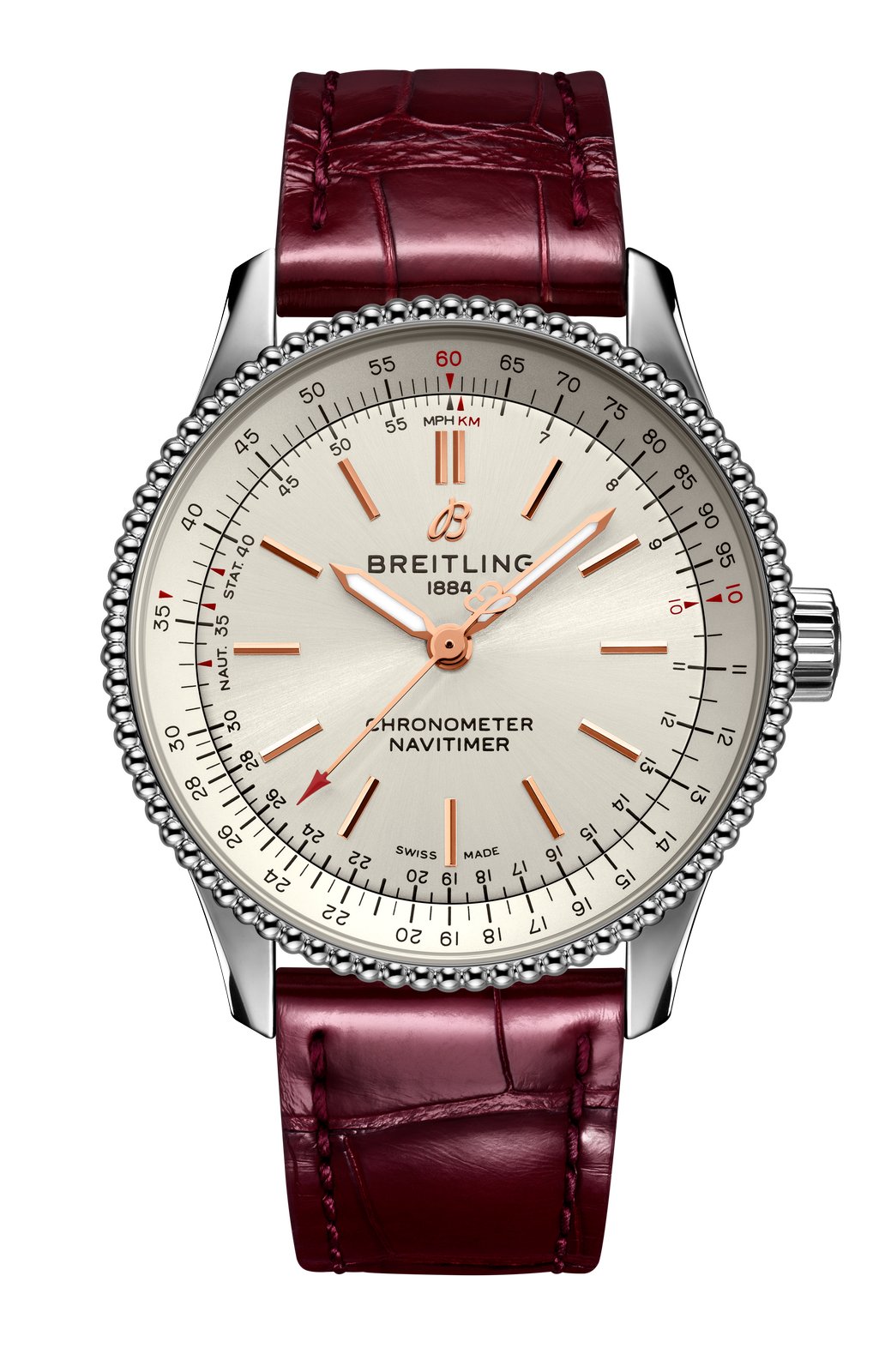 The second version also features a 35-millimetre stainless-steel case with a white mother-of-pearl dial and diamond hour markers. It has a burgundy alligator leather strap with either a pin or folding buckle and is also available with a stainless-steel Navitimer bracelet with a folding clasp.