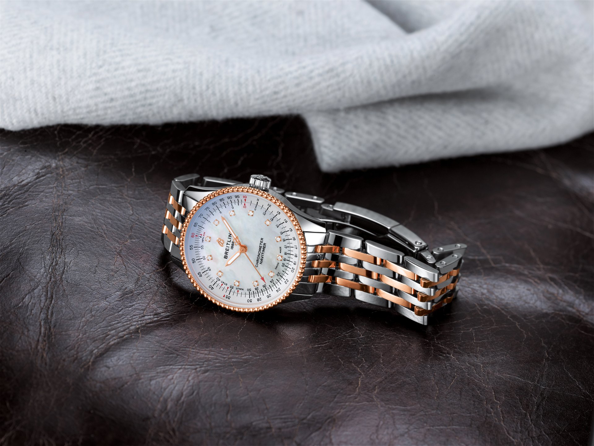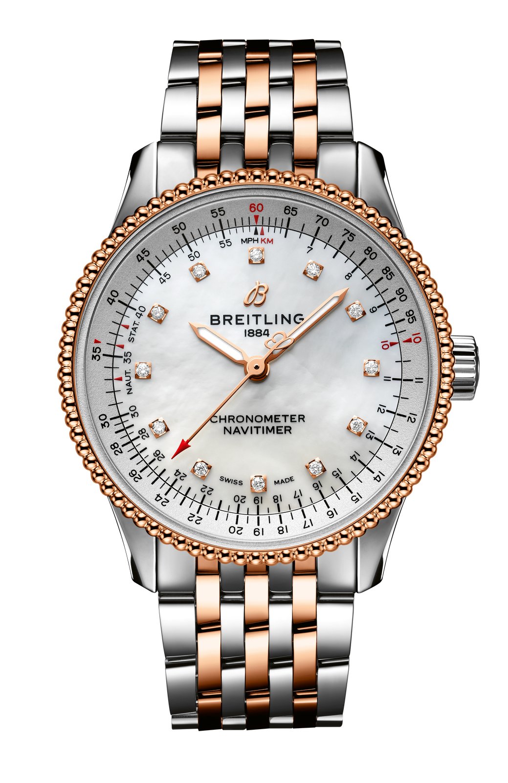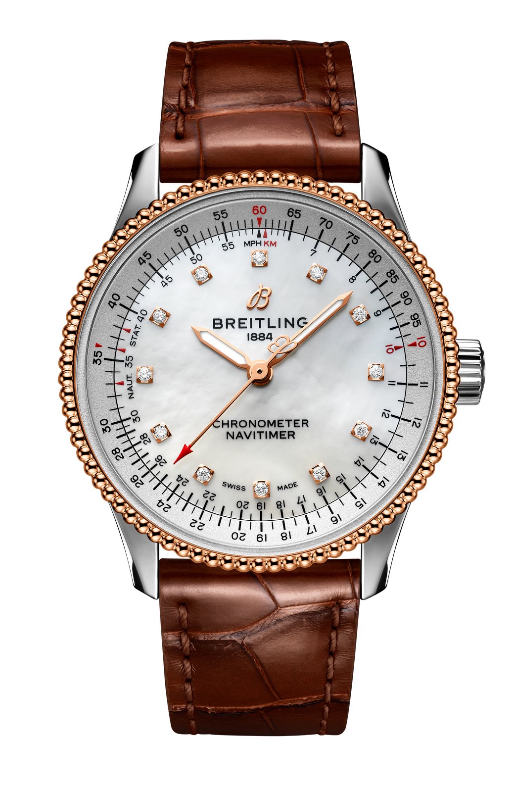 The Breitling Navitimer Automatic 35 is also available as a two-tone watch with a 35-millimetre stainless-steel case and a luxurious 18 k red gold bidirectional rotating bezel. Its white mother-of-pearl dial is highlighted by diamond hour markers, and the watch is presented on a brown alligator leather strap with a pin or folding buckle or a two-tone Navitimer bracelet in stainless steel and 18 k red gold with a folding clasp.