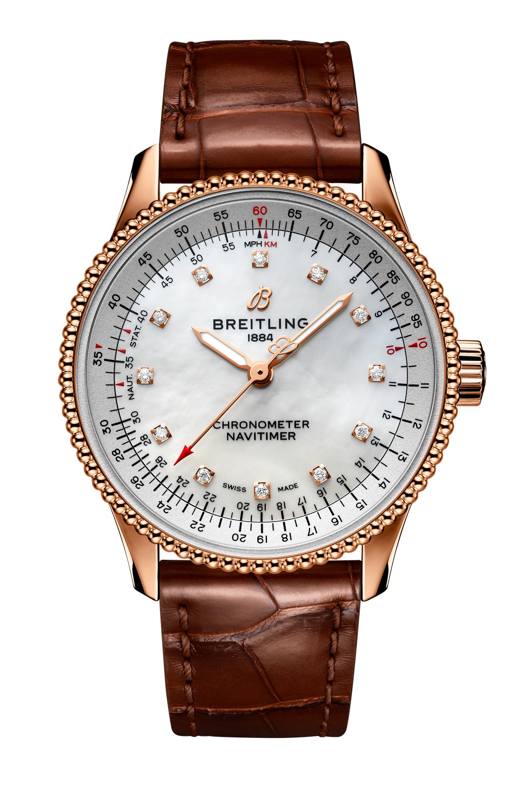 Last but not least is the Navitimer Automatic 35 in 18 k red gold with a white mother-of-pearl dial and diamond hour markers. This striking watch is delivered with either a brown alligator leather strap with an 18 k red gold pin or folding buckle or an 18 k red gold Navitimer bracelet with a butterfly clasp.