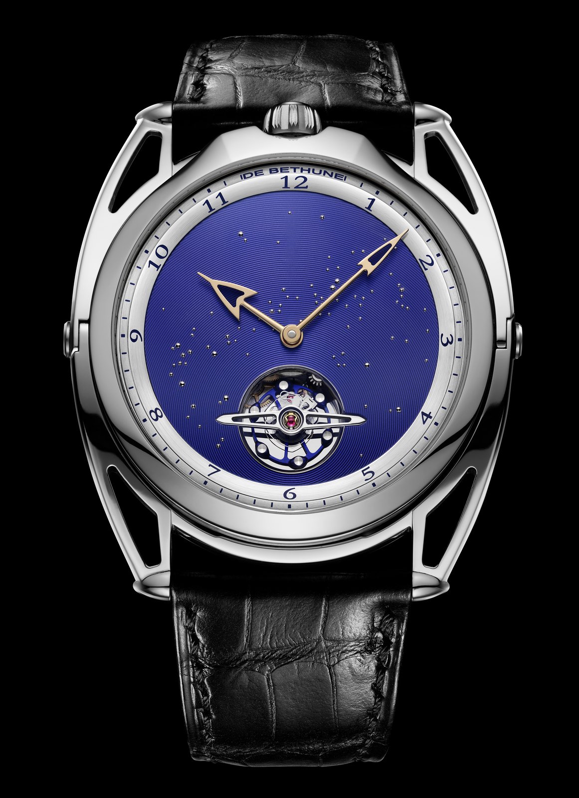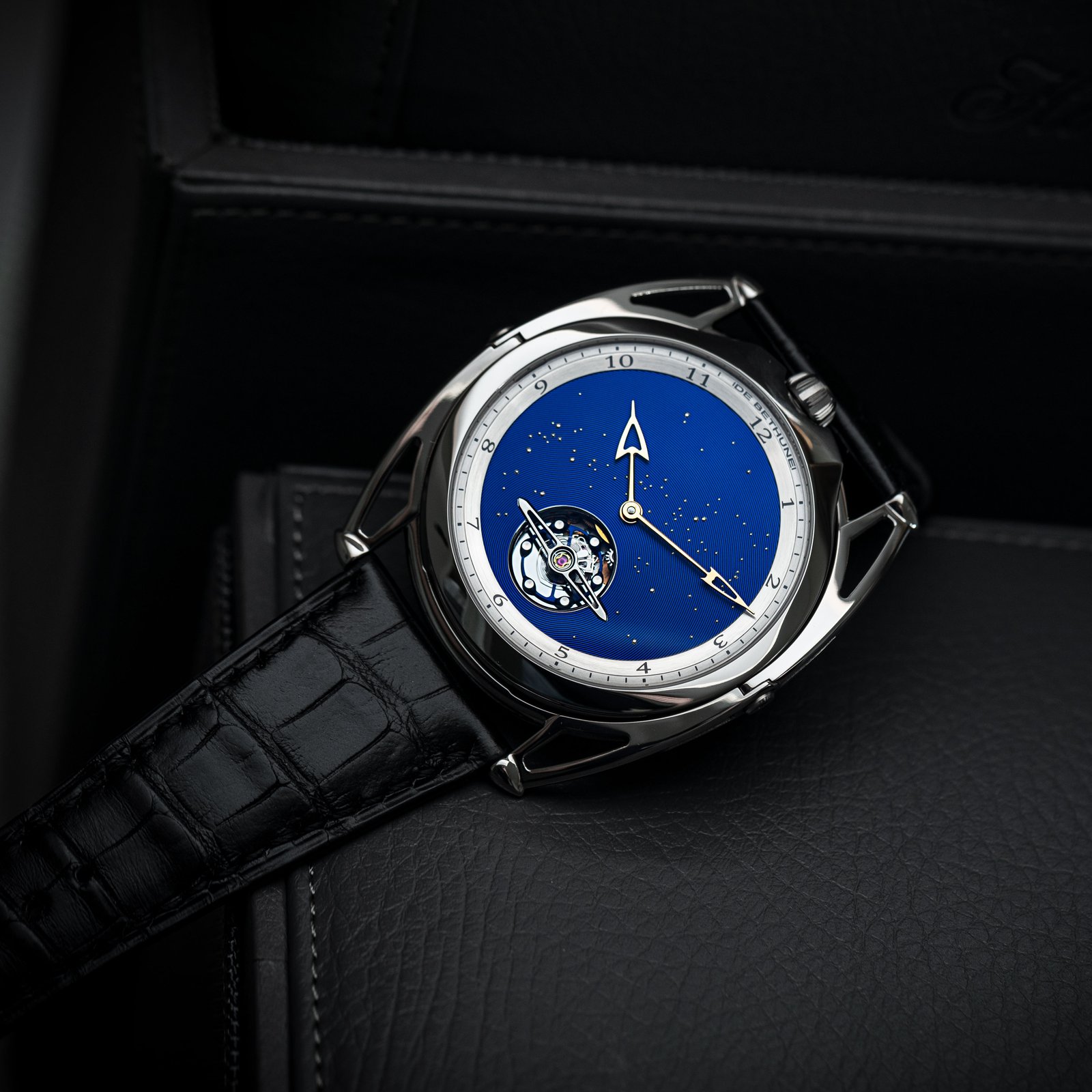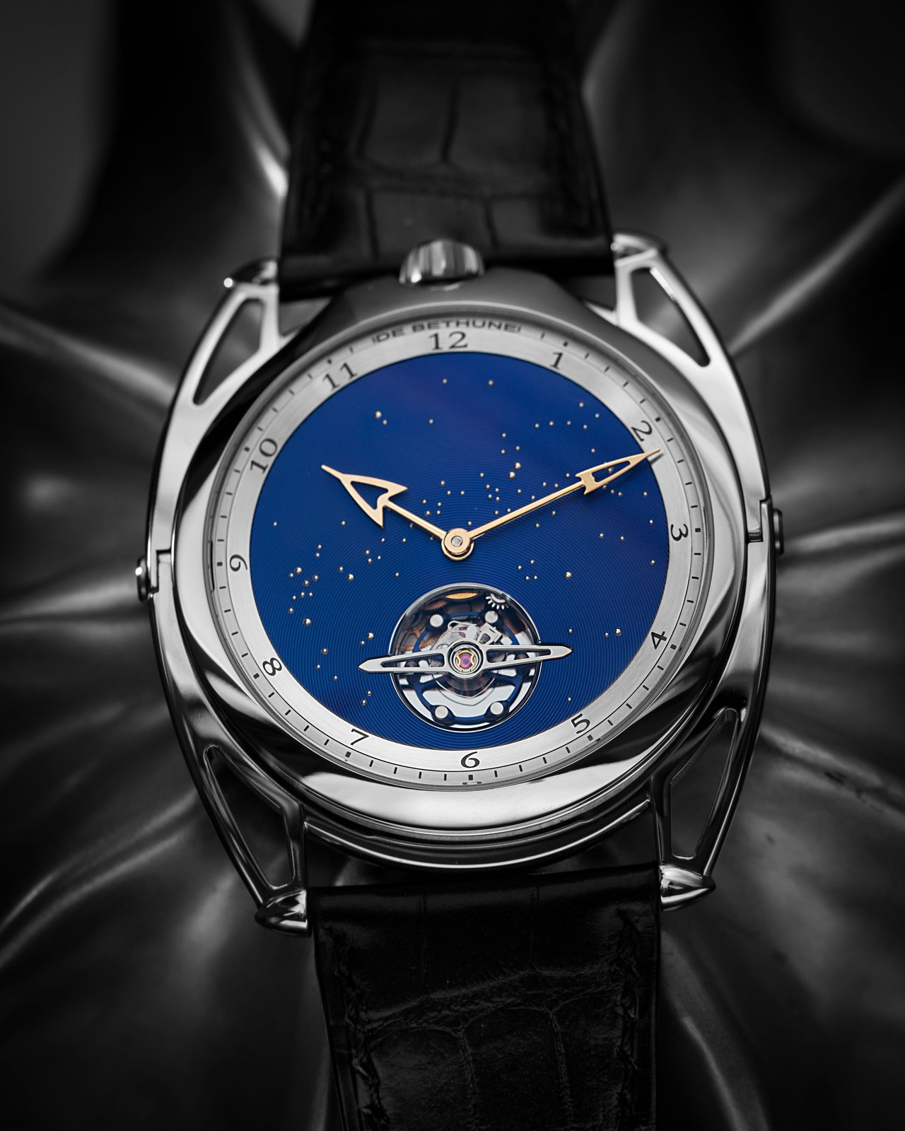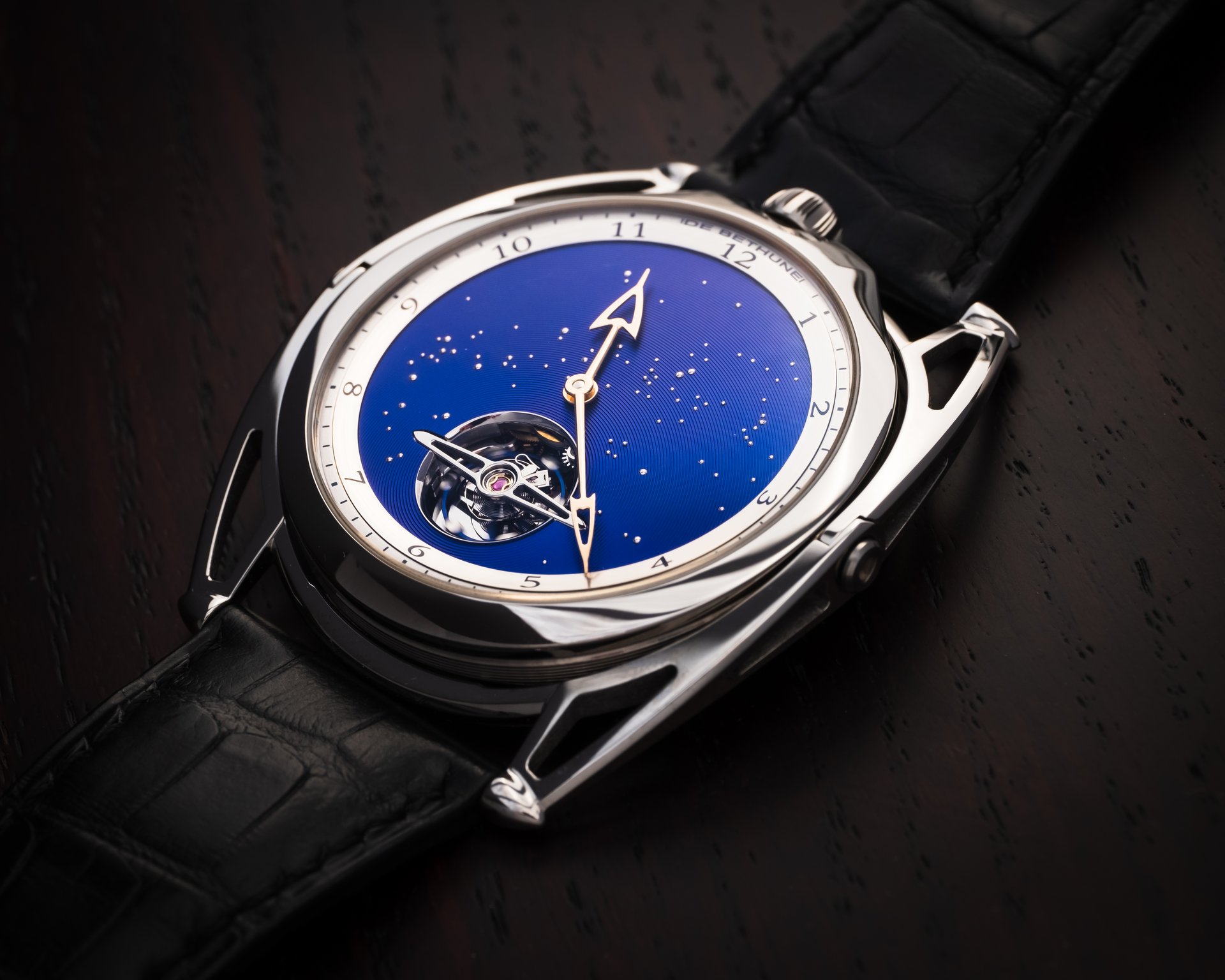 A watch that offers a firmament to behold, one in which the infinite blue unfolds. A nocturnal window to the far reaches and depths of space, the quest for perfection and beauty never truly leaves Denis Flageollet. The designer and crafter, Master Watchmaker, signs this of this exceptional timepiece of pure style, where the dramatic arc of tension in the lines meets the finesse of the case, with the hallmarks of the contemporary expression of the art of watchmaking by De Bethune.