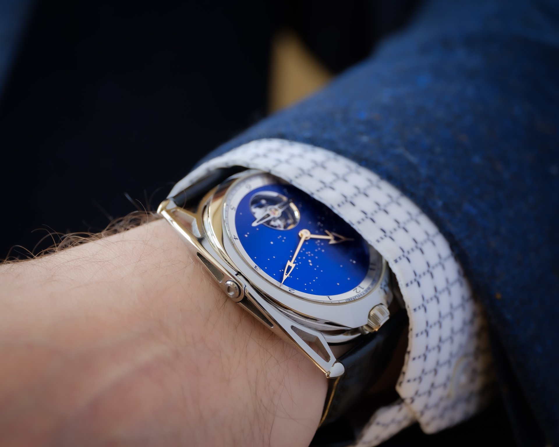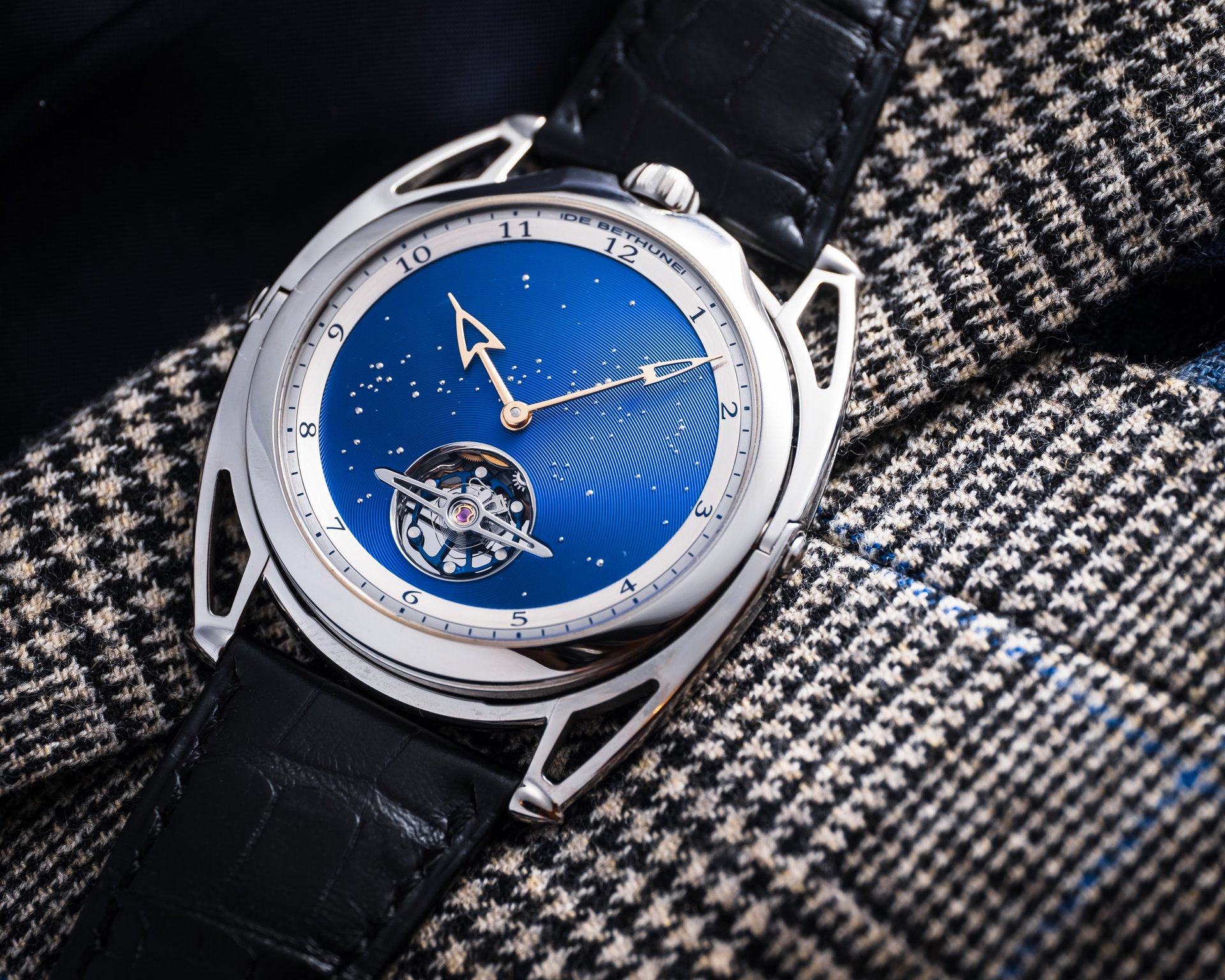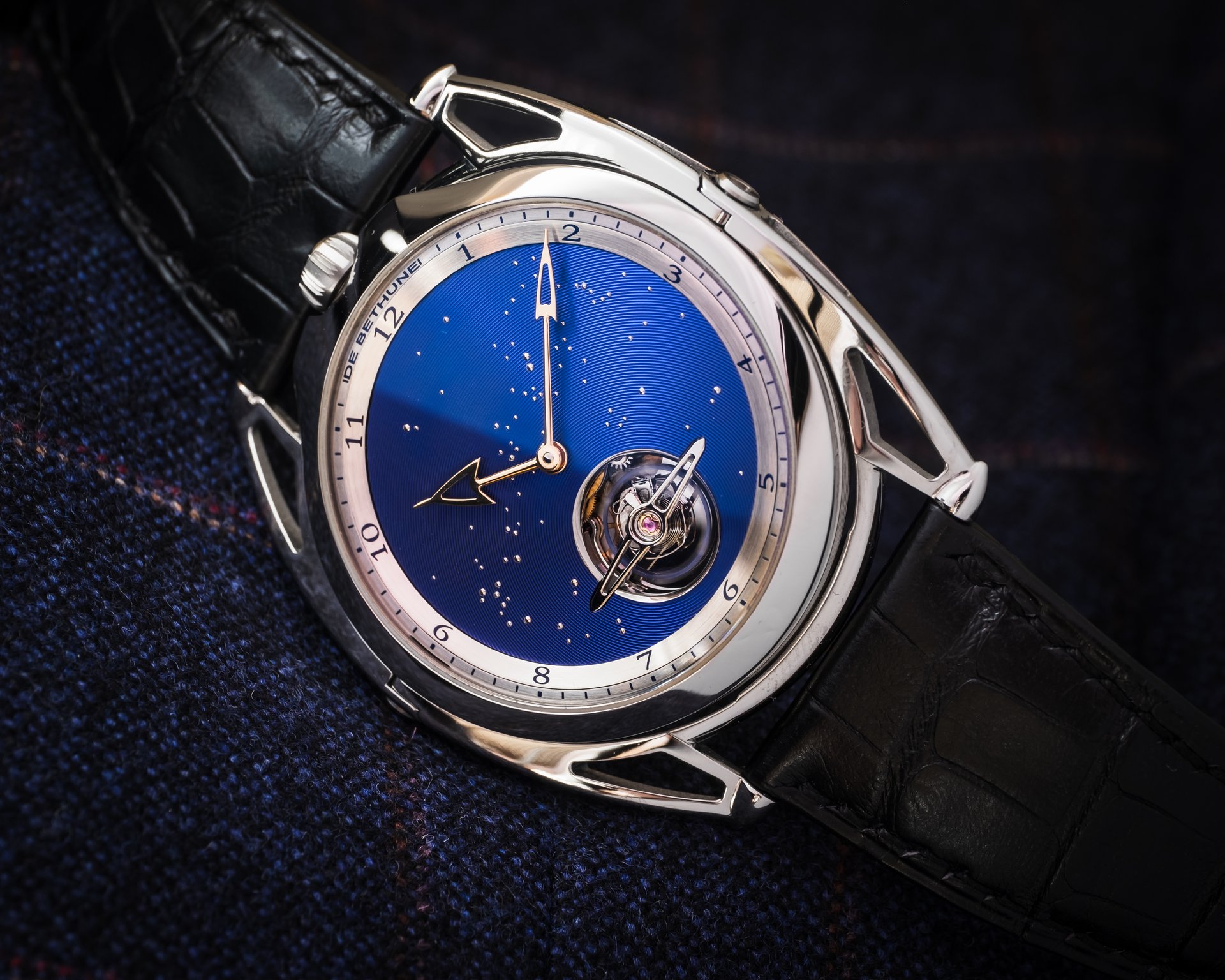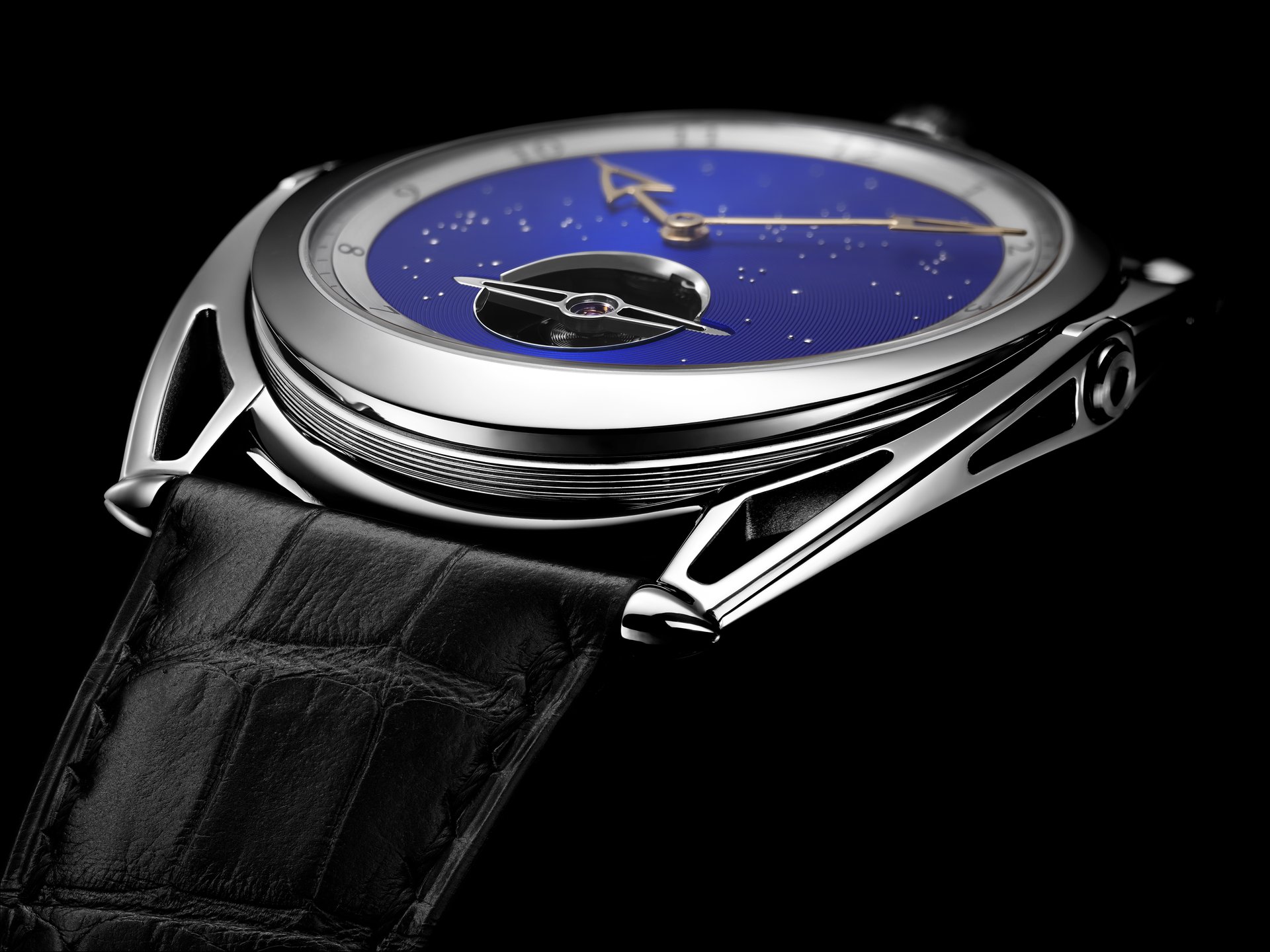A watch that offers a firmament to behold, one in which the infinite blue unfolds. A nocturnal window to the far reaches and depths of space, the quest for perfection and beauty never truly leaves Denis Flageollet. The designer and crafter, Master Watchmaker, signs this of this exceptional timepiece of pure style, where the dramatic arc of tension in the lines meets the finesse of the case, with the hallmarks of the contemporary expression of the art of watchmaking by De Bethune.