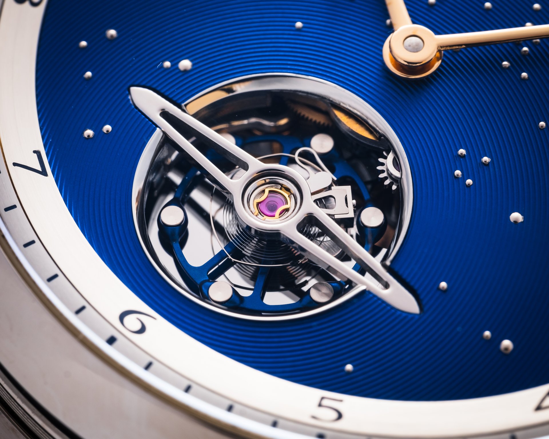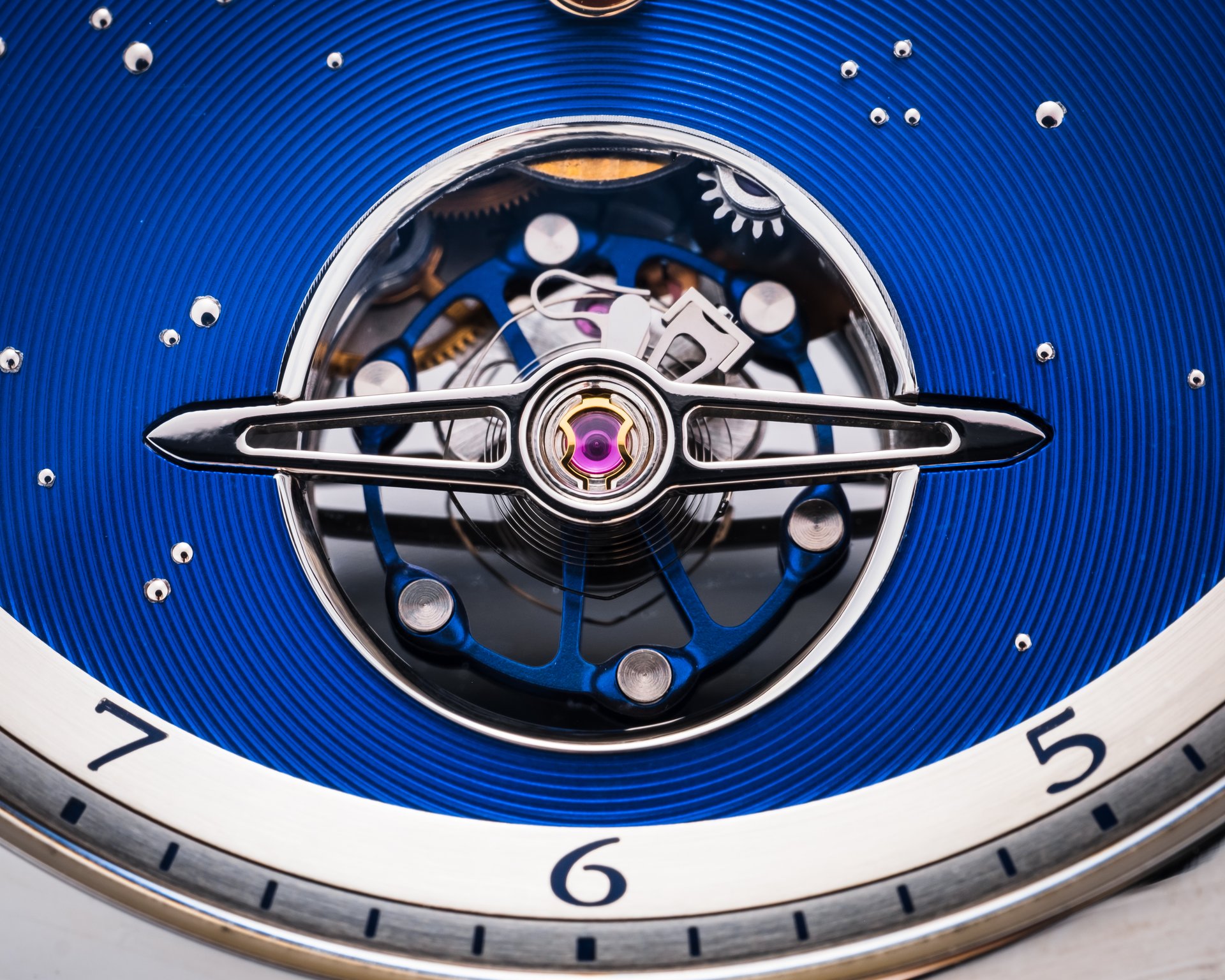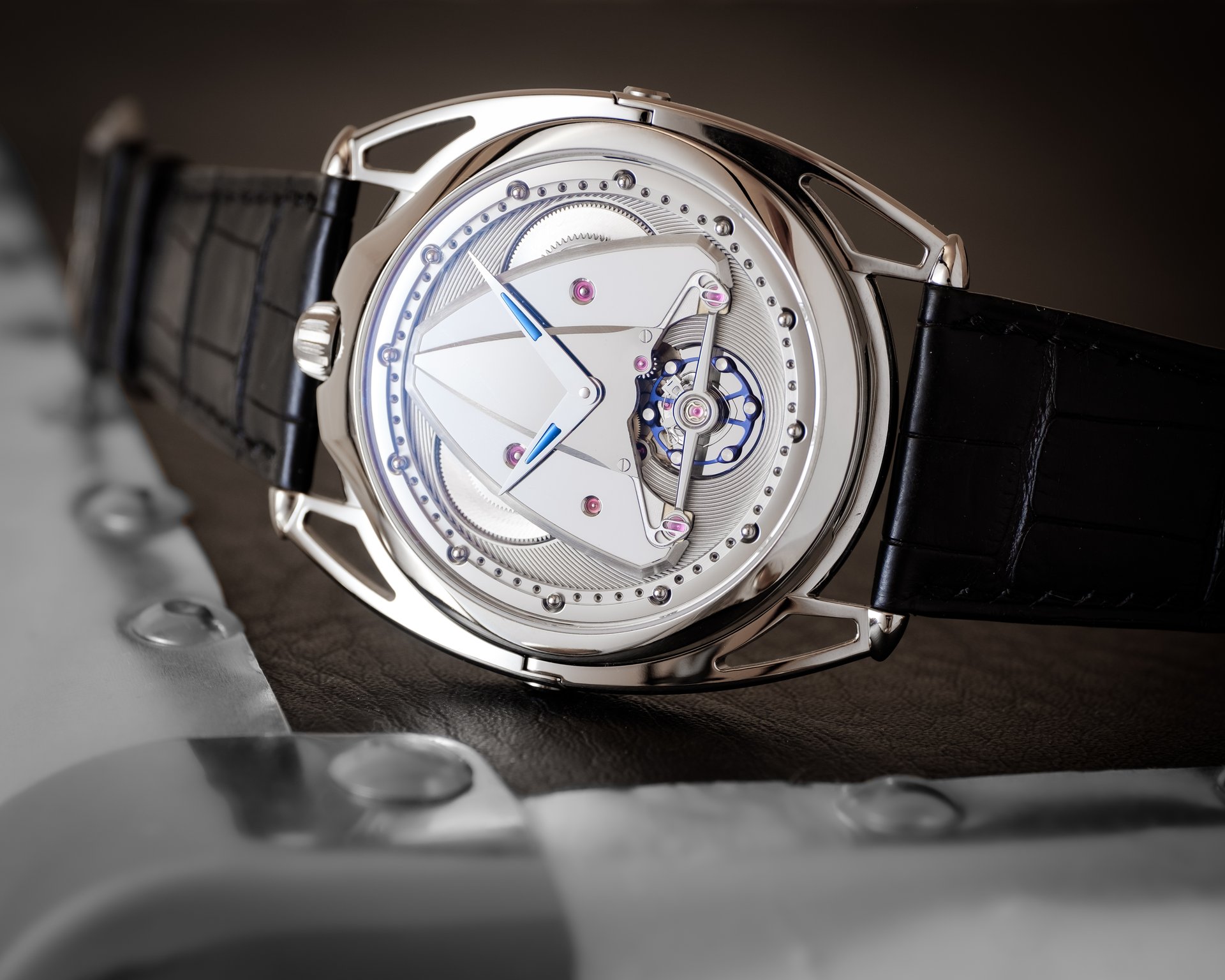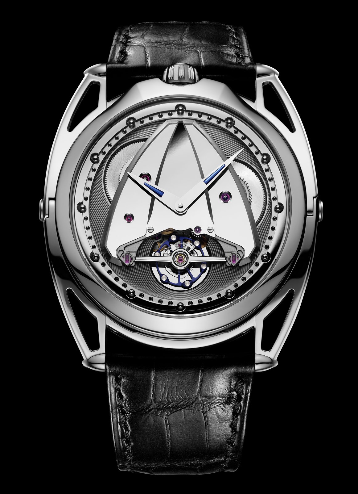 - Dial featuring an opening revealing the balance, surrounded by a chamfered polished steel rim
