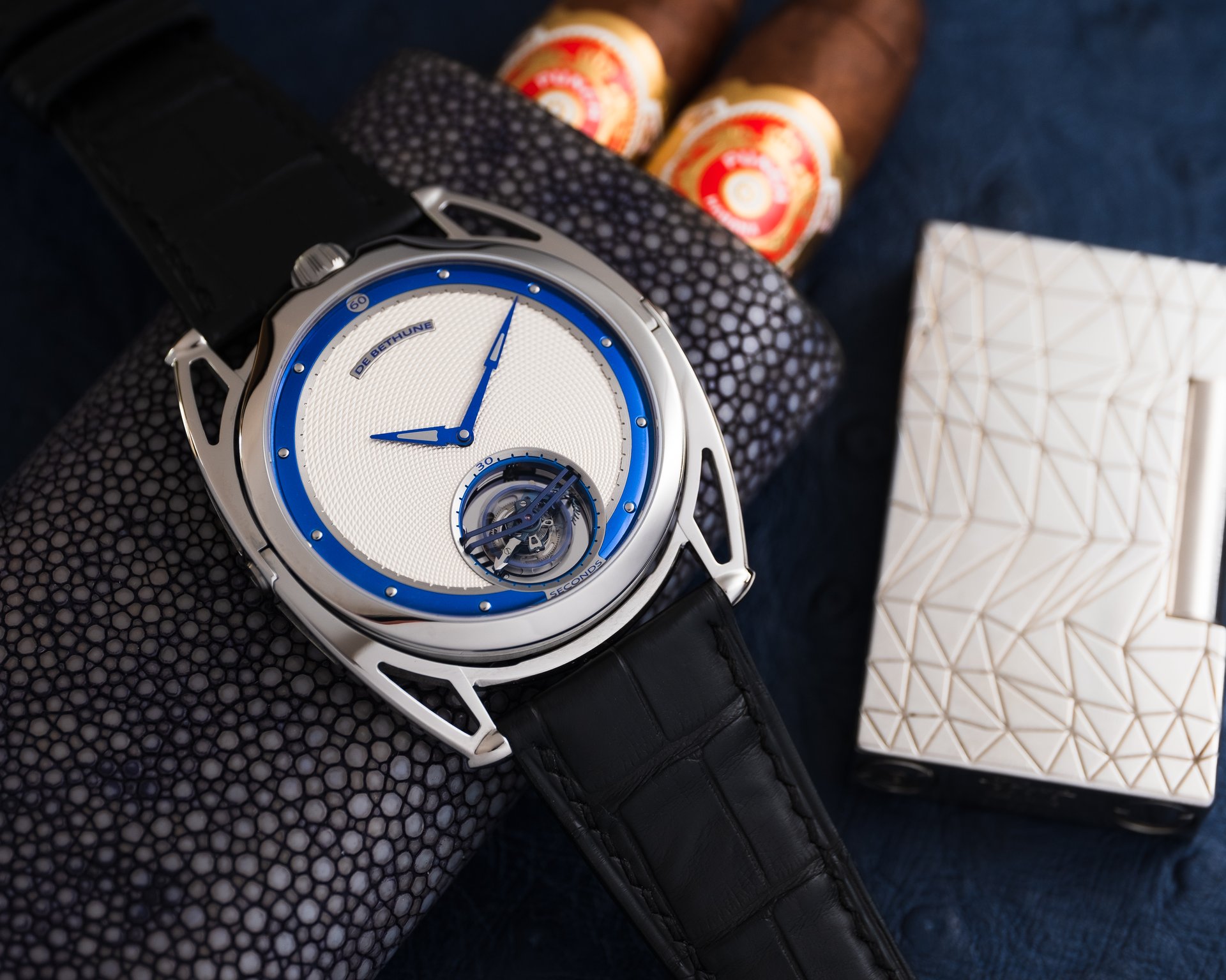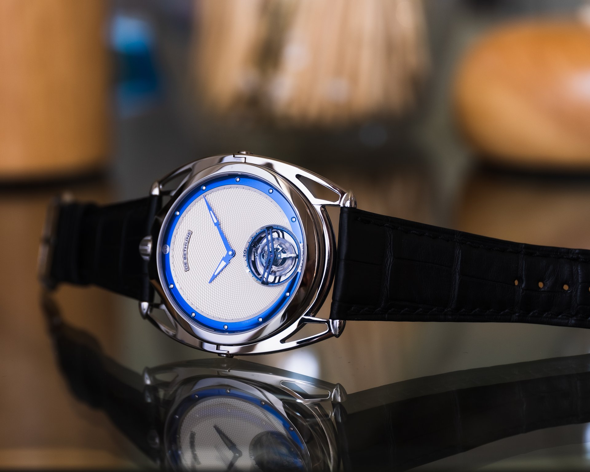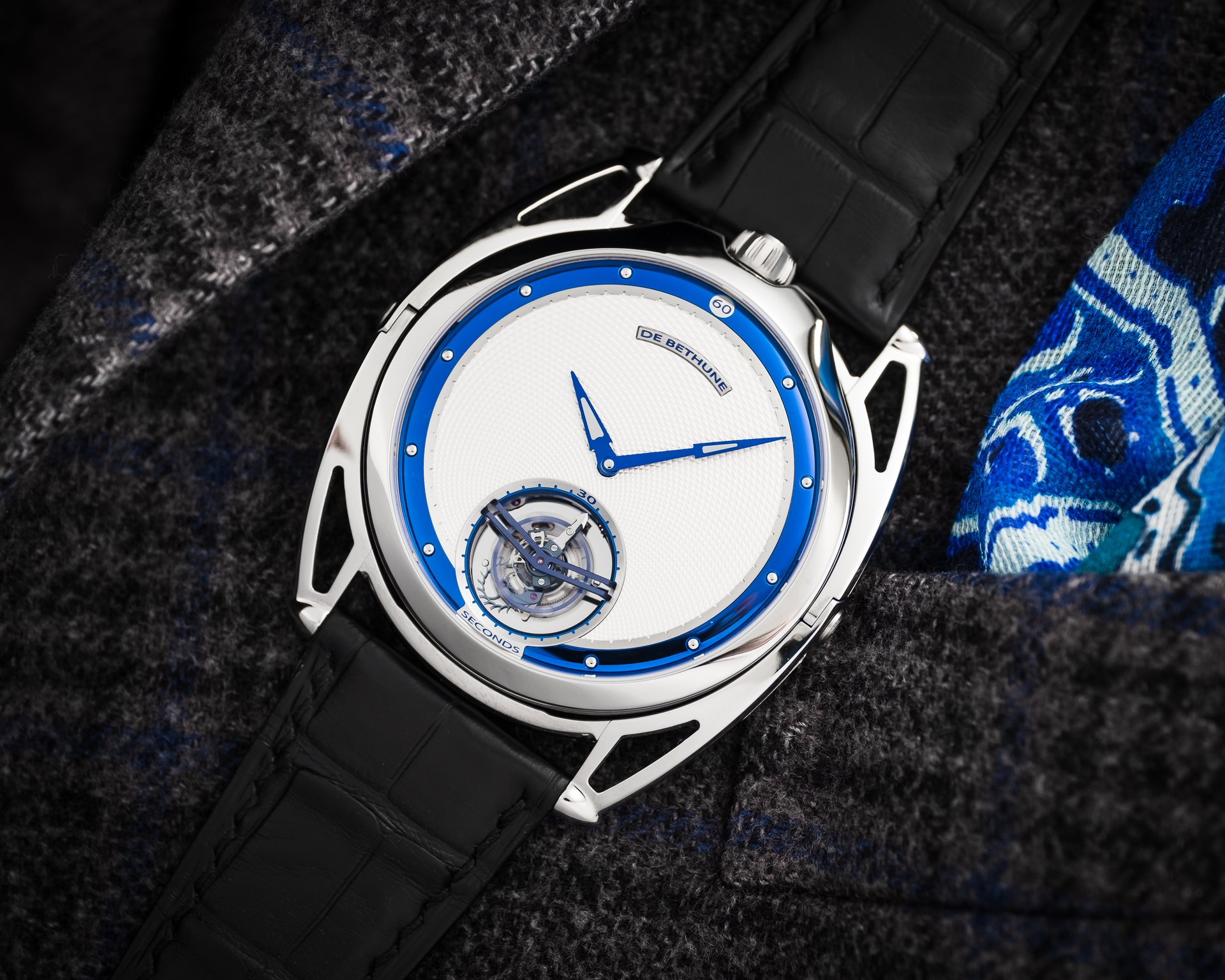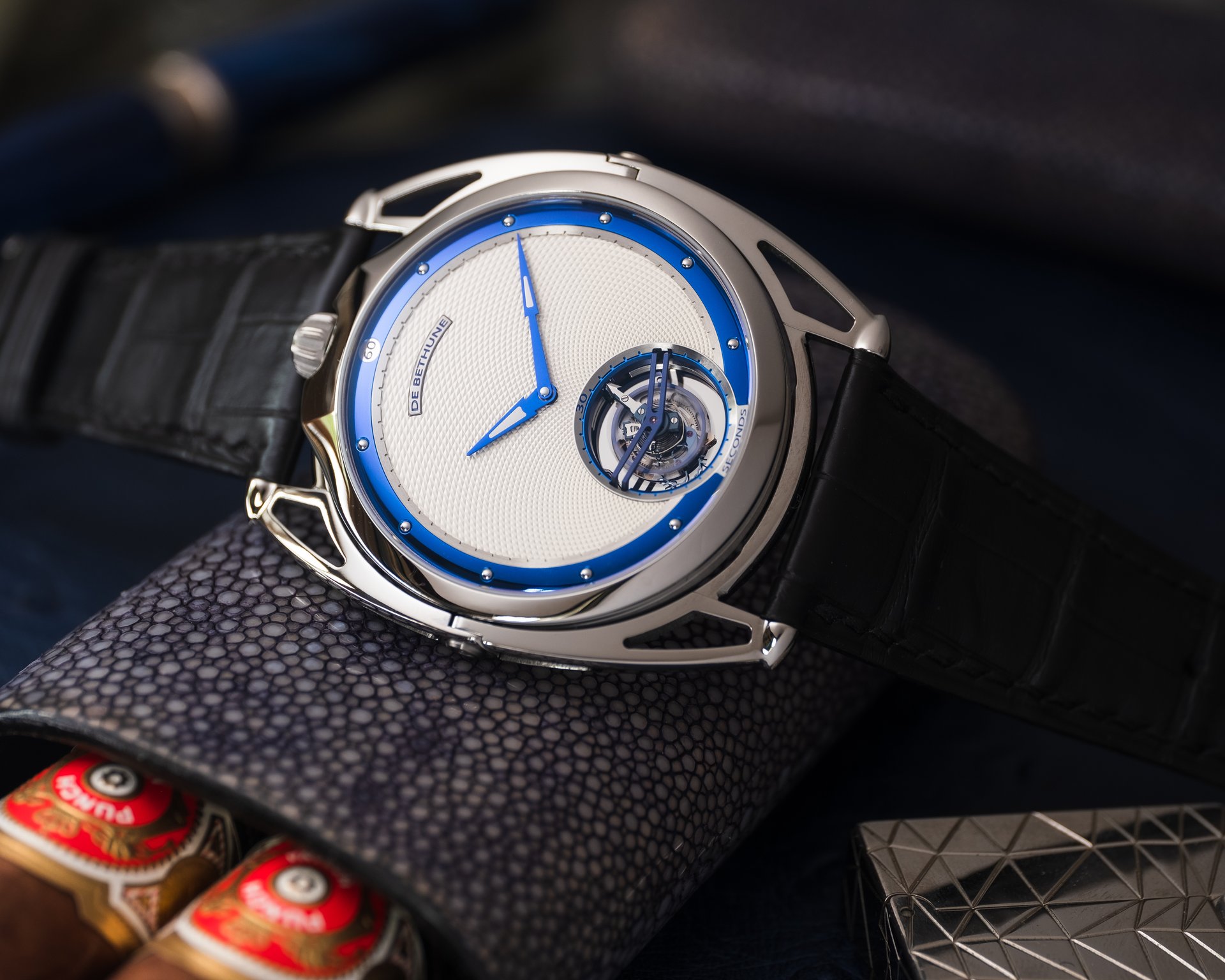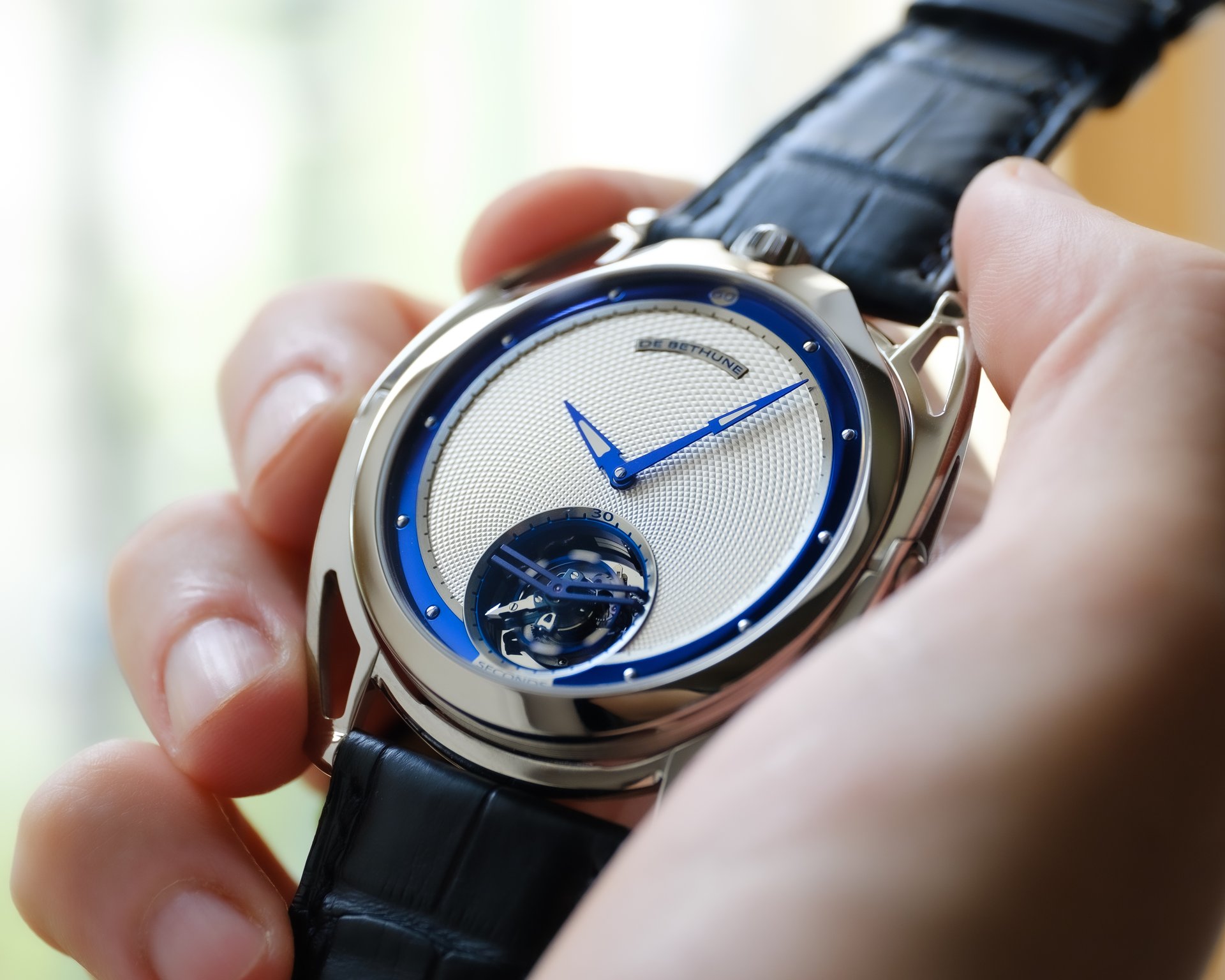 Finally, as a discreet De Bethune signature, the blued titanium inserts in the hands at the centre.