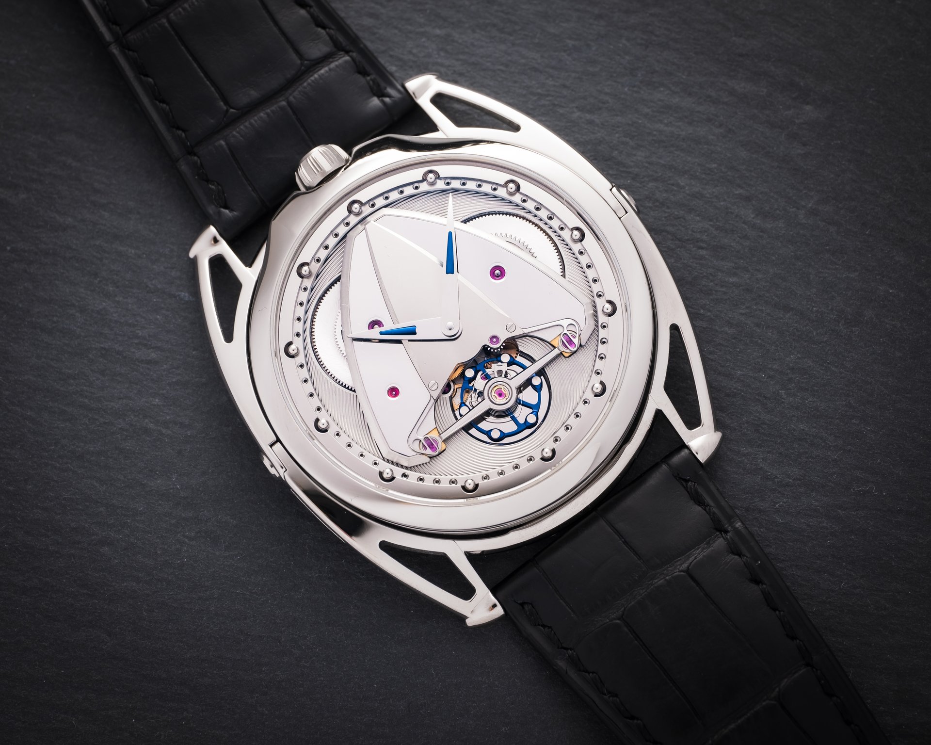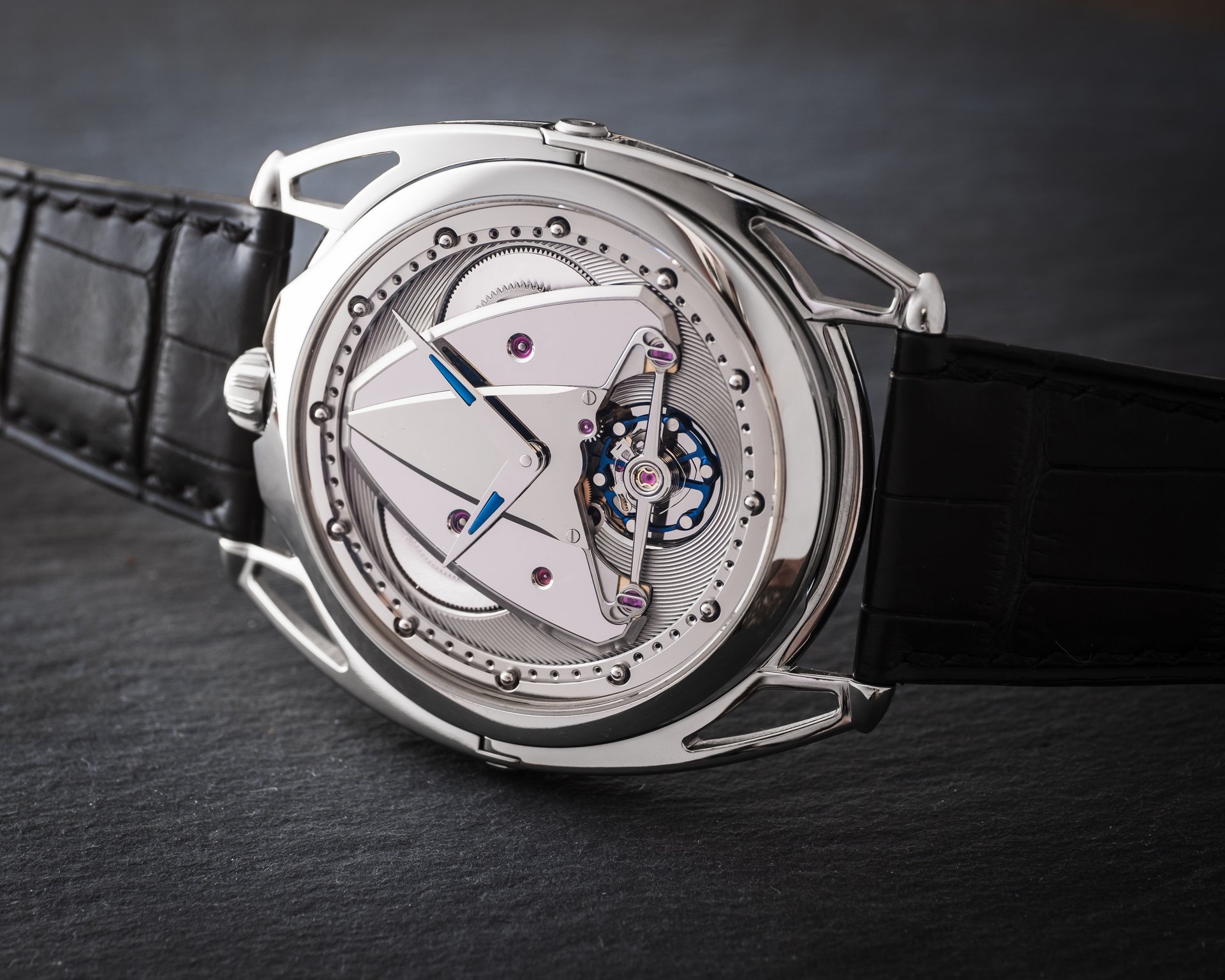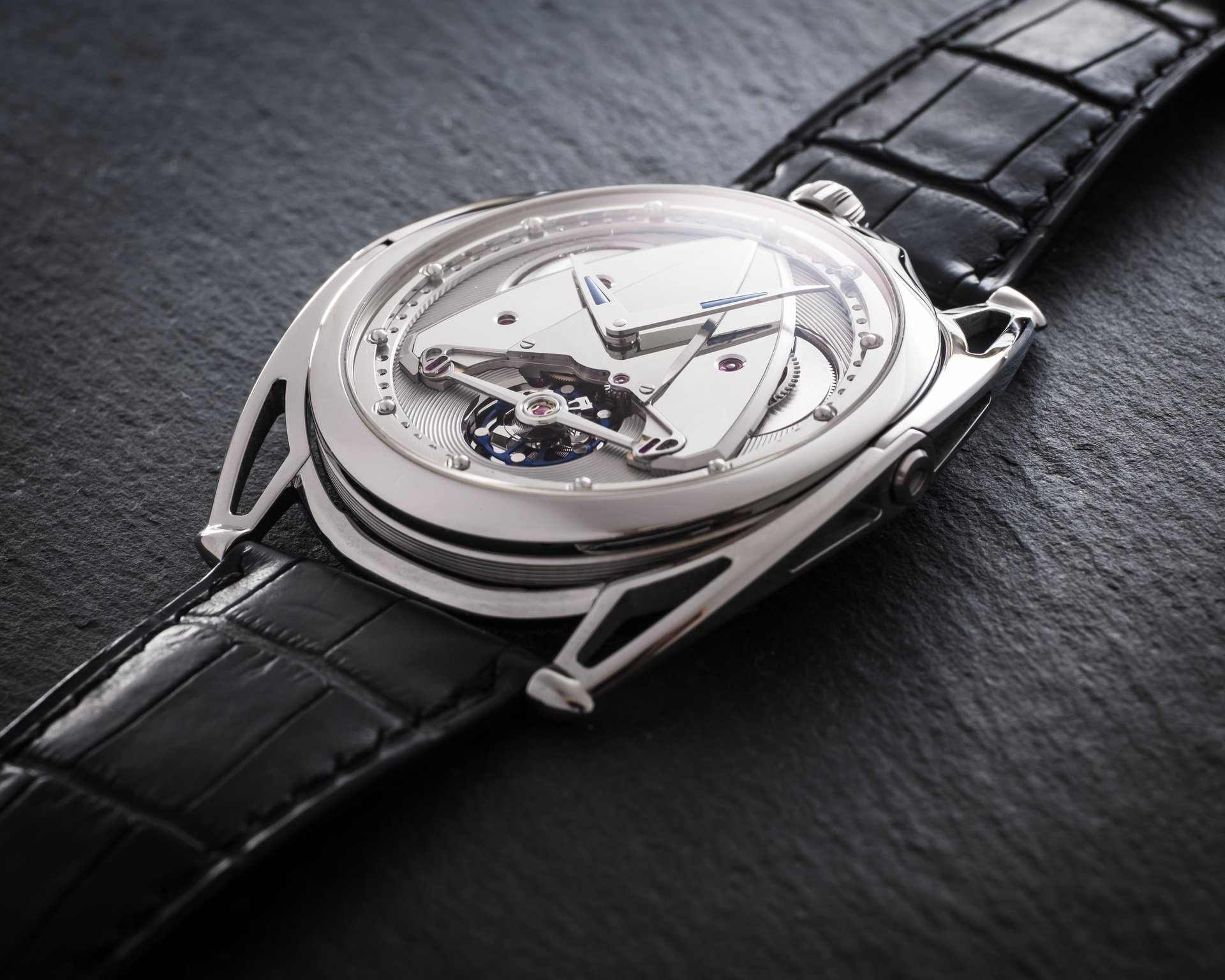 Another challenge was to preserve the functionality and wear comfort of De Bethune’s famous floating lugs. Adapting this hallmark to a much thinner case was also a circle whose squaring Denis Flageollet particularly relished. As much a technical challenge as an aesthetic one, it concretises the complexity of the “ultra-thinness” to be mastered. This in itself was also an adventure in which absolute rigour was the connective tissue between form and functionality.