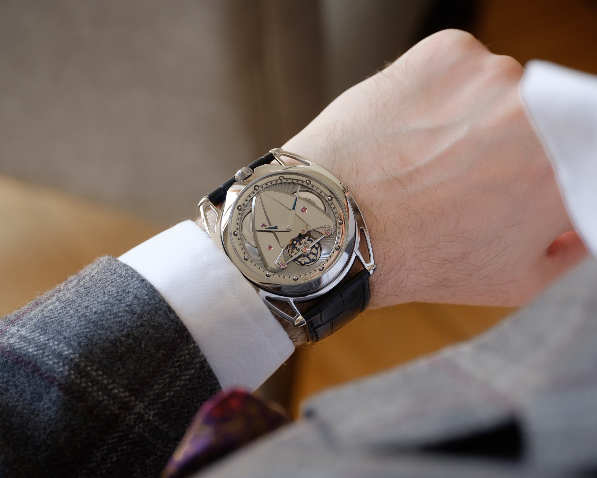 Today, a watch worn on the wrist is subjected to more action than may be safely compensated for. Position are abrupt and sometimes chaotic. The kinetic forces inflicted on a mechanical watchmaking movement should give pause. Just as Breguet had invented the tourbillon to meet the constraints of marine watches, De Bethune designed a tourbillon for the new dynamics of wristwatches. The laws of physics are clear: To compensate for the violence of wrist movements, the tourbillon cage must be as light as possible, operate at maximum frequency and speed of rotation at minimum weight and inertia. Only then can it fulfil its function in a watch for today.
