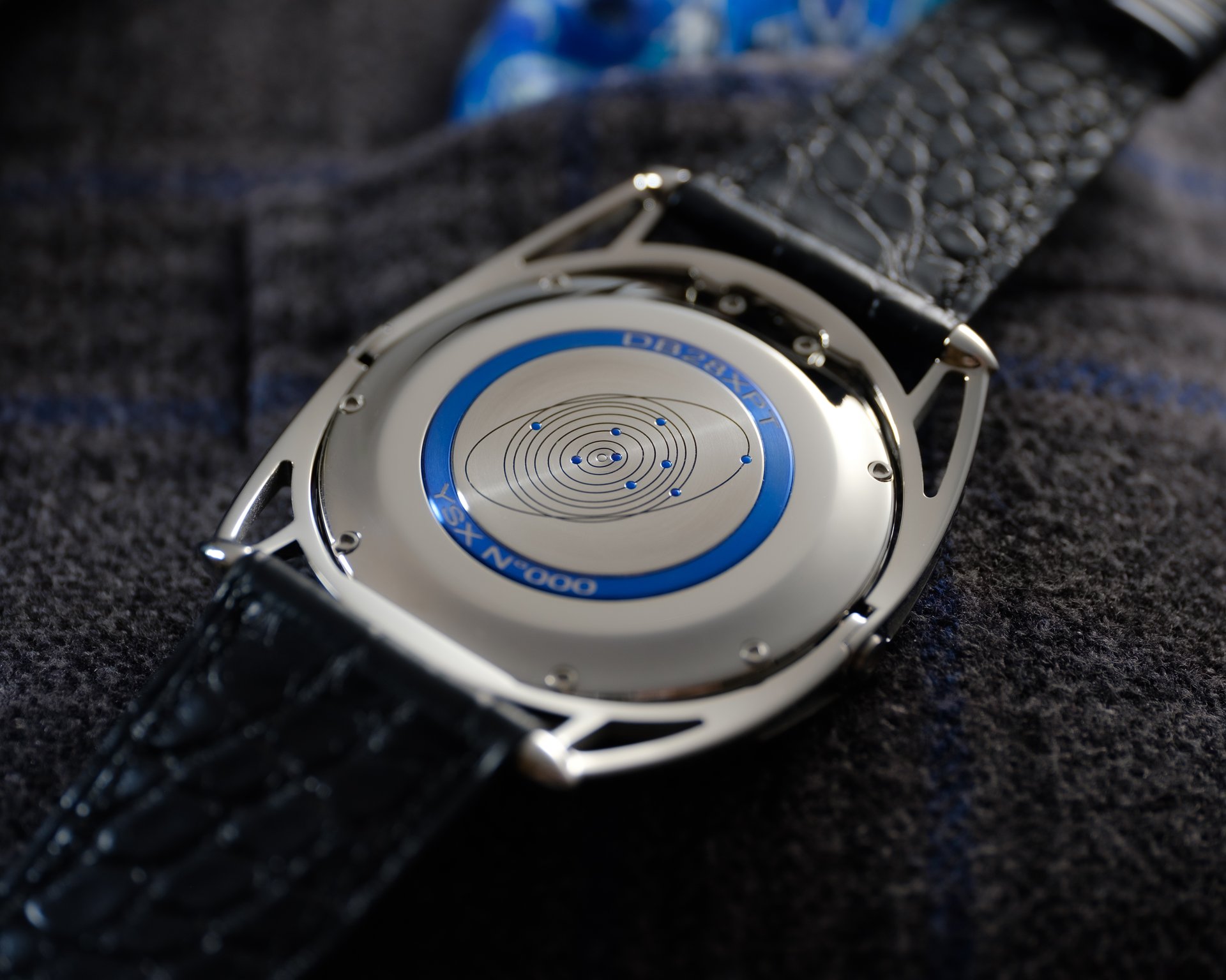 On the case back, as a nod to the Aiguille d’Or – the highest distinction of the Grand Prix d’Horlogerie de Genève – awarded to the first DB28: The position of the planets is that in the evening sky over Geneva when the prestigious prize was presented on November 19th, 2011.
