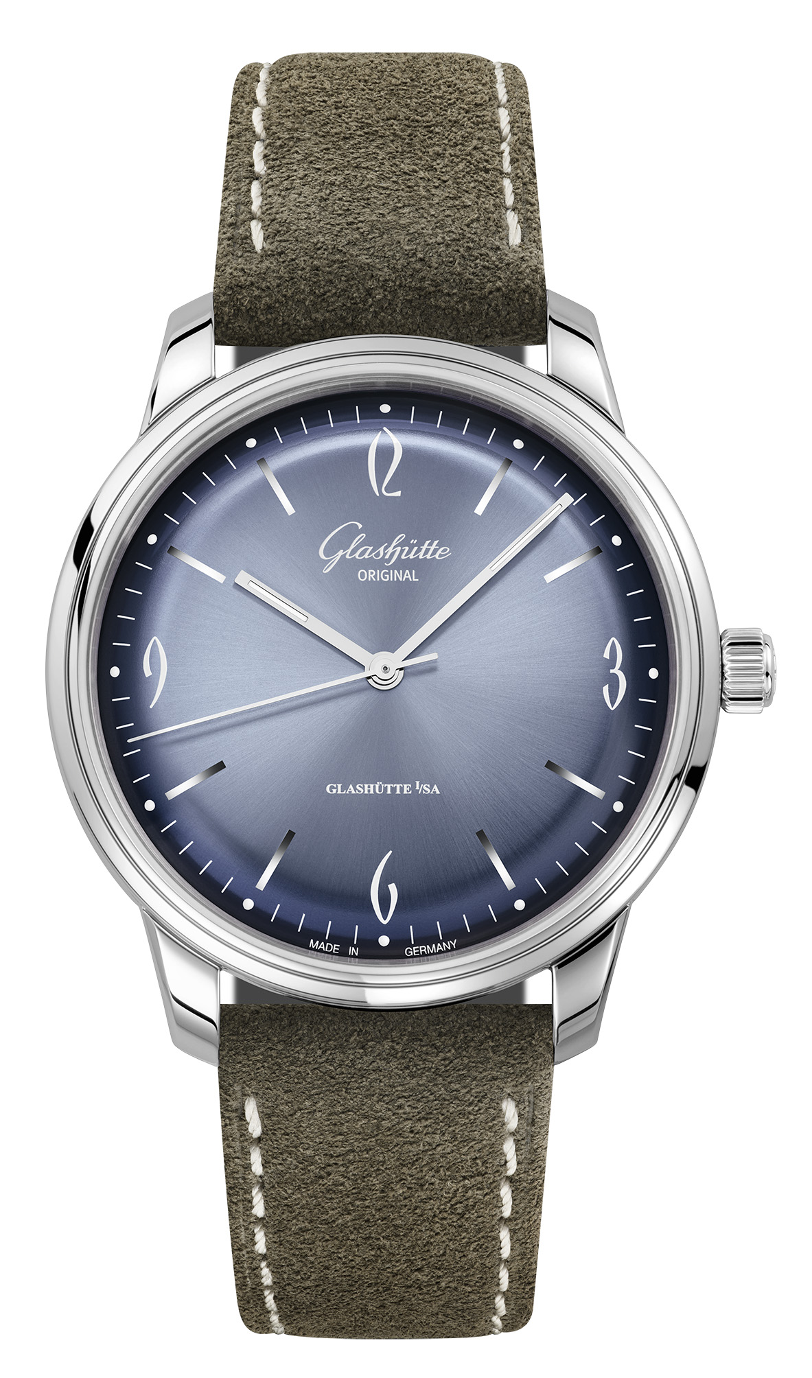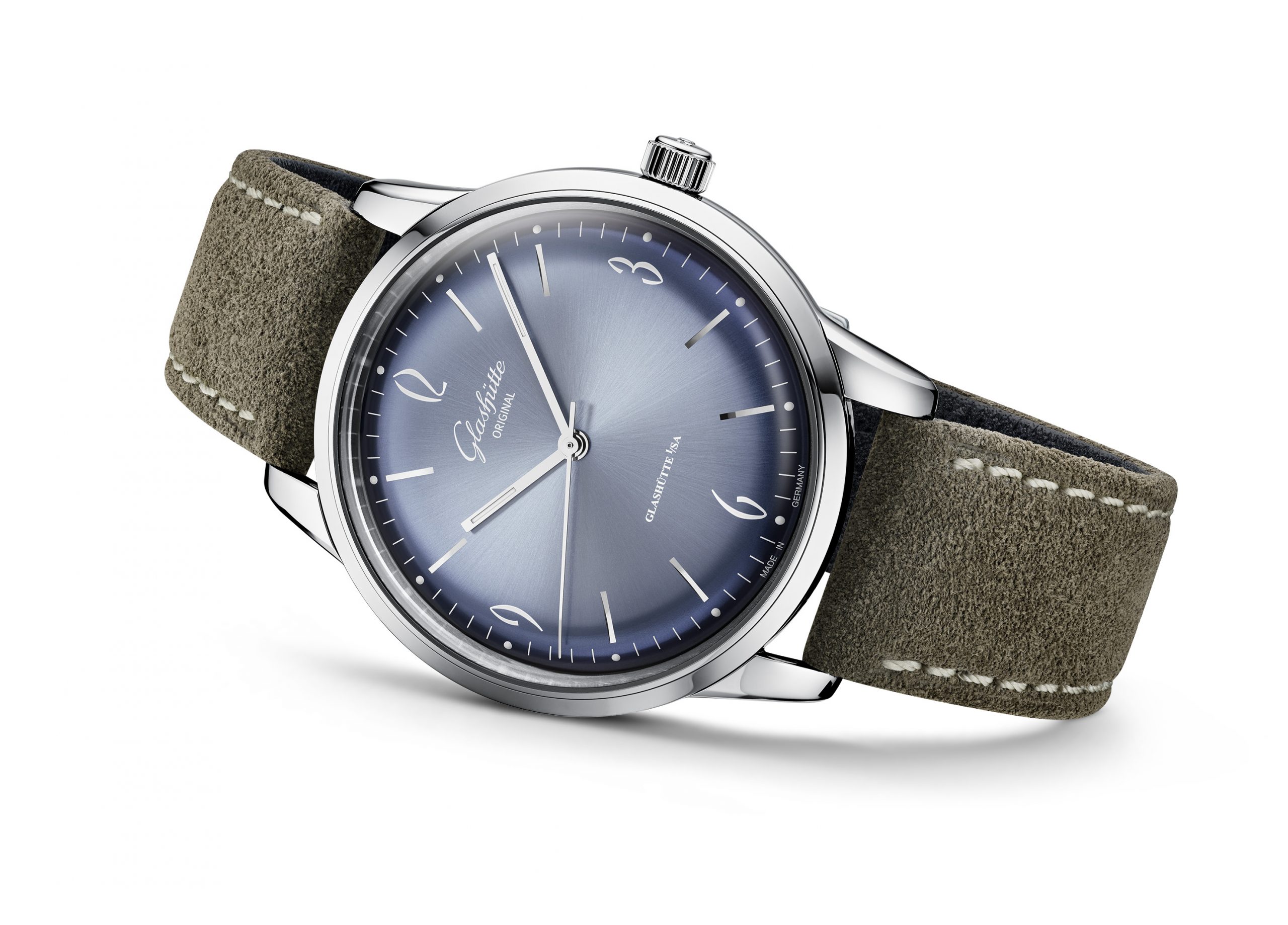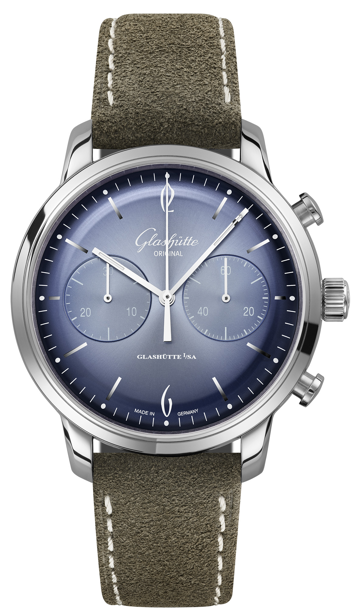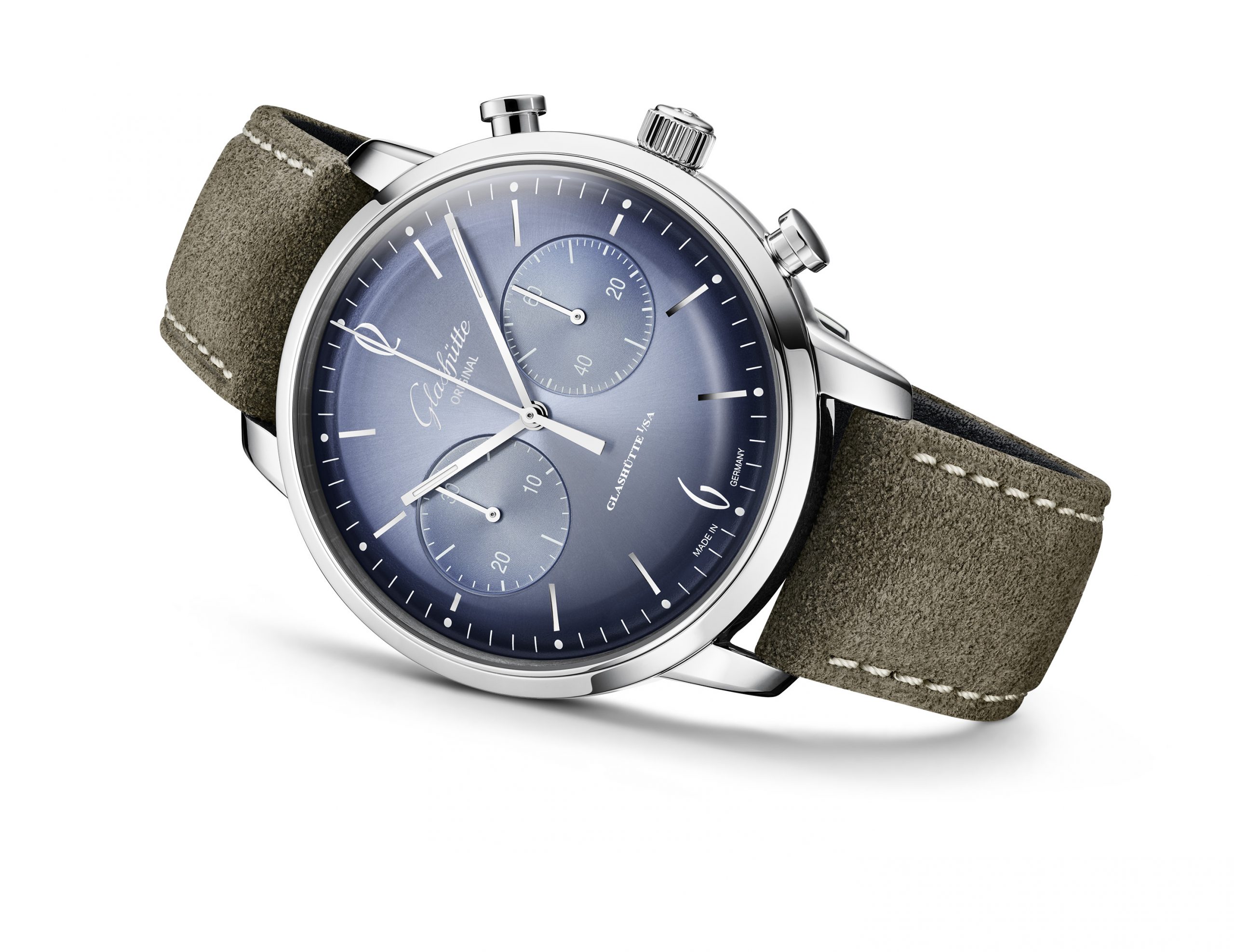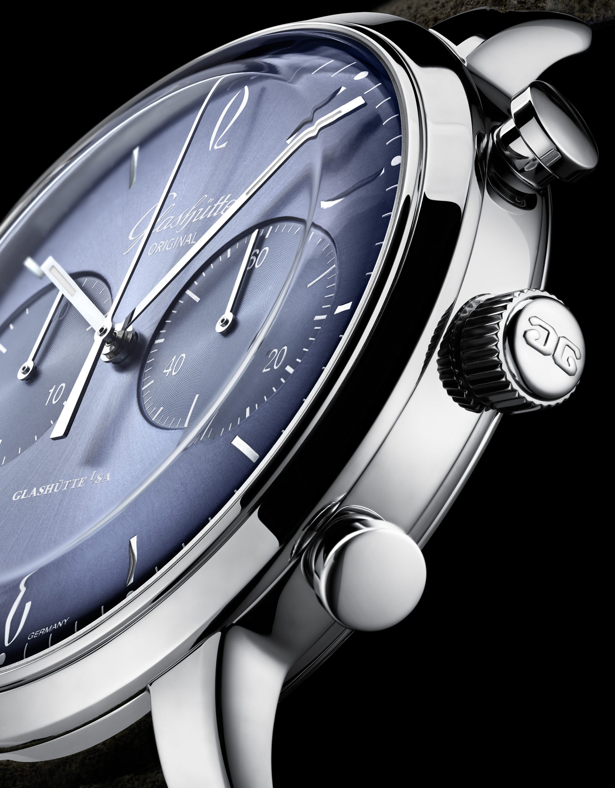 he cool shimmer of the dials is the work of experts in Glashütte Original’s in-house dial manufactory in Pforzheim, Germany. There the dial blanks are first given a delicate sunray finish before being pressed into their characteristic domed shape and given a galvanic nickel coating. To achieve the striking dégradé effect they are then sprayed with dark blue lacquer, which first gives them a dark edge. Then the entire surface of the dial is given a coat of glacier blue lacquer. This elaborate hand-crafting results in the individual colour gradient that renders each dial unique.