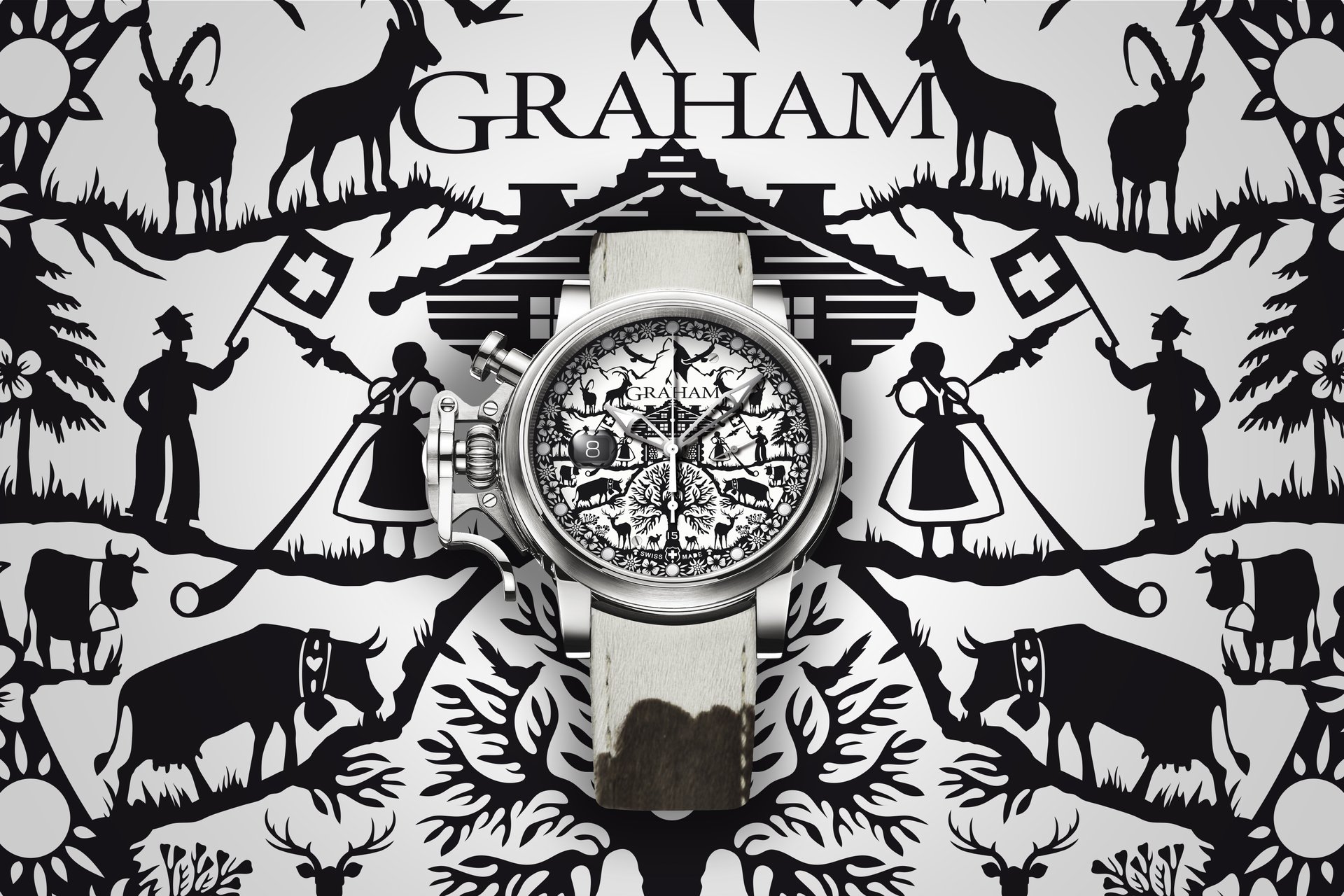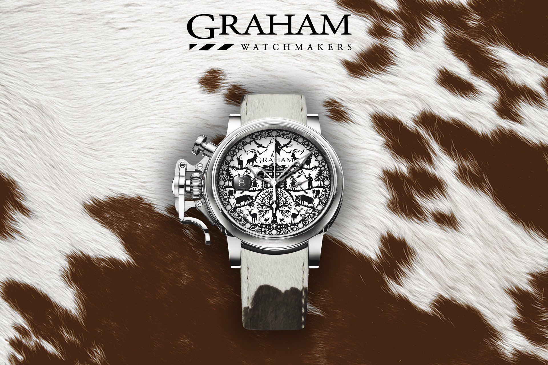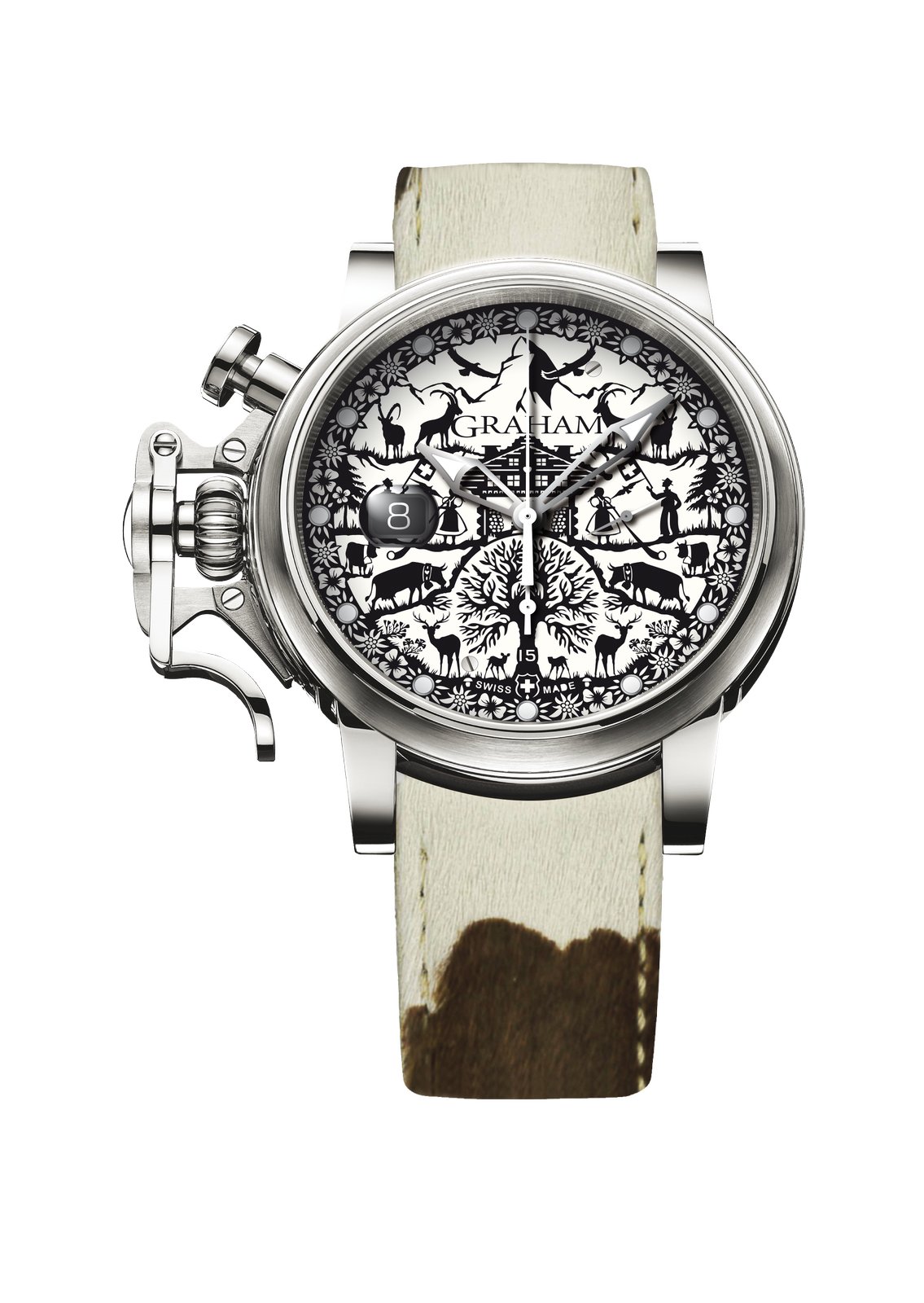Combined with a brown and white cowhide strap, the watch pays tribute to the Swiss heritage of beliefs and usages as well as the memory of ancestors.