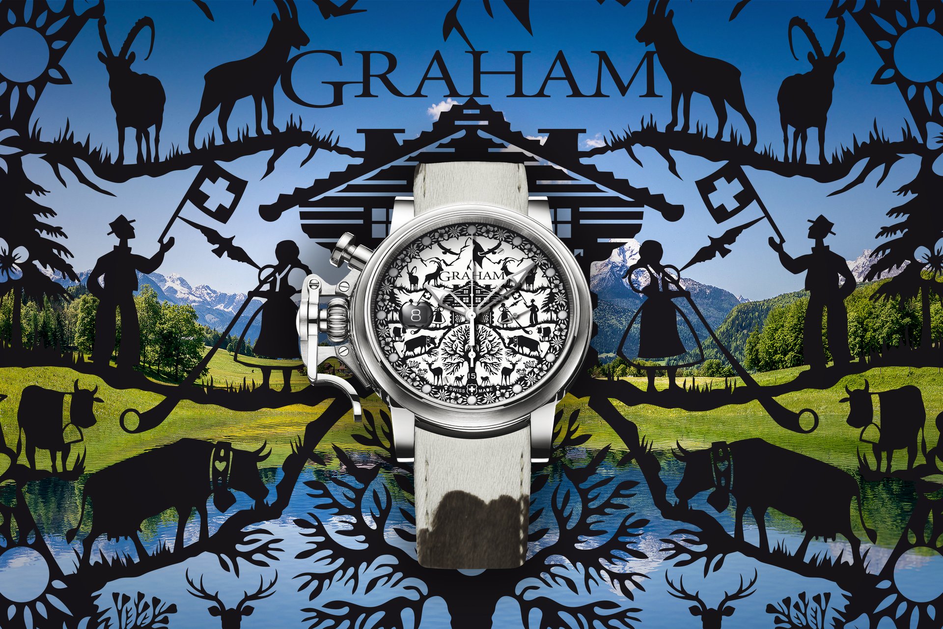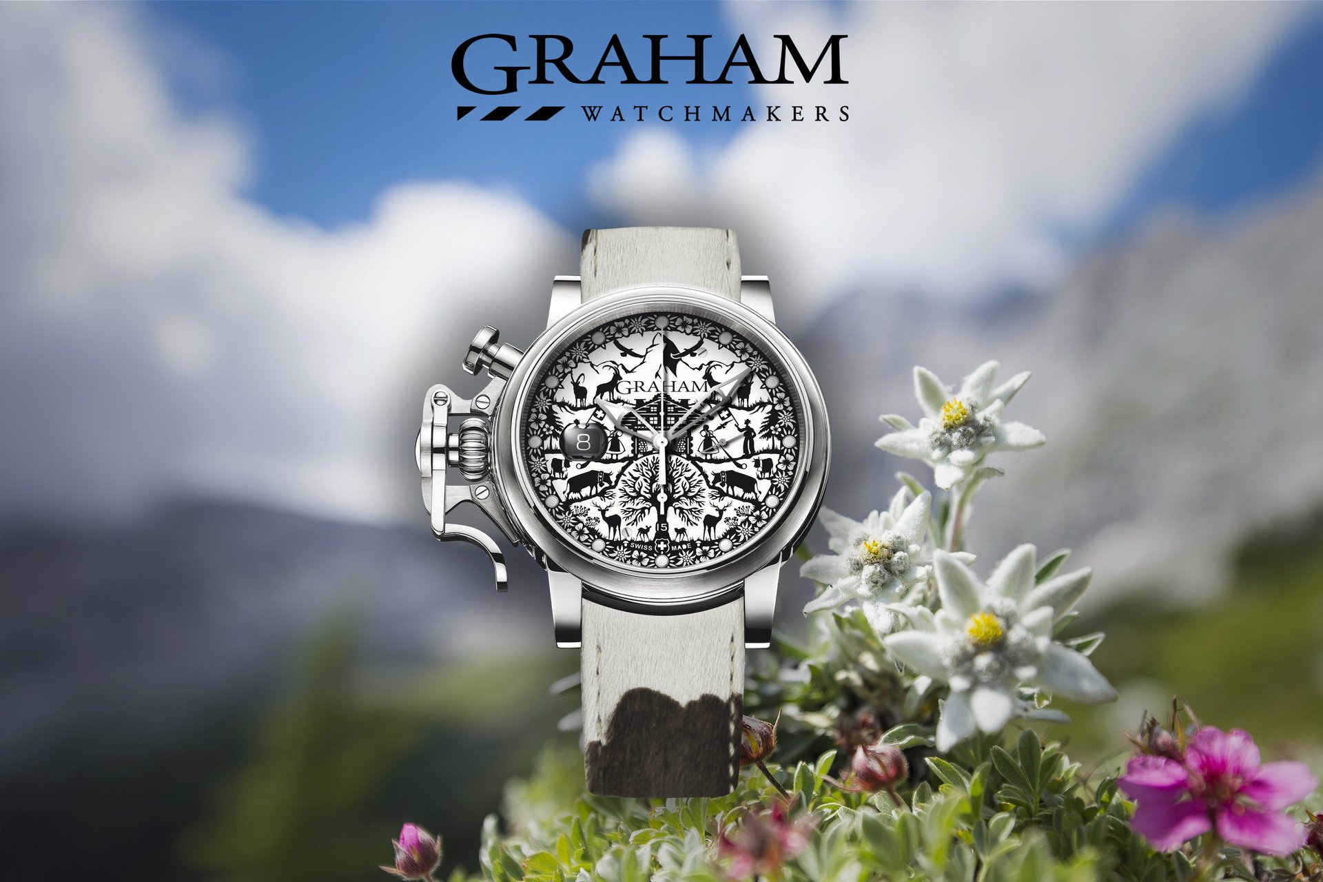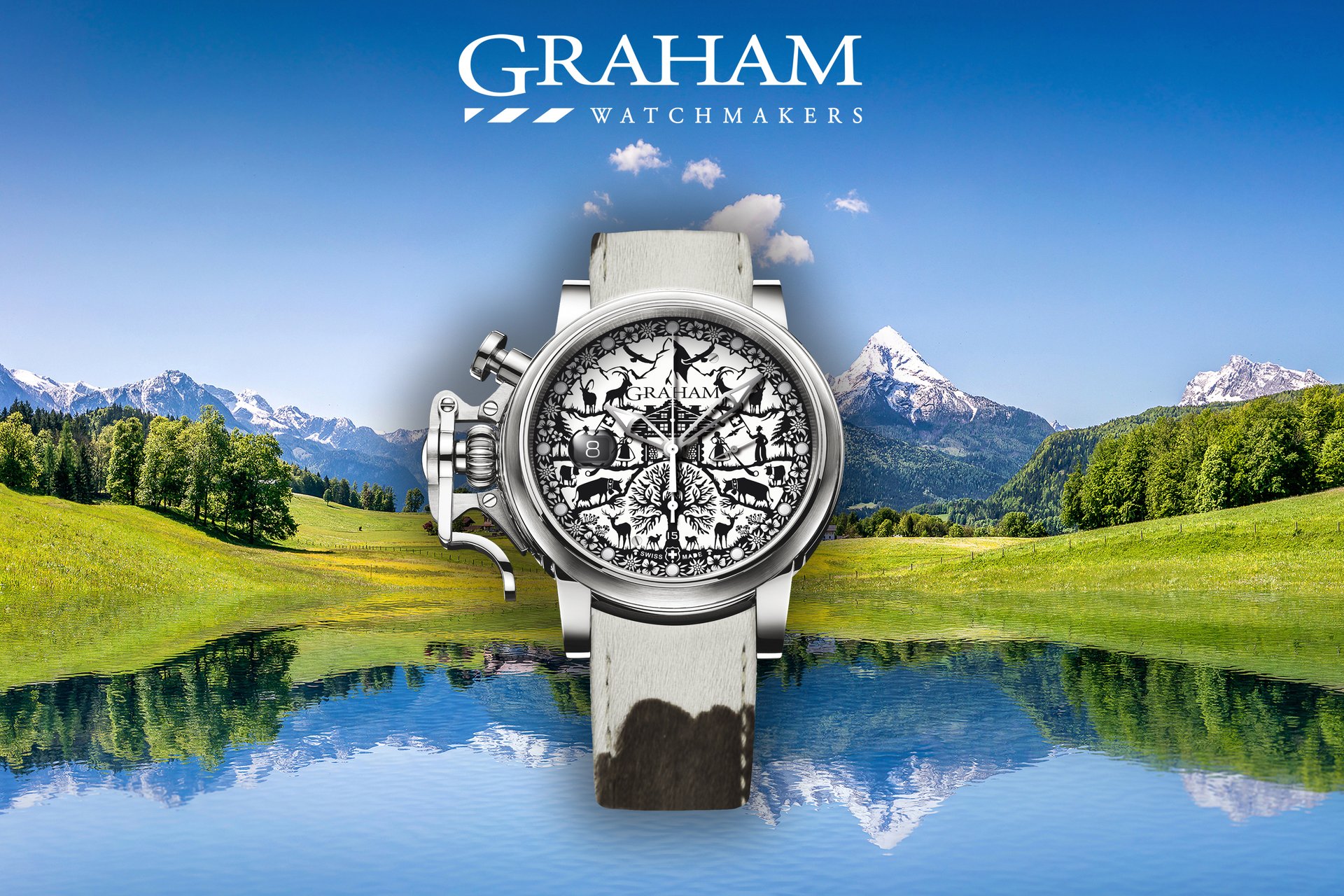 Graham 1695 continues the series of Grand Vintage with a Swiss traditions inspired piece. The Graham Chronofighter Grand Vintage Ltd – Swiss Edition is depicting Switzerland’s scenery viewed through the art of Poya.