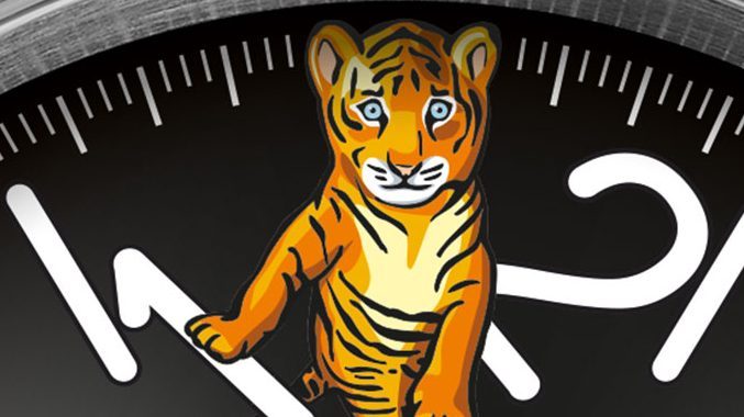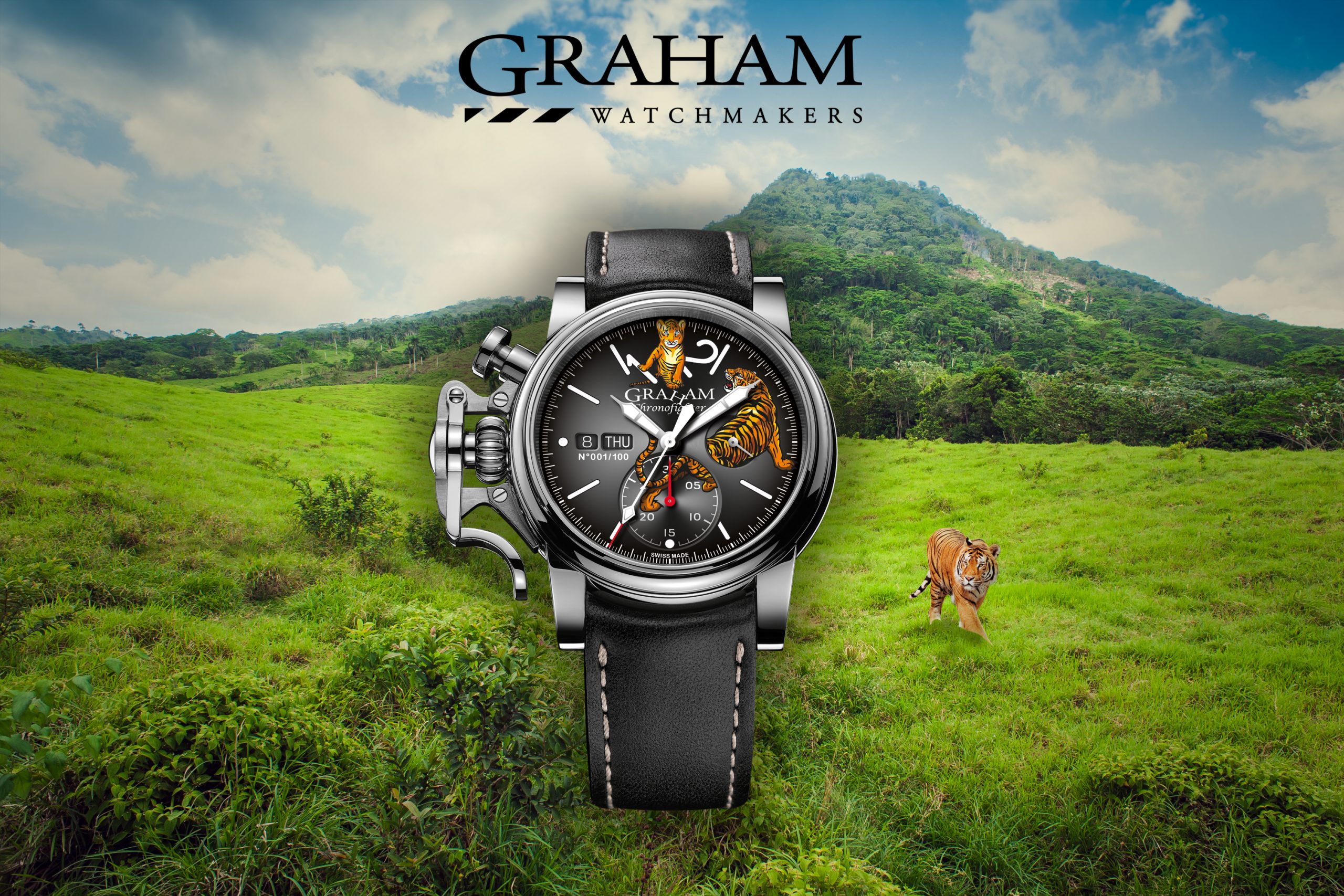 Wild care: vintage timepiece featuring the young tiger’s energy -mashing up the numerals, Graham and Chronofighterlogos – under the protective gaze of the big Bengal tiger. Acting with care does not prevent from having a daring attitude; there are two values going hand in hand