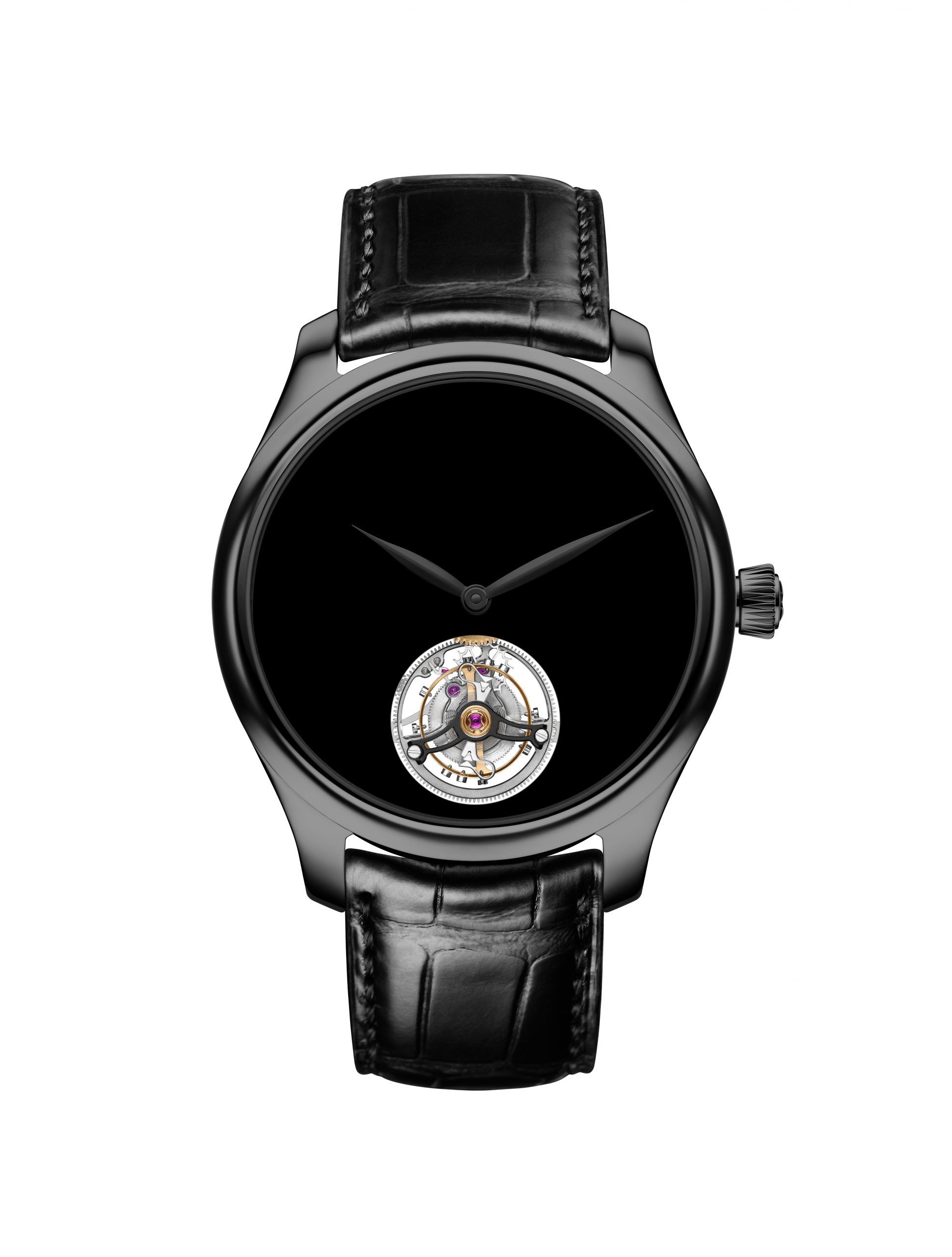 - One-minute flying tourbillon at 6 o’clock with skeletonised bridges coated in black PVD