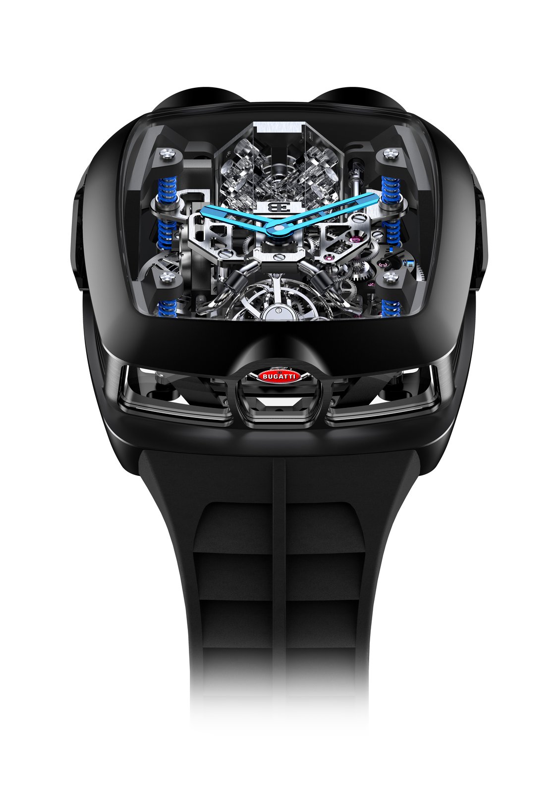 The entire watch is oriented to showcase the spectacular movement, facing it forwards so you can show your friends the 30º inclined tourbillon and the animation. The window to the tourbillon is modeled after the iconic horseshoe grill of Bugatti hypercars.