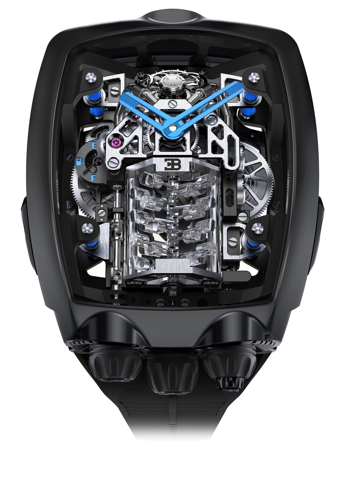 The movement is completely suspended in four places, with what looks like actual automobile shocks from the Chiron. The movement is, in fact, floating inside the case — you can see it move up and down inside. Framing the engine block are two “exhausts,” completing the engine theme of the design.