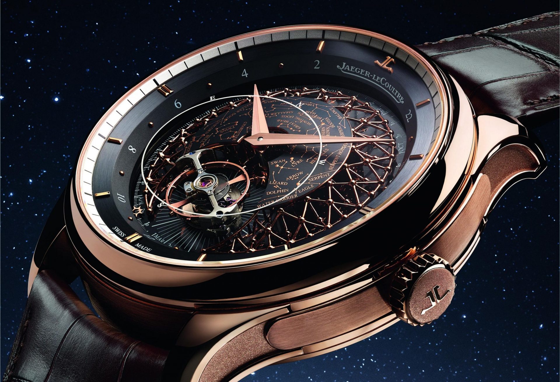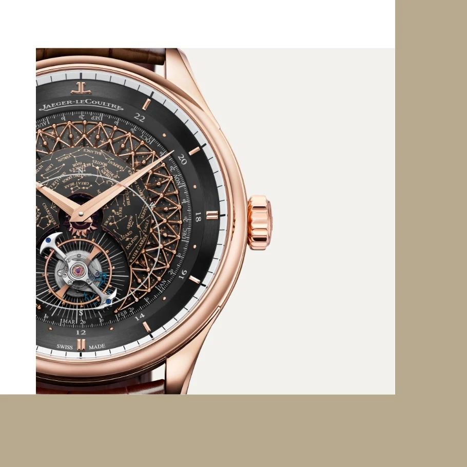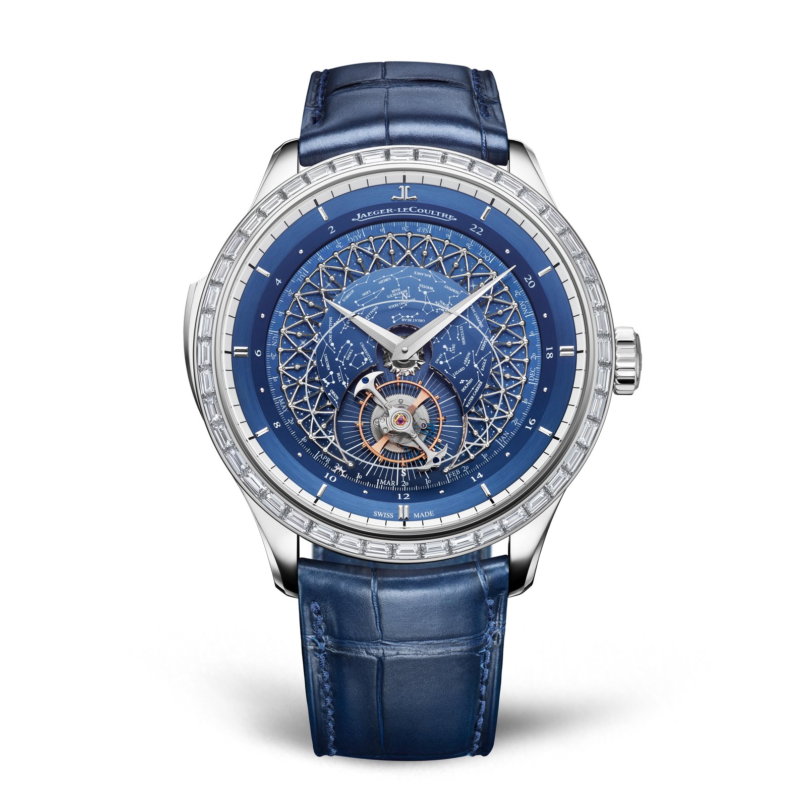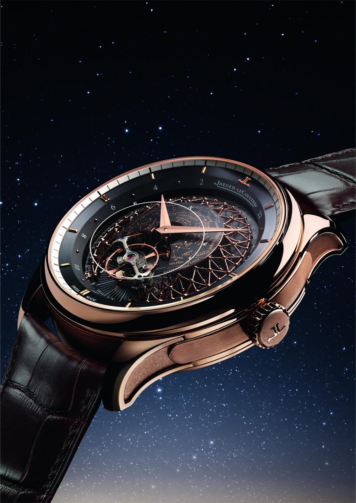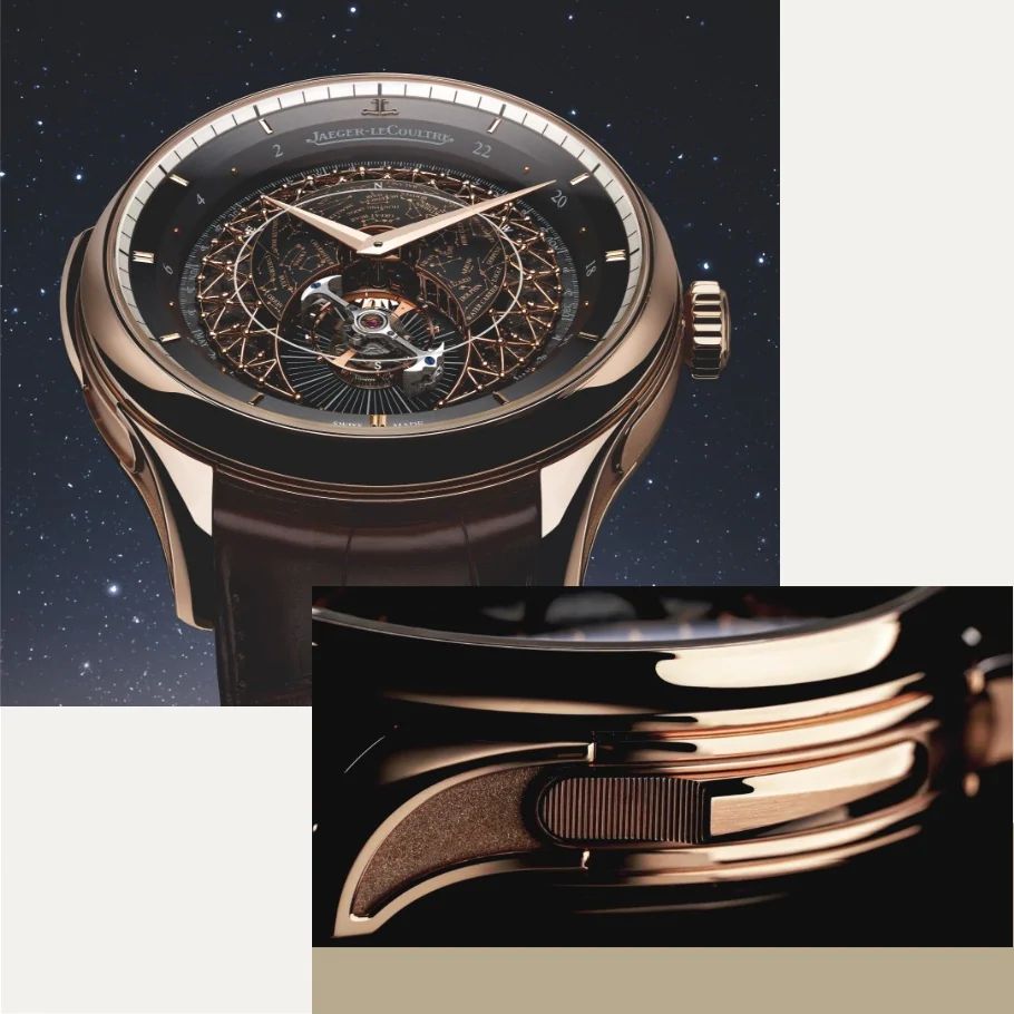 A multiple-level dial amplifies the beauty of the celestial theme while also showcasing the orbiting tourbillon. On the deepest level of the dial, a midnight blue or black disc (depending on the model) is decorated with tiny stars. Above it, a delicate filigree forms a dome, its structure echoing the pattern of the constellations marked on the convex celestial disc. The star chart depicts the Northern Hemisphere night sky, as seen from the 46th parallel – the latitude of Jaeger-LeCoultre’s home in the Vallée de Joux.