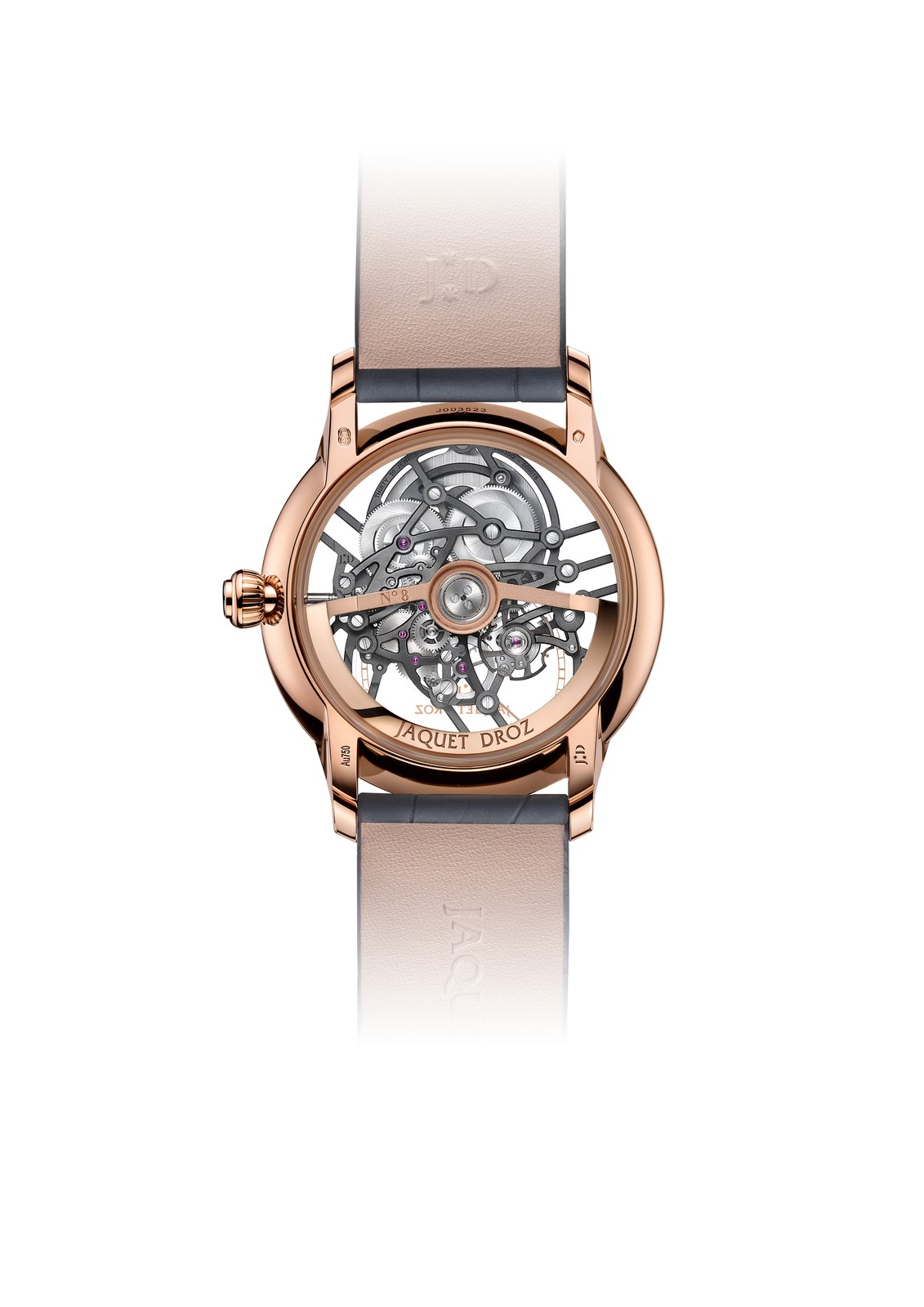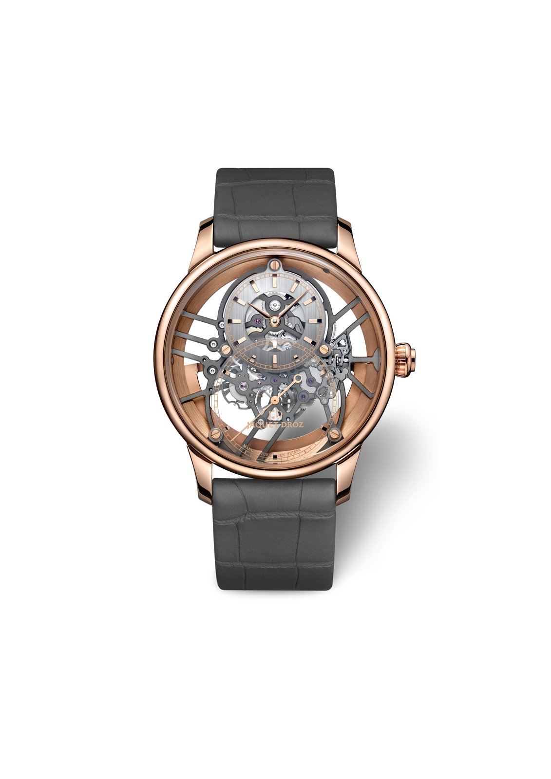 The traditional model features a case made of red gold, a gold alloy that Jaquet Droz admires for its subtle accents of warm coppery tones. Worn on a leather strap with a novel rubber-like finish, it supplements the watchmaker’s semi-matt alligator straps. It perfectly matches the grey of the bridges suspending the Grande Seconde’s delicate movement. Inside the 41 mm case lies the airy workings of this exclusive Jaquet Droz calibre where every component is meticulously stripped down to its minimum point of resistance. The fully suspended gear train is attached to the movement’s skeletonized bridges raised by an openworked oscillating weight that lets light shine clearly through.