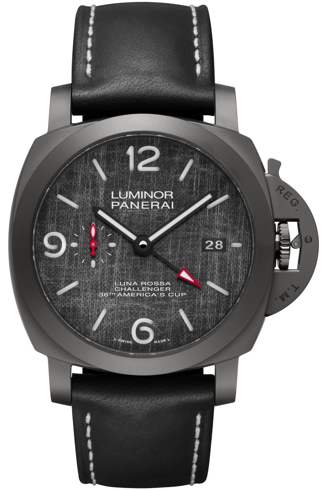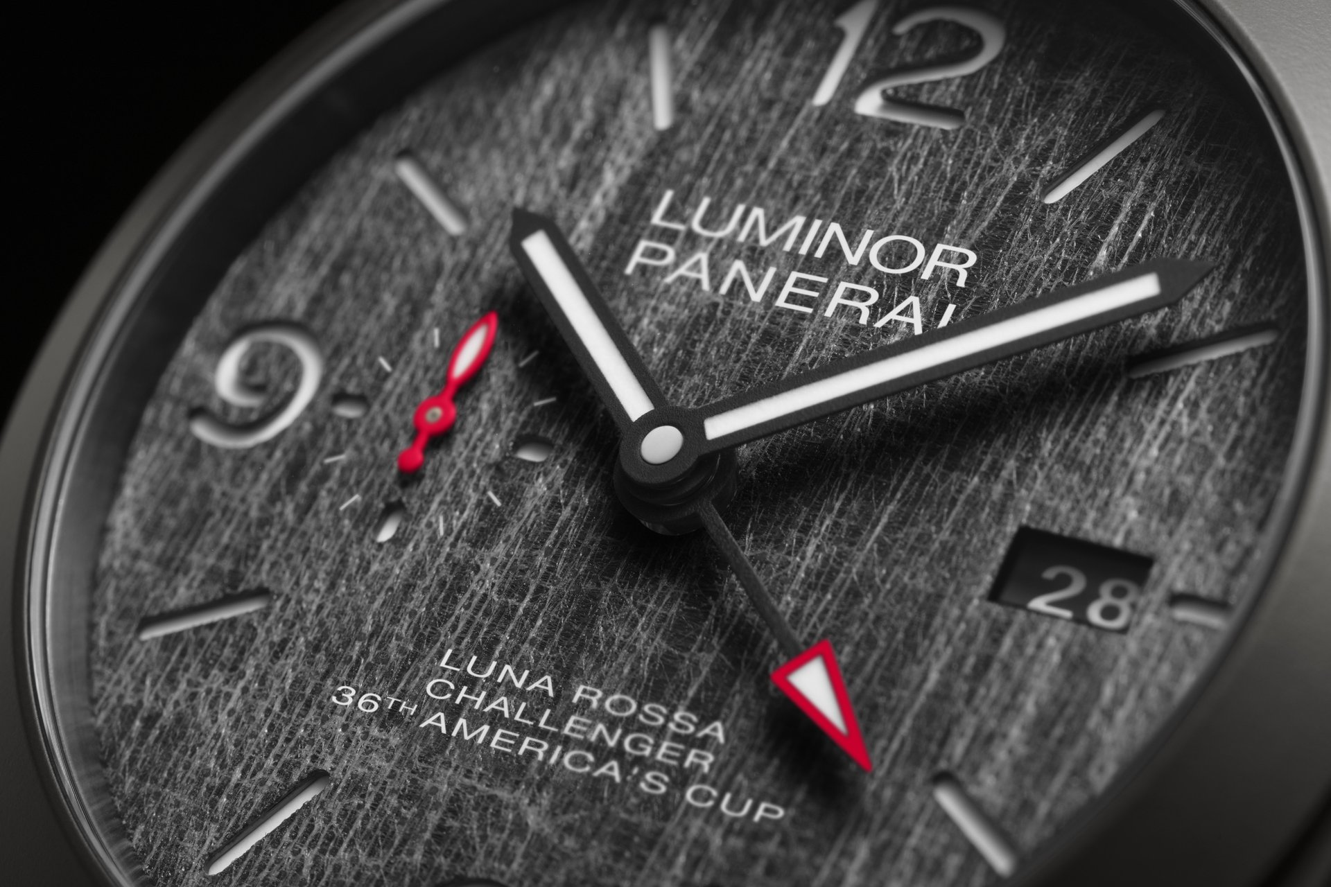 Panerai presents a new offering with dual time zone function strongly inspired by the Challenger of Record of the 36th America’s Cup, an authentic synthesis of Italian spirit and invention, the Panerai Luminor Luna Rossa GMT – 44 mm PAM01036.