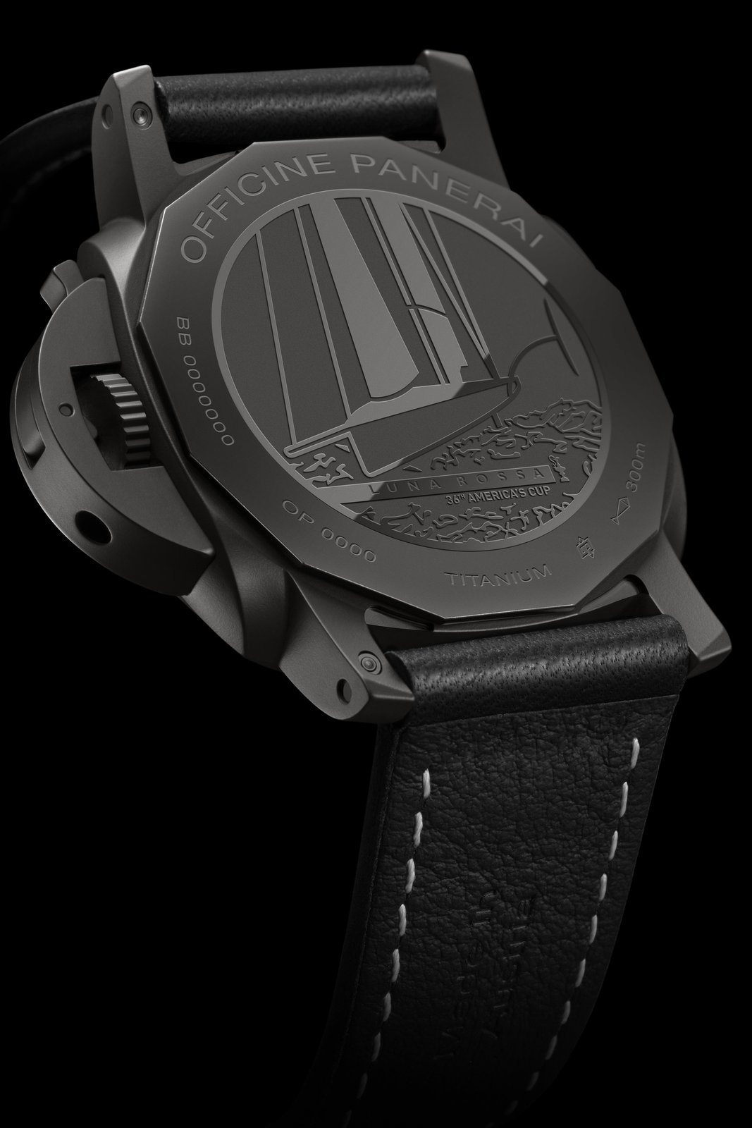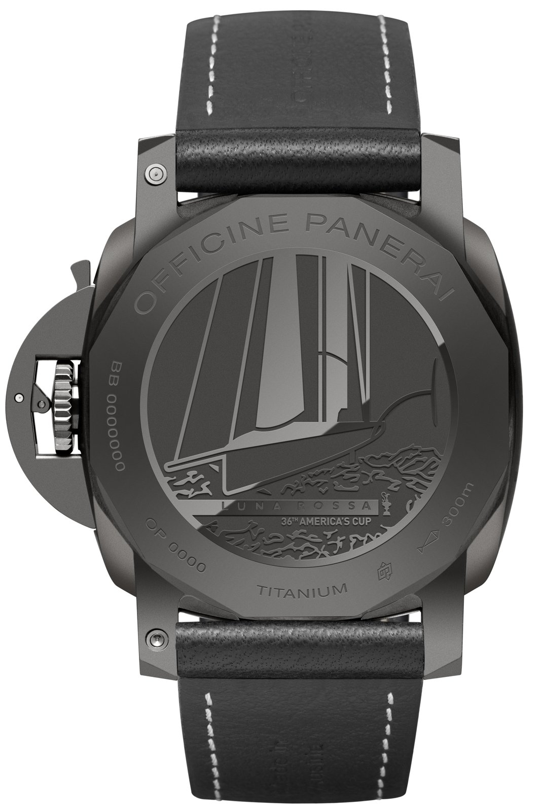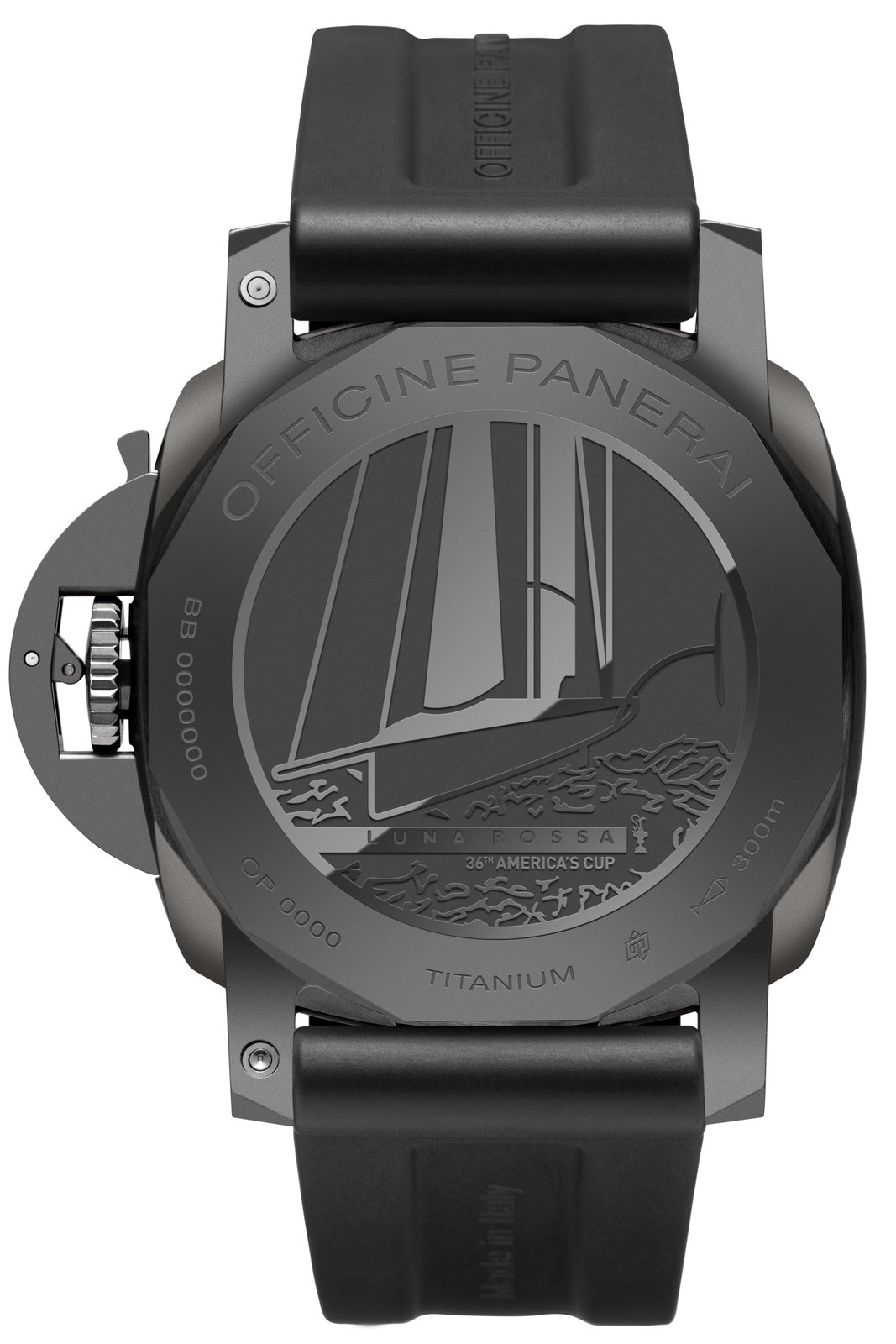 - Screwed dodecagonal case back, in titanium with black DLC coating, with Luna Rossa logo, Luna Rossa AC75 monohull and engraving of the America’s Cup trophy.