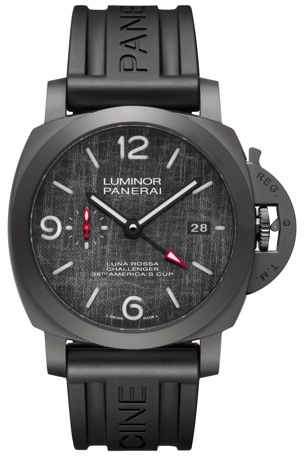Water-resistant up to 30 bar (about 300 meters deep), the new Luminor Luna Rossa GMT – 44 mm is equipped with a Ponte Vecchio calfskin strap in black with white stitching. An additional black rubber strap is included, along with a box wrapped in technical sail fabric and personalized with the Panerai and Luna Rossa logos. Also enclosed is a certificate attesting to the authenticity of the technical material from Luna Rossa that composes the coating of the dial.
