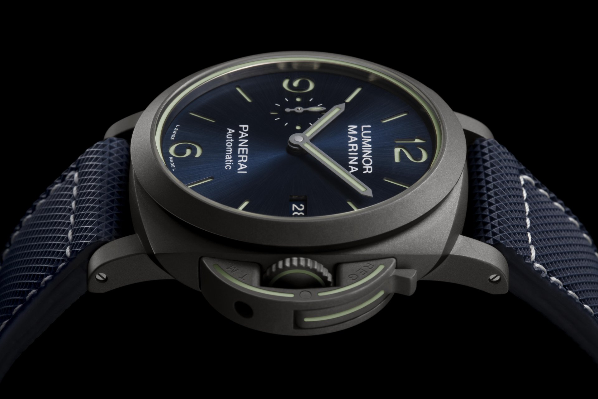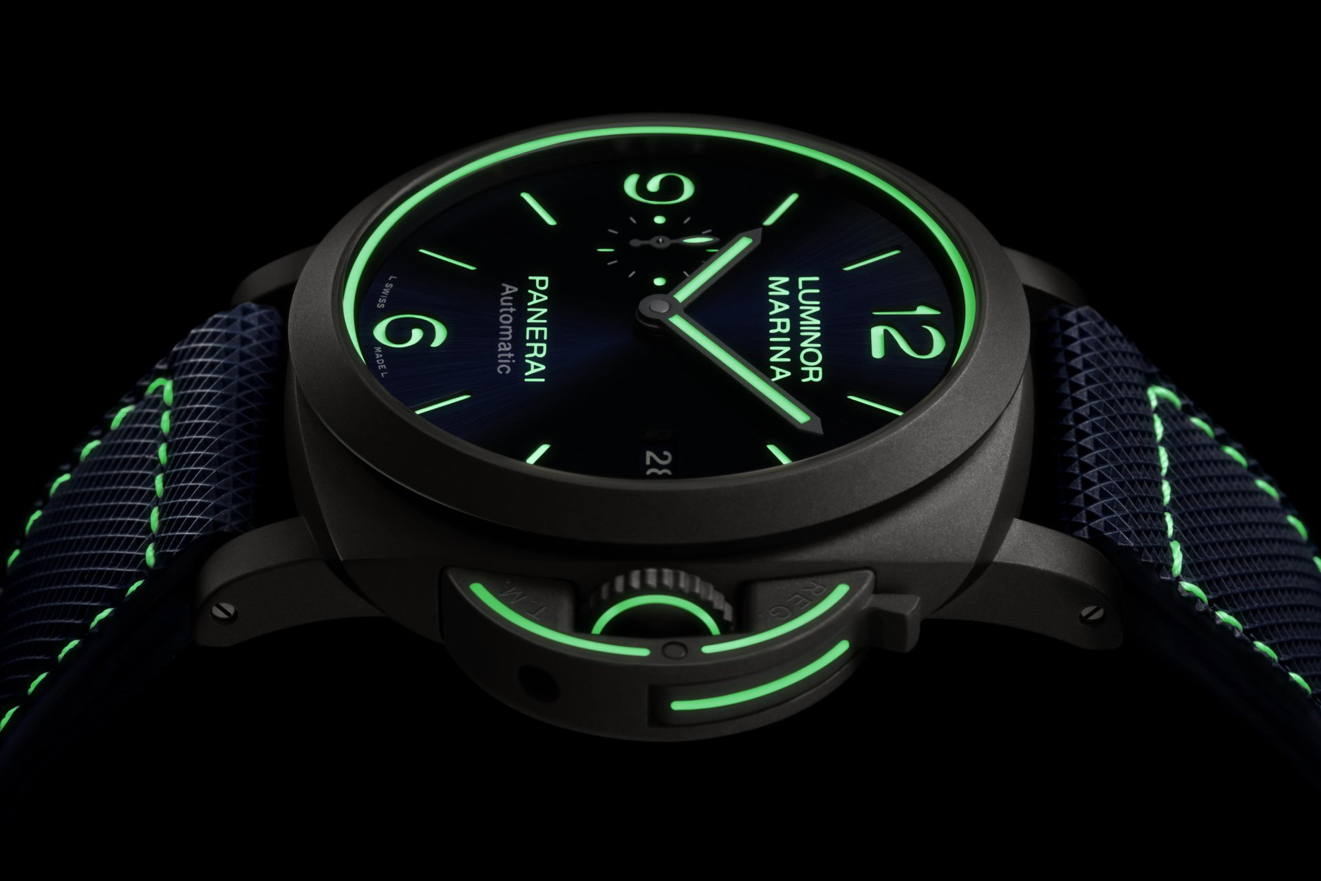 Emerging from the darkness the decal on the dial, the rehaut and for the first time also new components like the stitchings on the strap, the crown, the crown protecting bridge and its lever. Iconic elements of the luminor case highlighted by an advanced Super-LumiNovaTM X1 which provides a higher degree of luminosity as well as persisting longer.